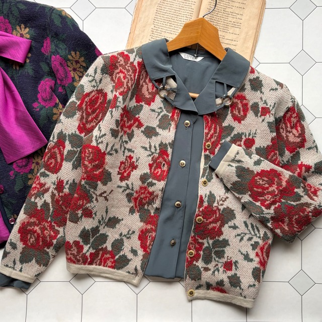 Rose Jacquard Knit Cardigan〈レトロ古着 薔薇柄 ジャガード ニット カーディガン ジャパンヴィンテージ〉