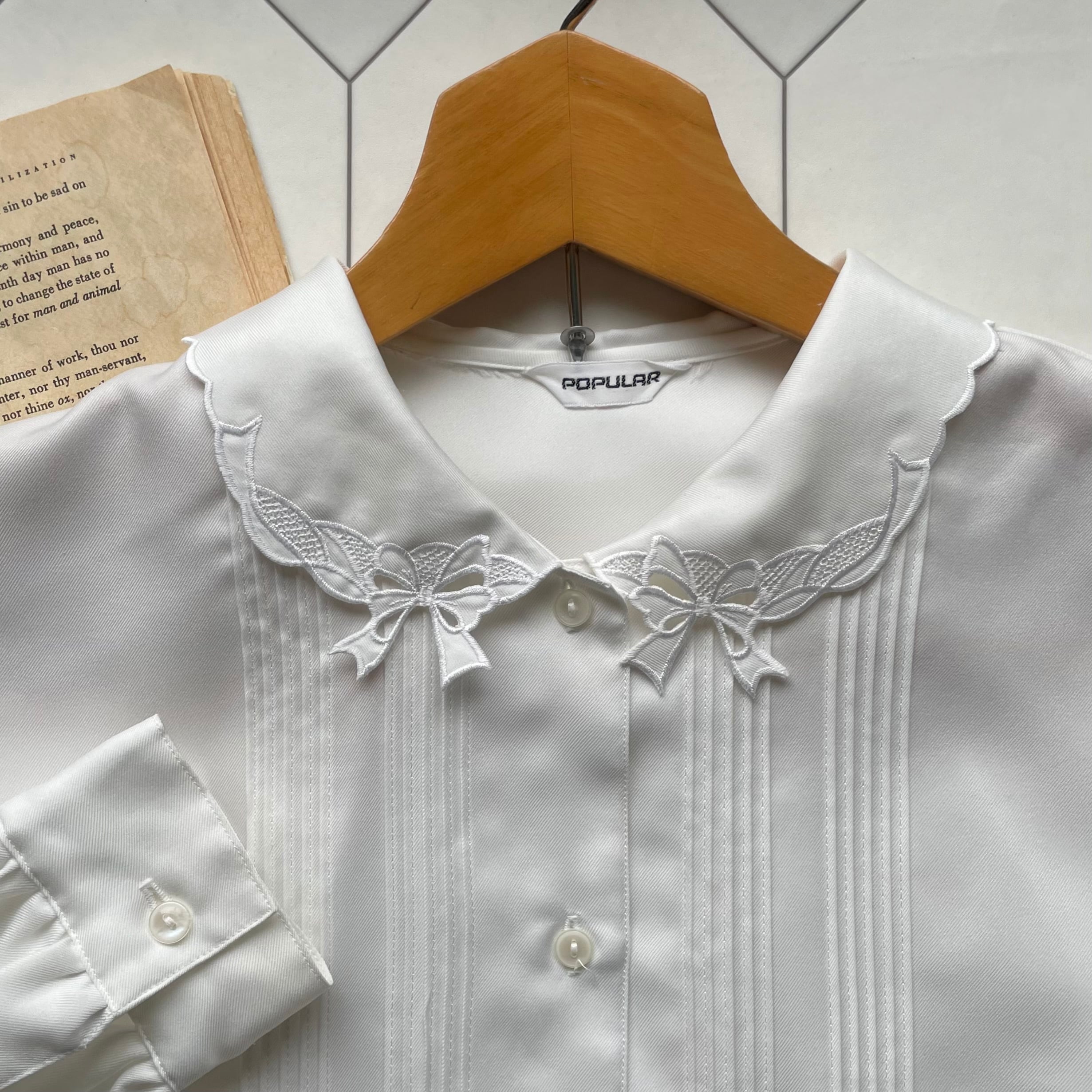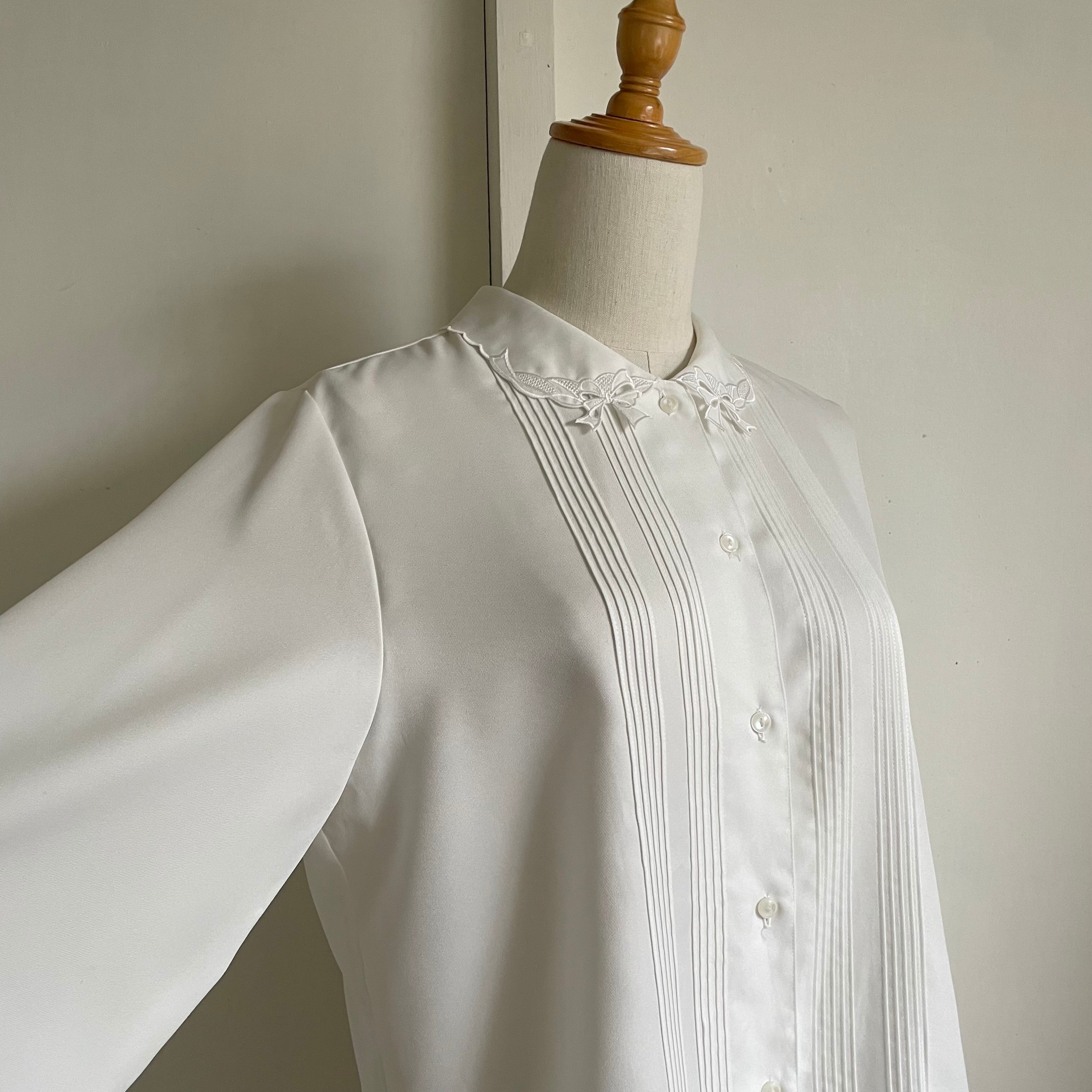 ribbon cutwork embroidered pintuck blouse 〈レトロ古着 リボン カットワーク刺繍 ピンタック ブラウス 白 日本製 ジャパンヴィンテージ〉