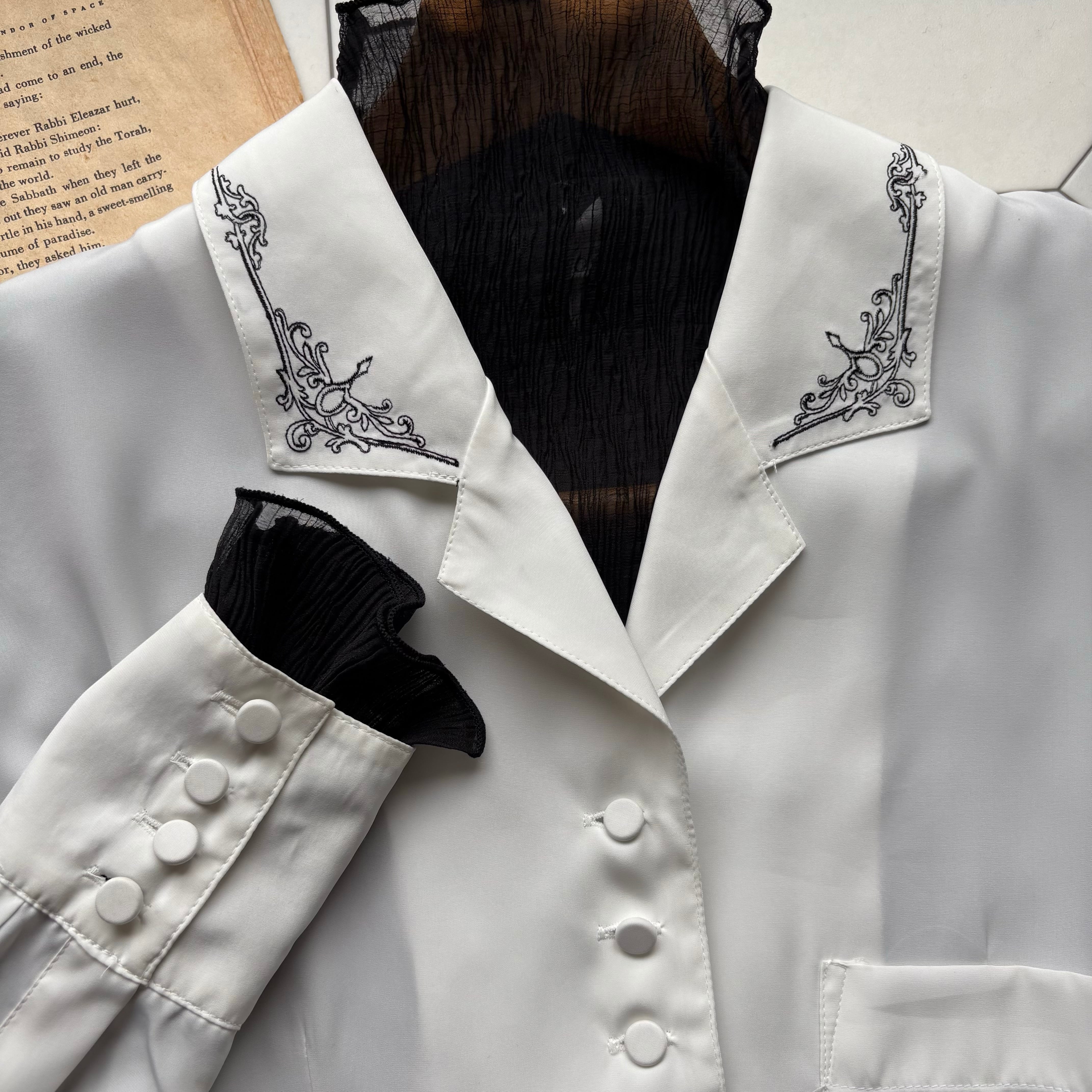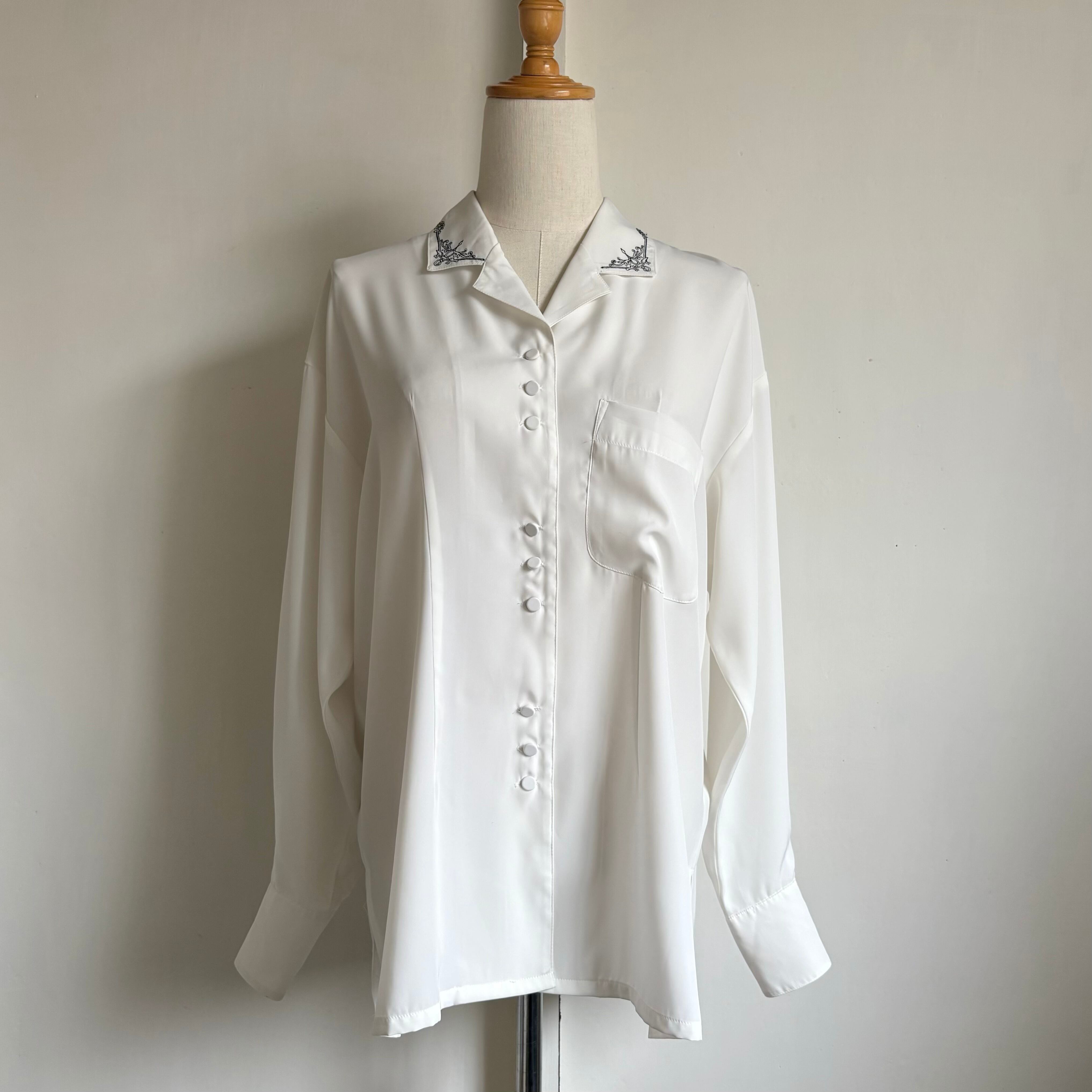 黒糸の繊細な線で描かれた刺繍がポイントの開襟シャツ