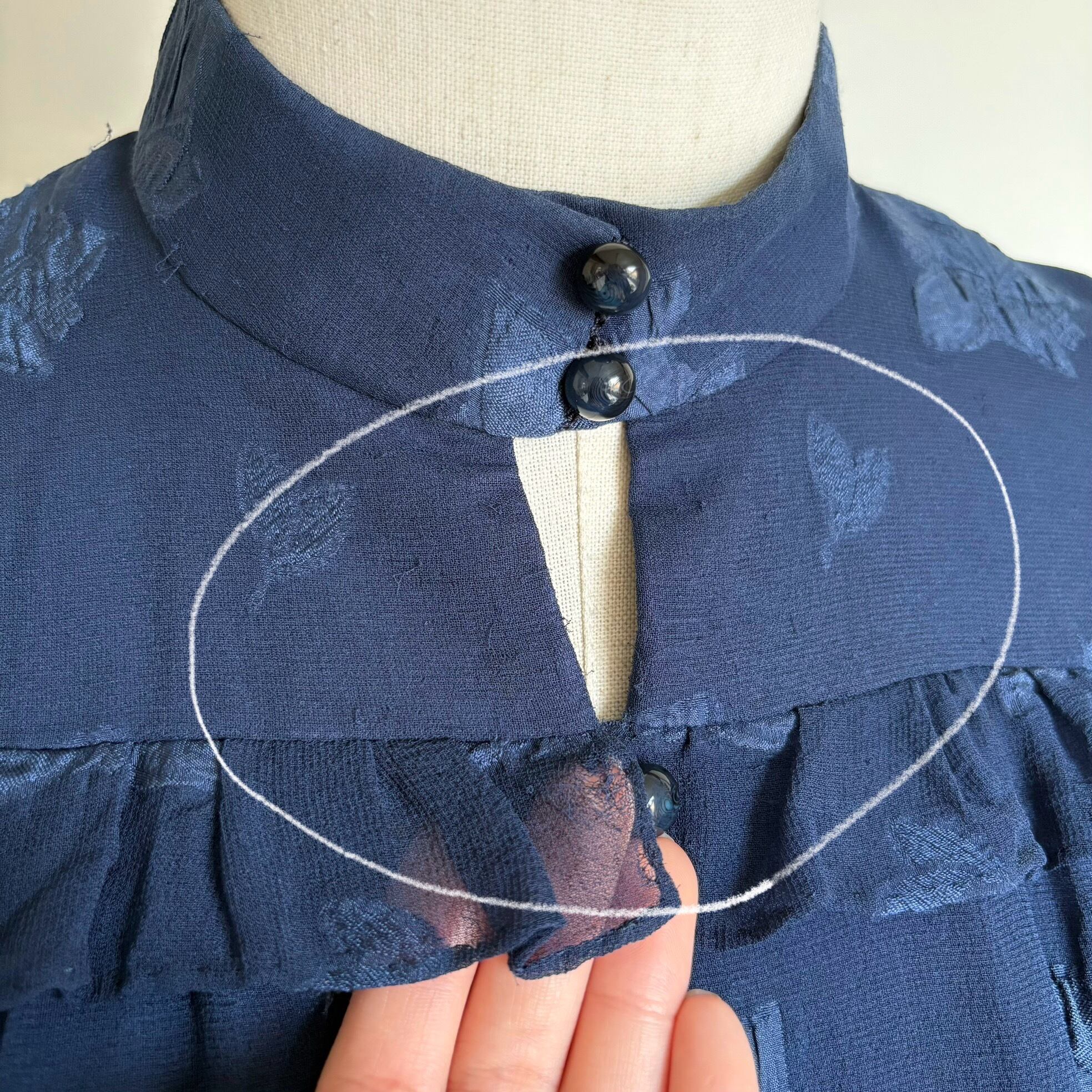 スタンドカラーできちんと感はありつつデコルテのくり抜き風デザインがさりげない遊び心