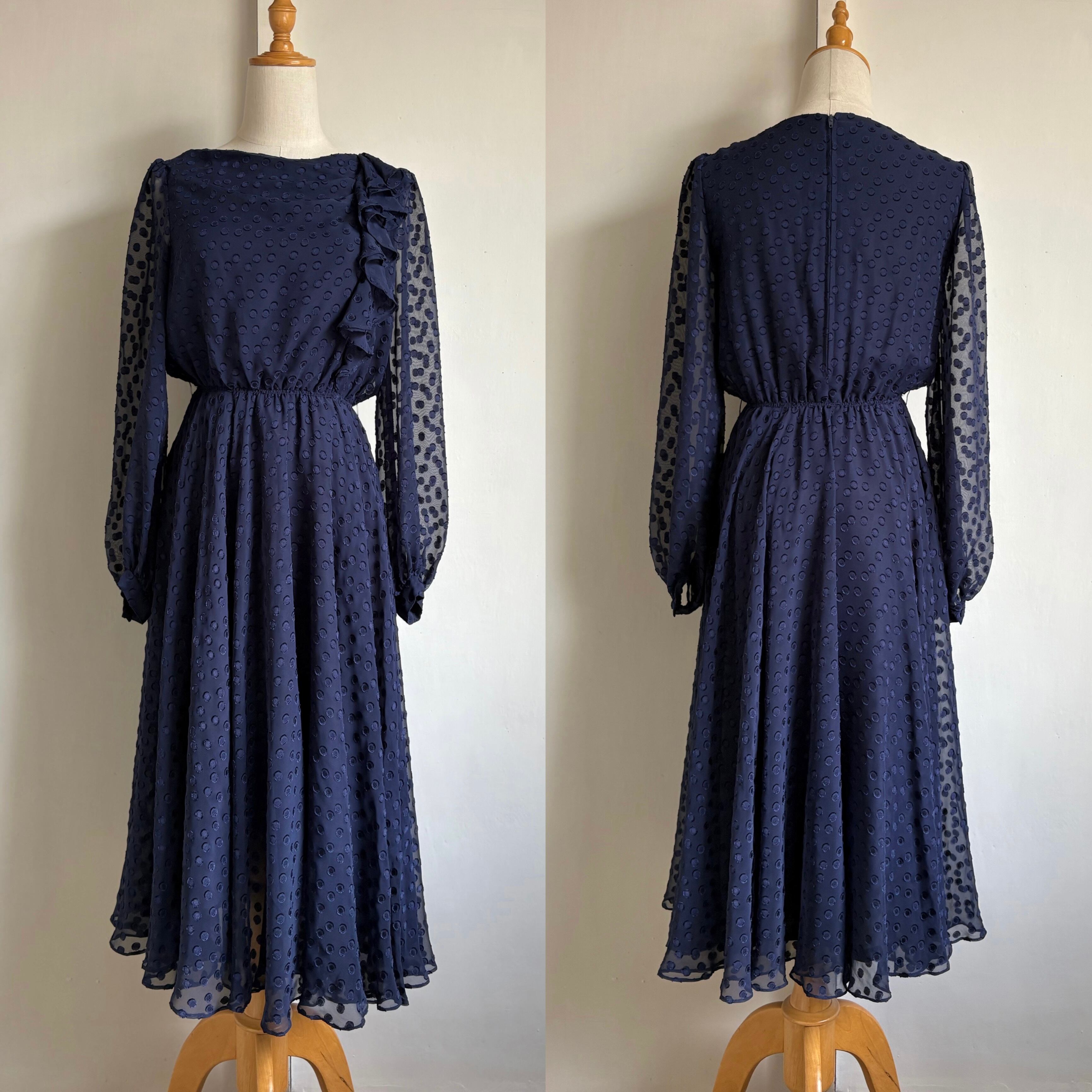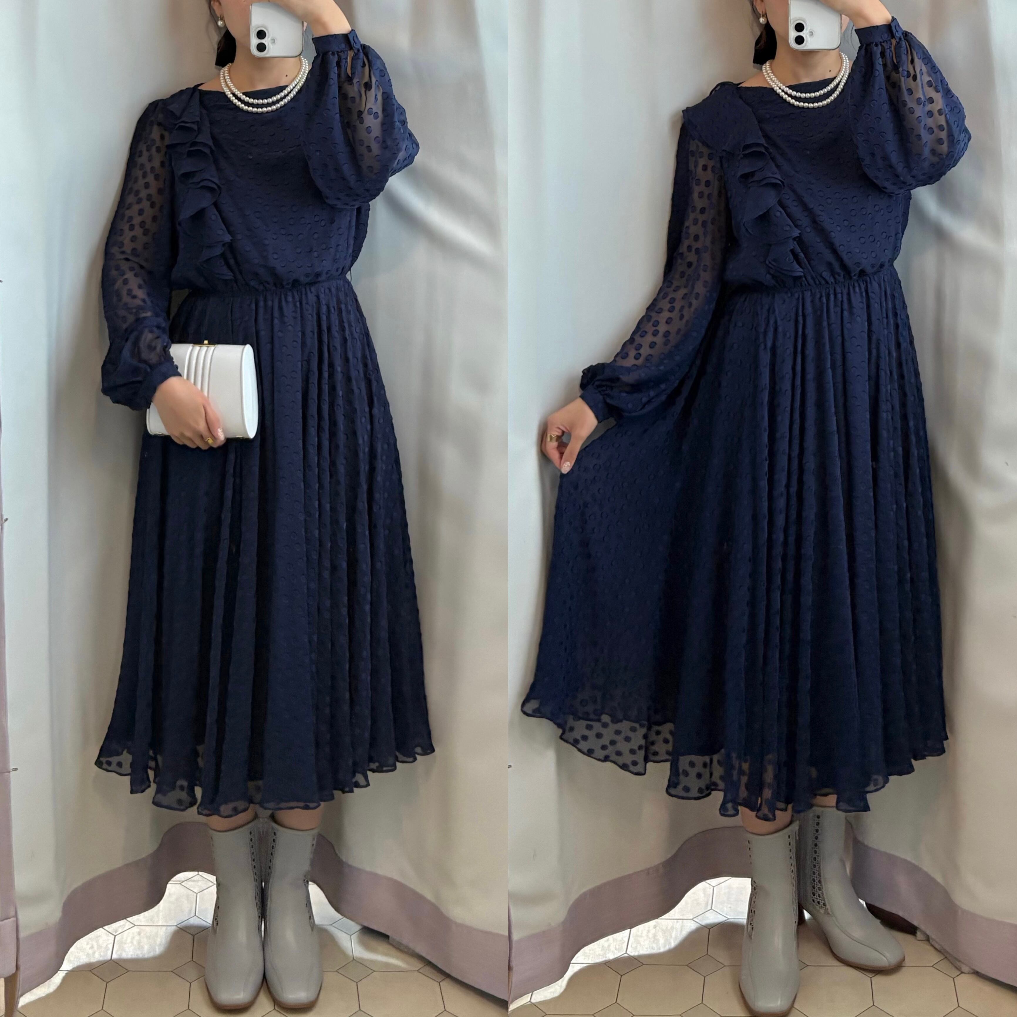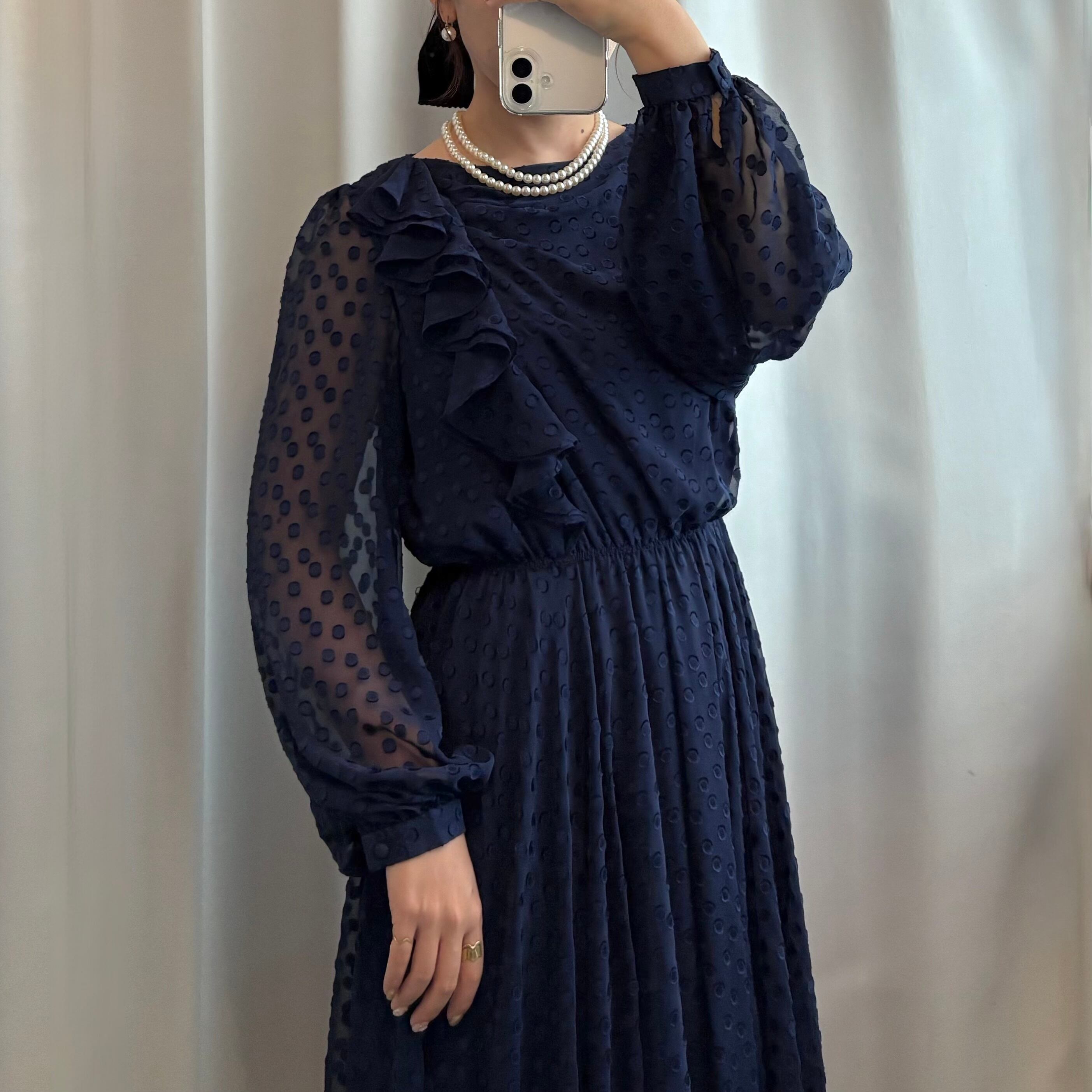 Sheer-Sleeve Dot Jacquard Dress〈レトロ古着 シアー袖 ドットジャガード ワンピース ジャパンヴィンテージ Japan Vintage〉