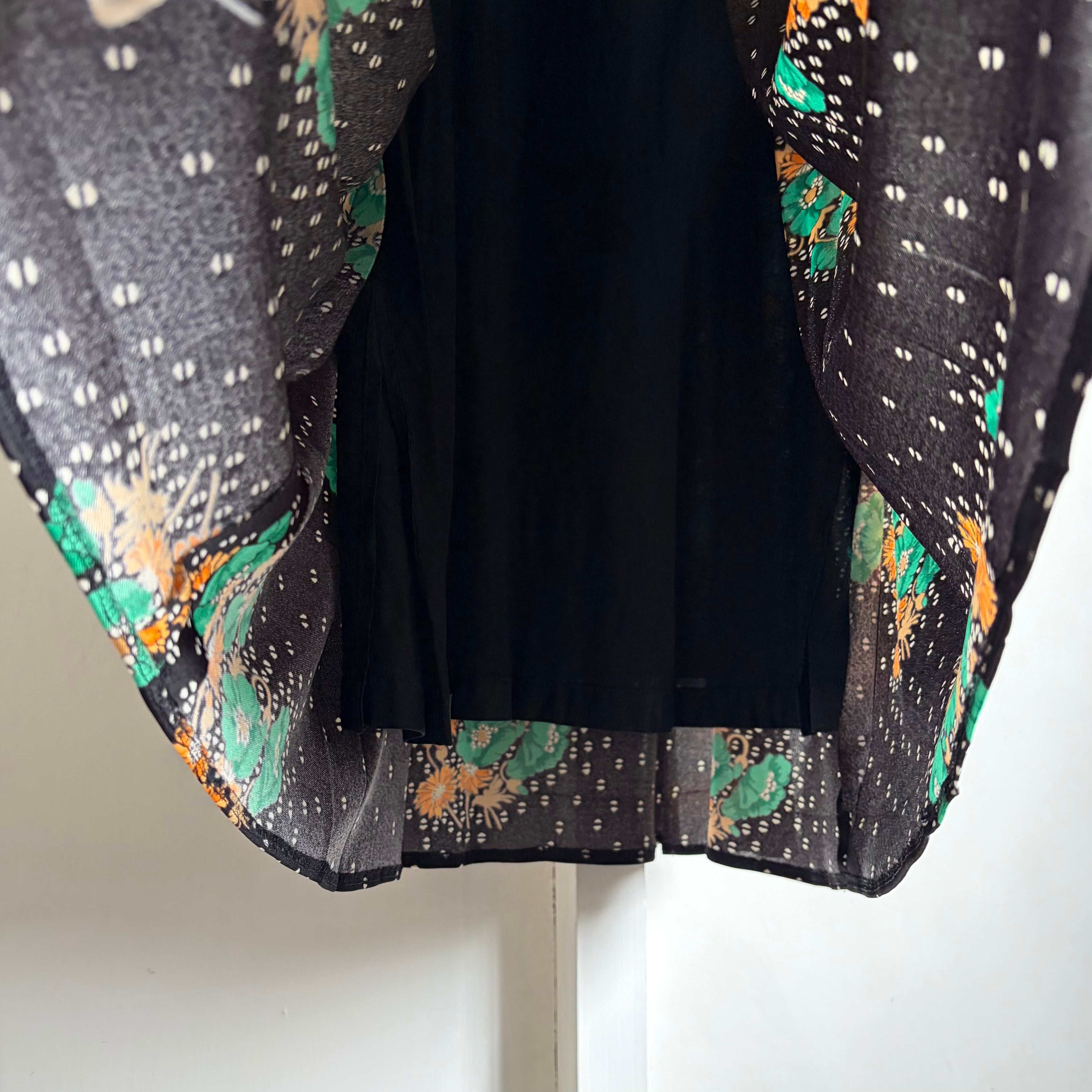 こちらは鮮やかなグリーンとオレンジの大胆な花々が目を惹く一着