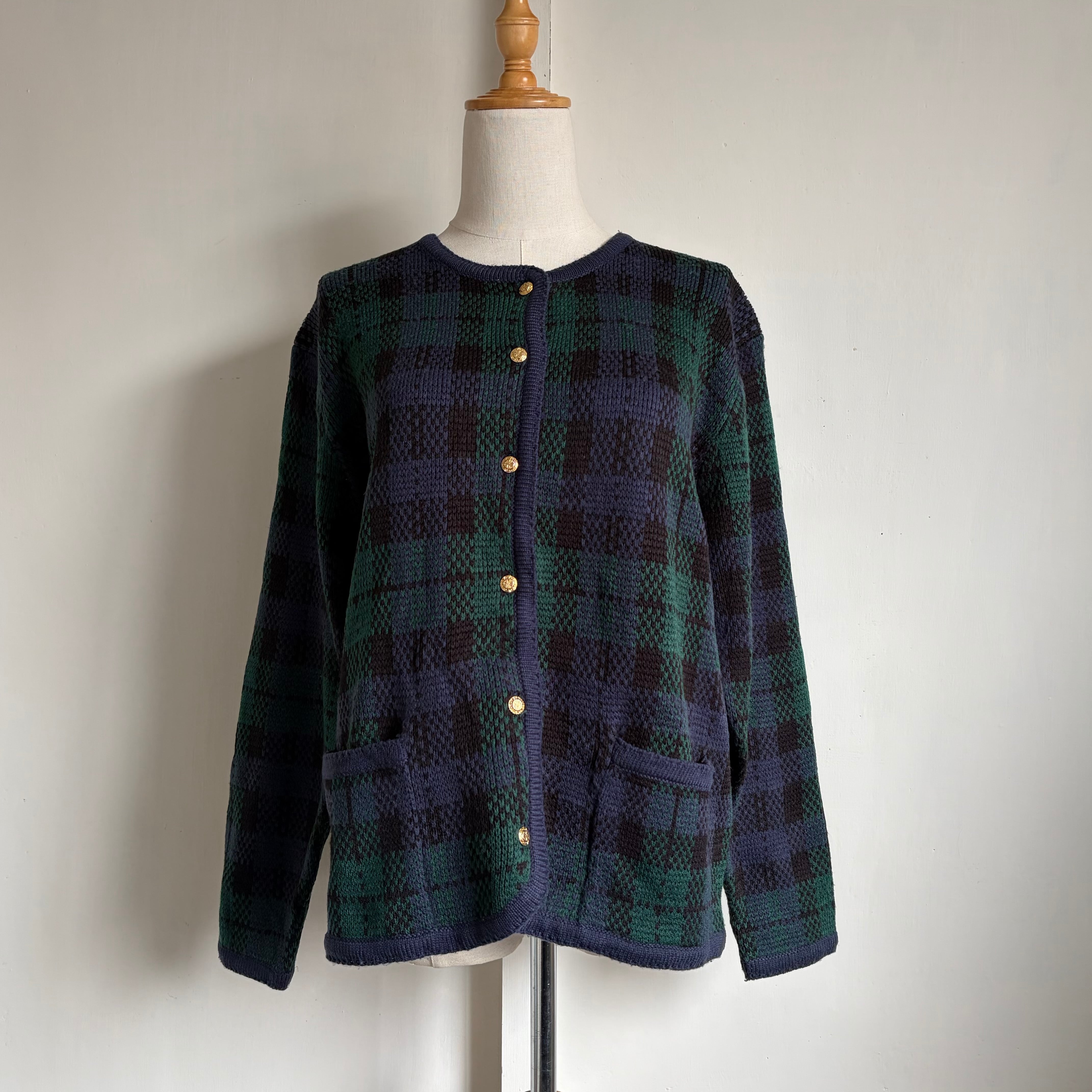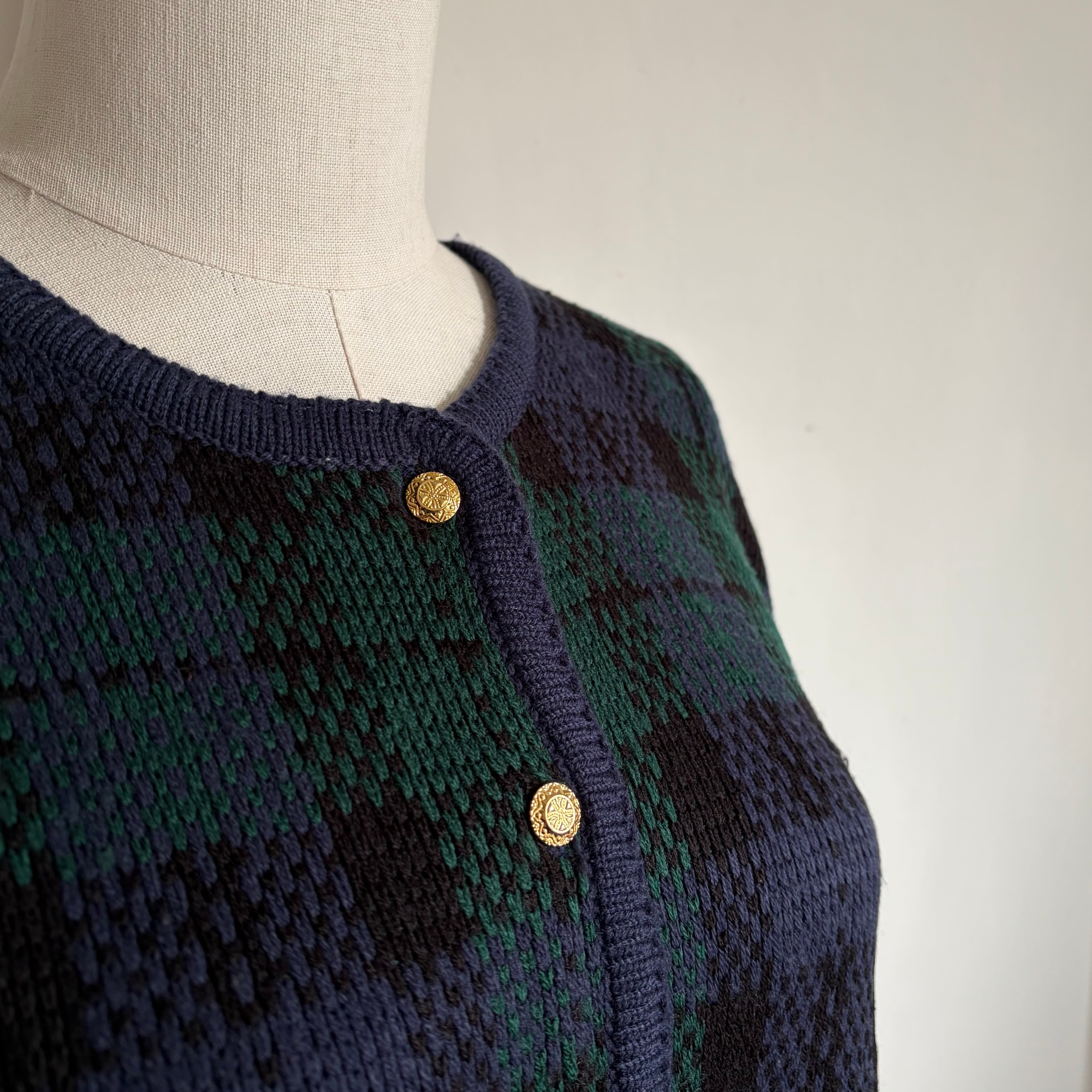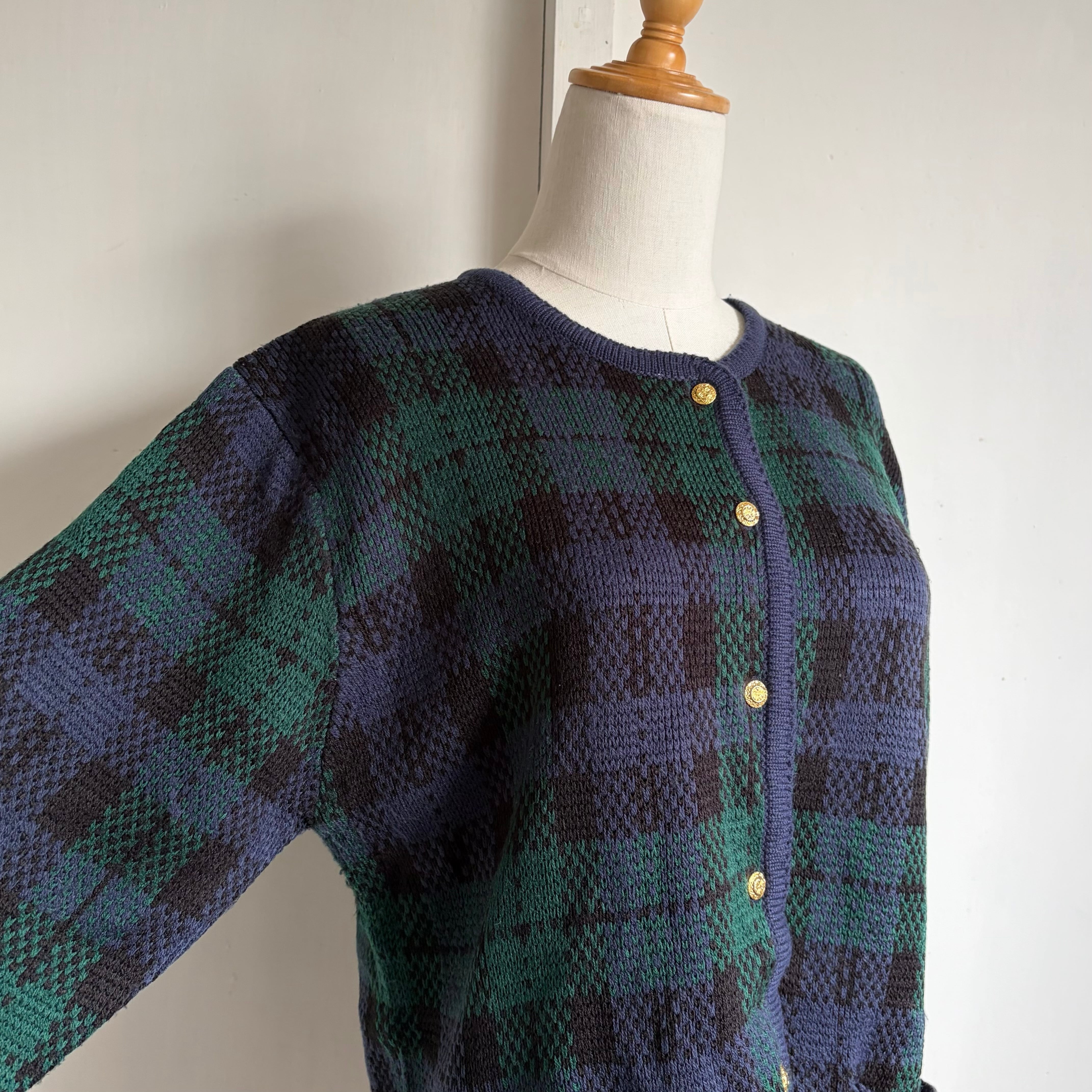 ネイビーとグリーン基調としたタータンチェック柄のカーディガン