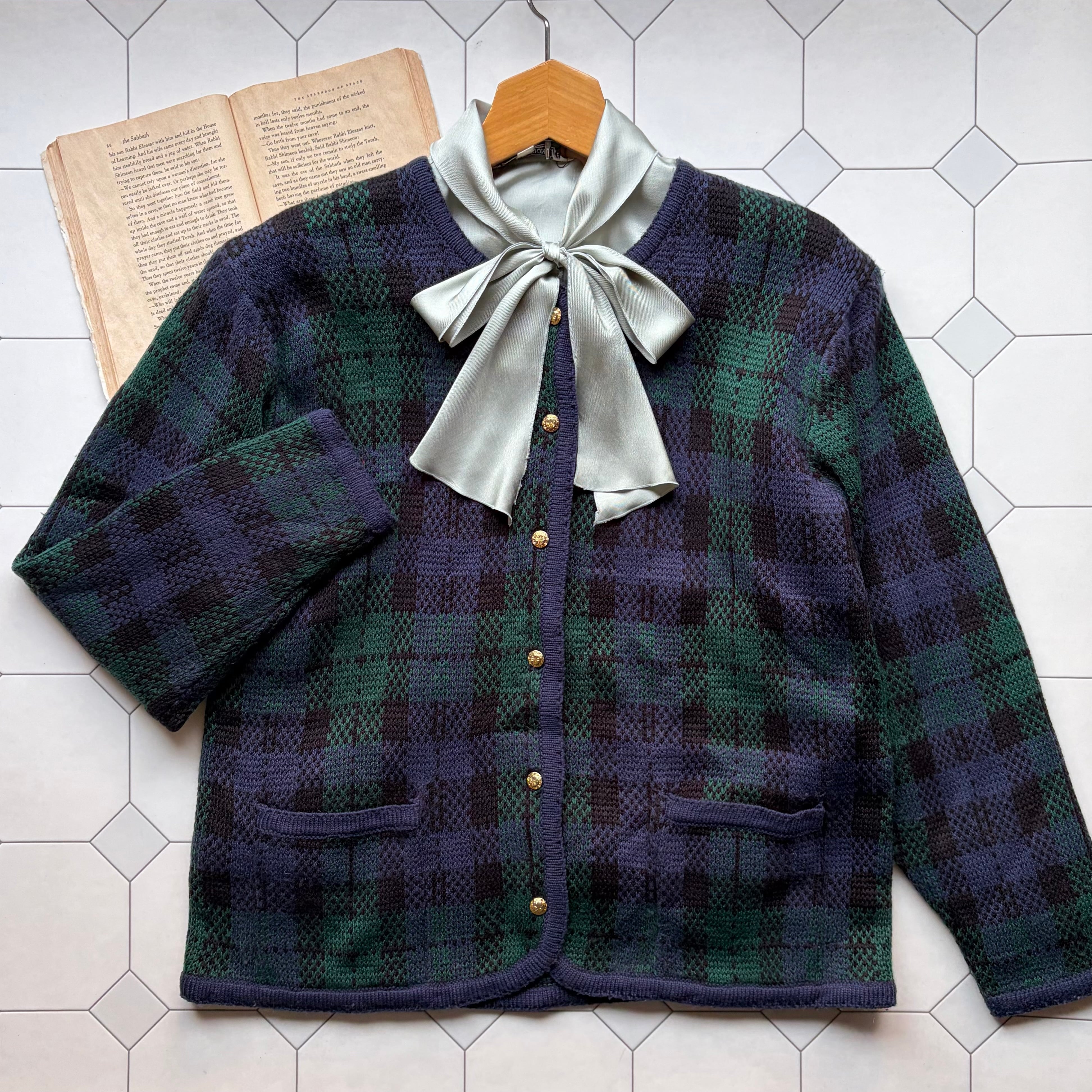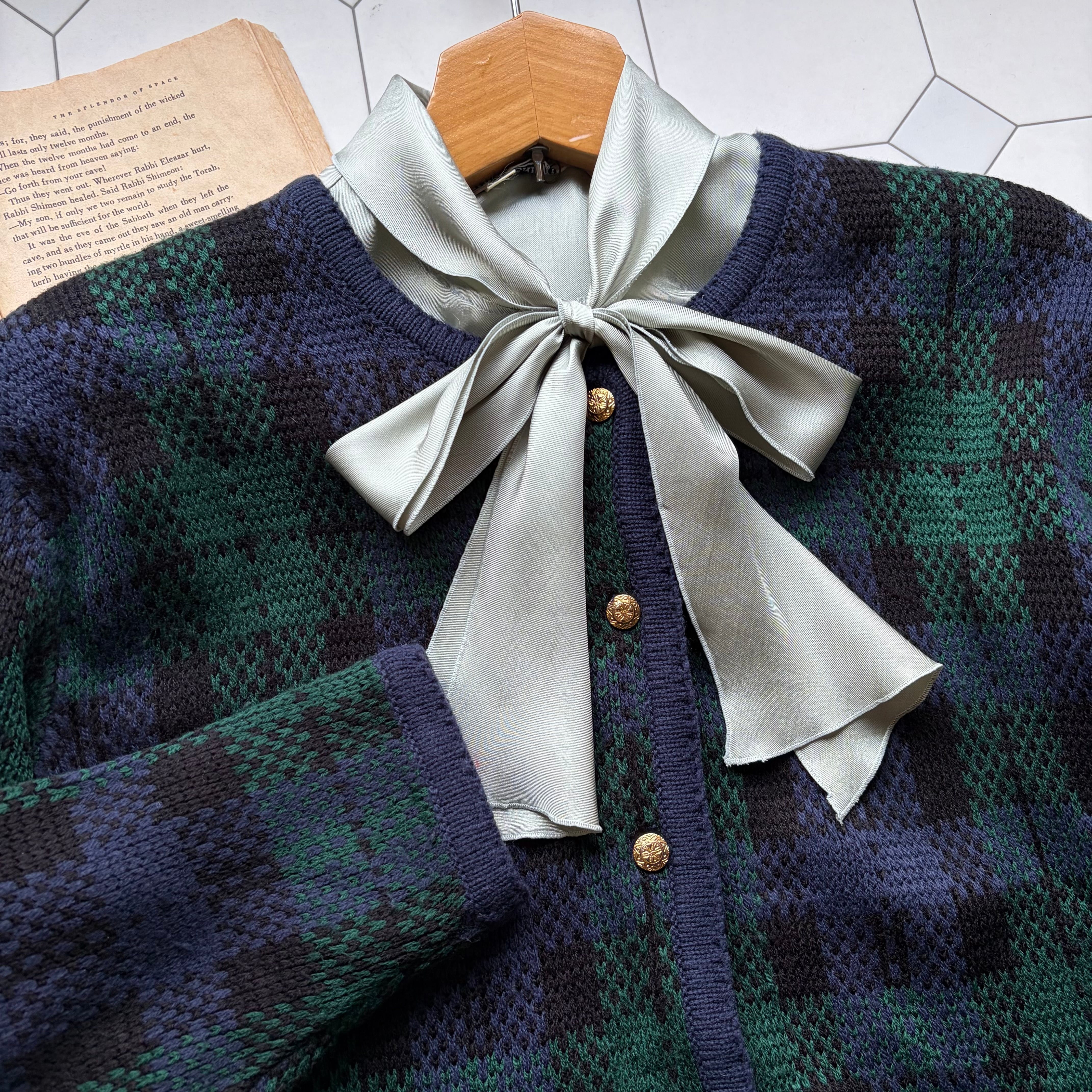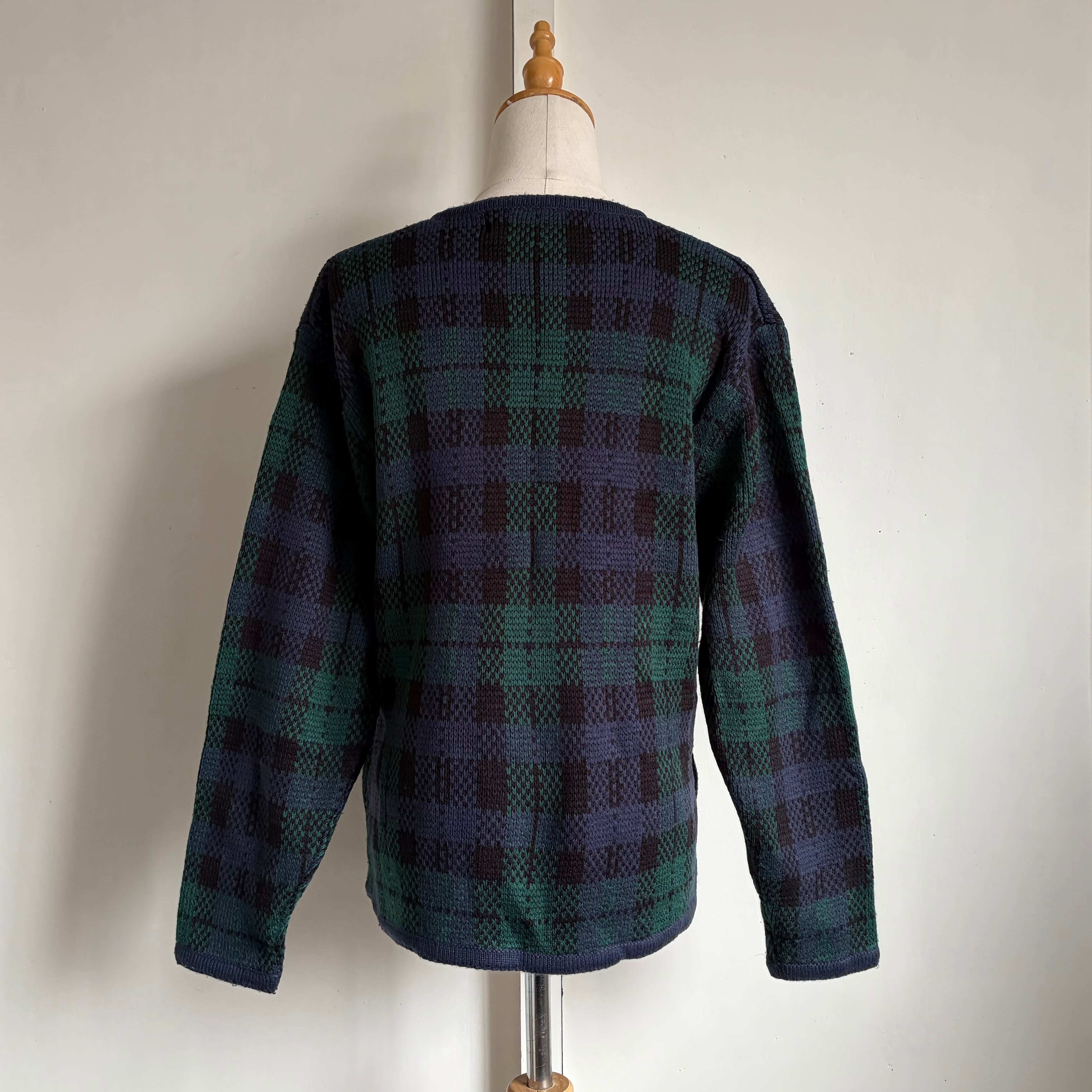 ネイビーとグリーン基調としたタータンチェック柄のカーディガン