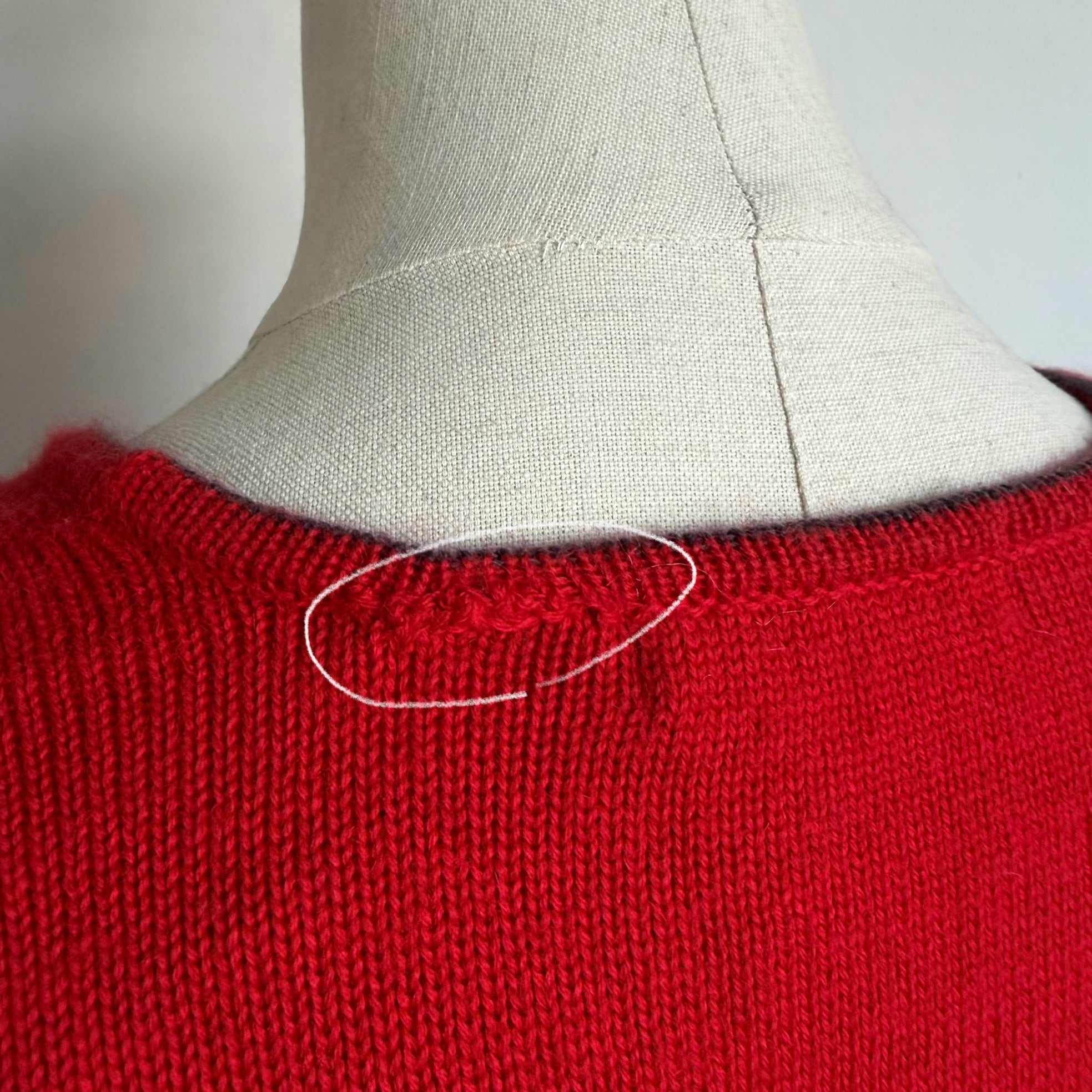 やや朱色がかった鮮やかな赤色が目を惹くニット