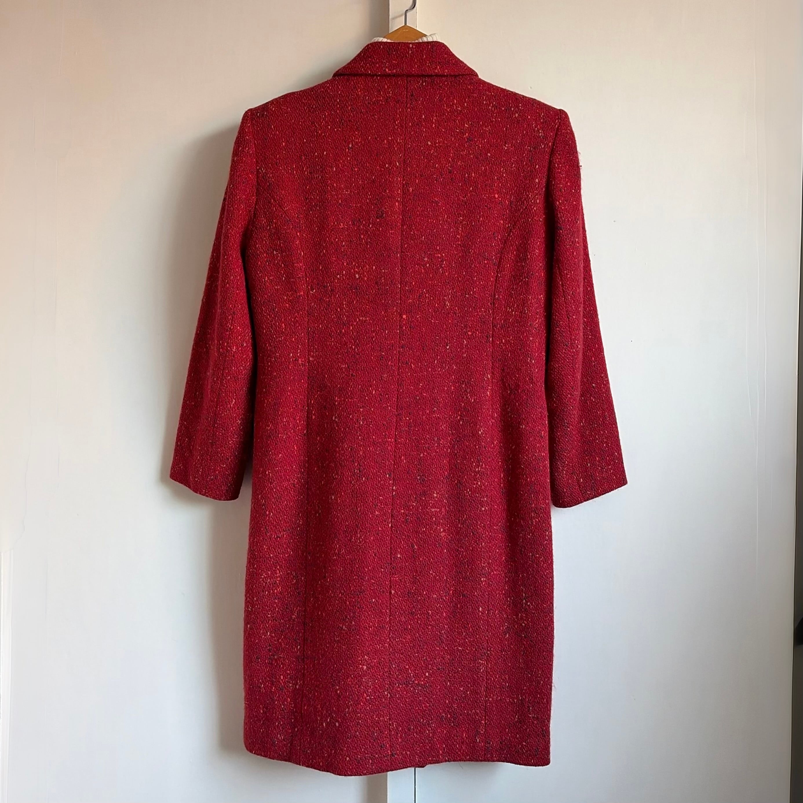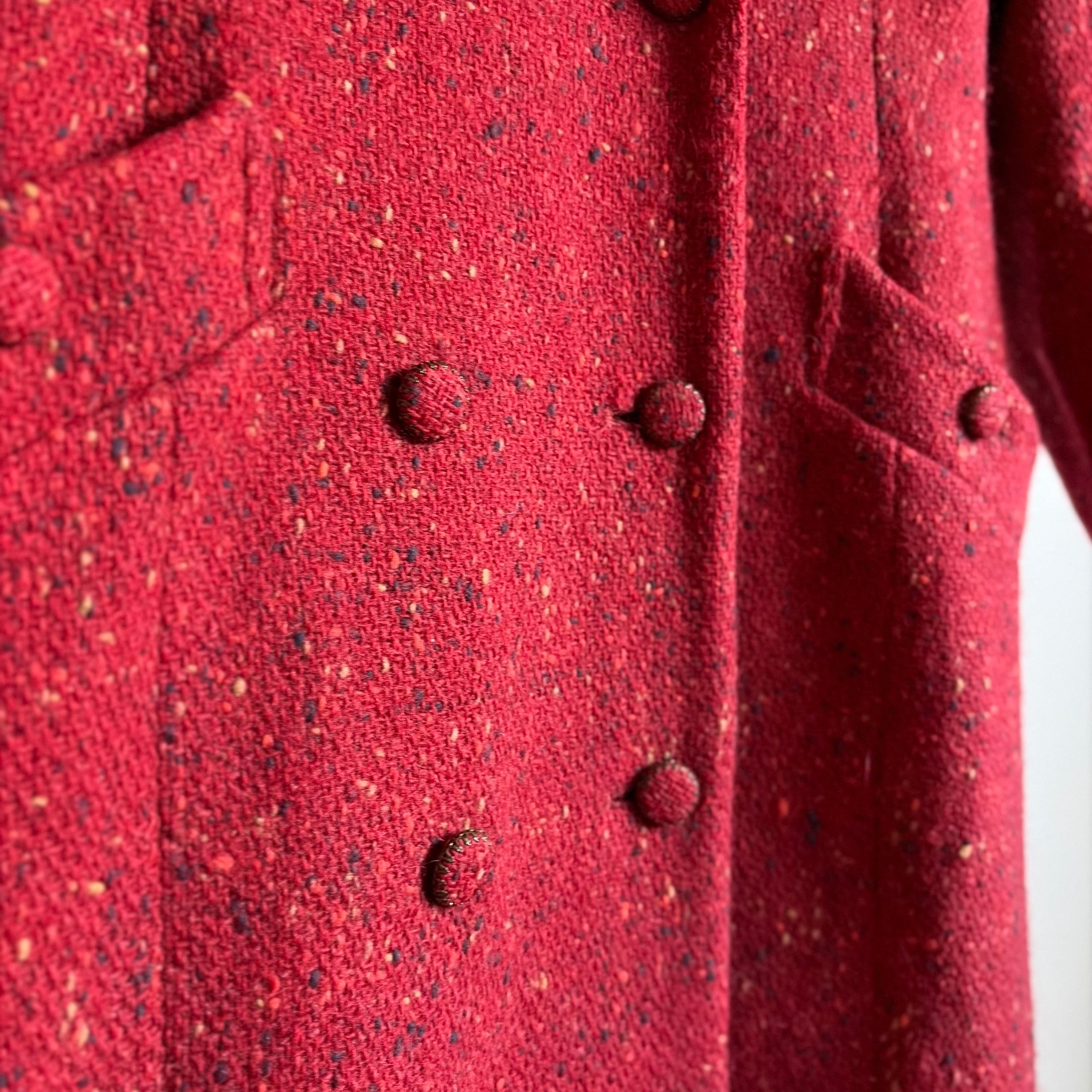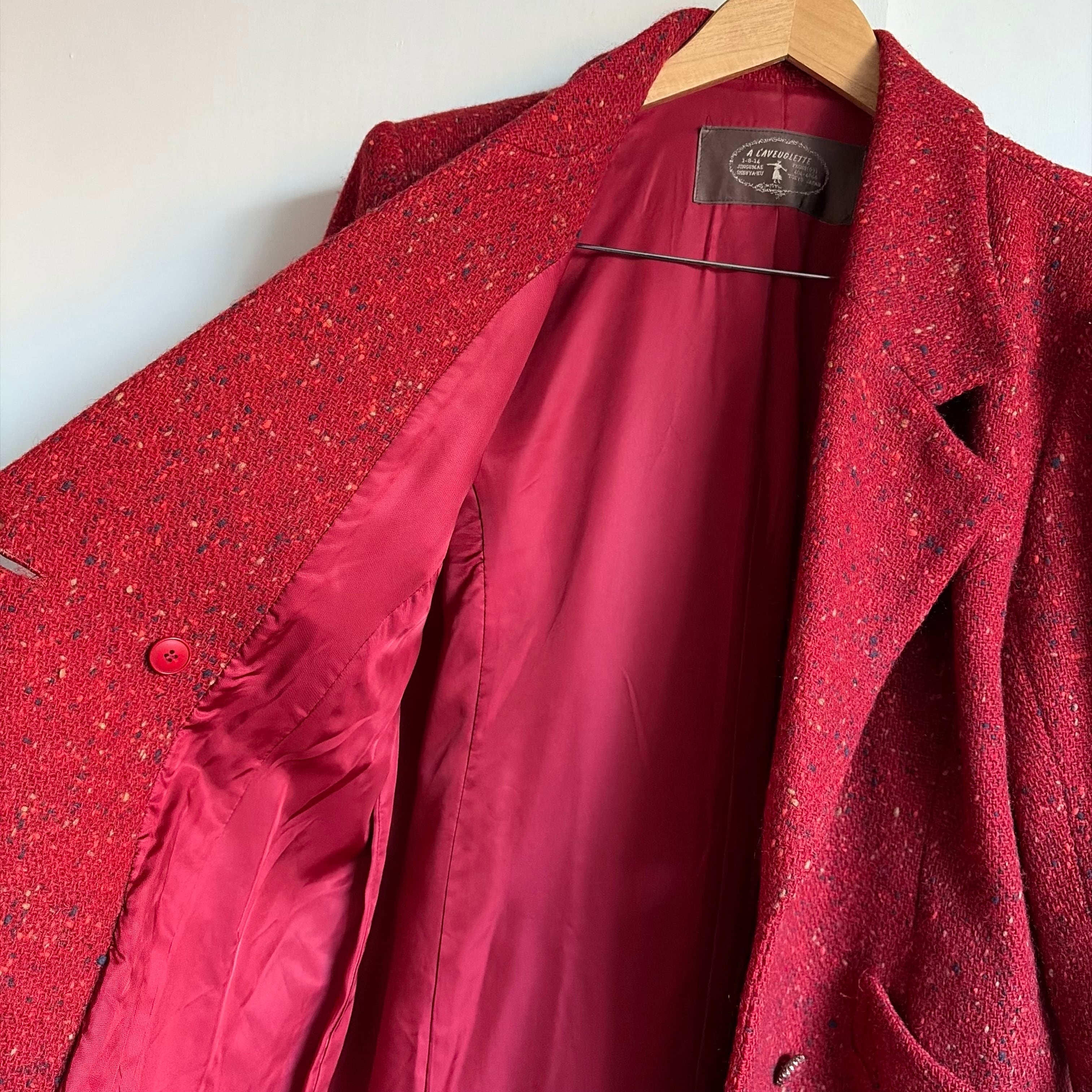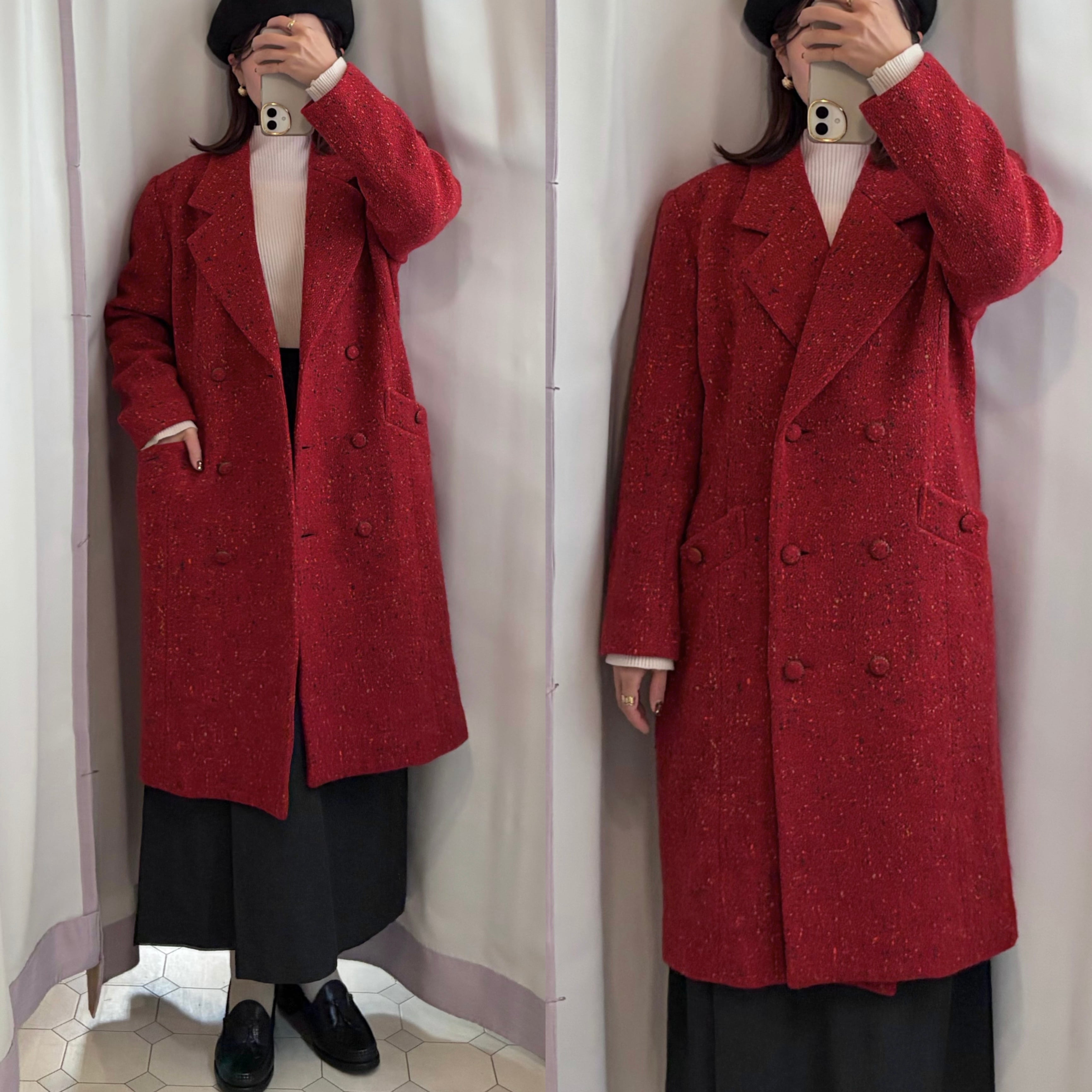 とても鮮やかな赤色が目を惹くチェスターコート