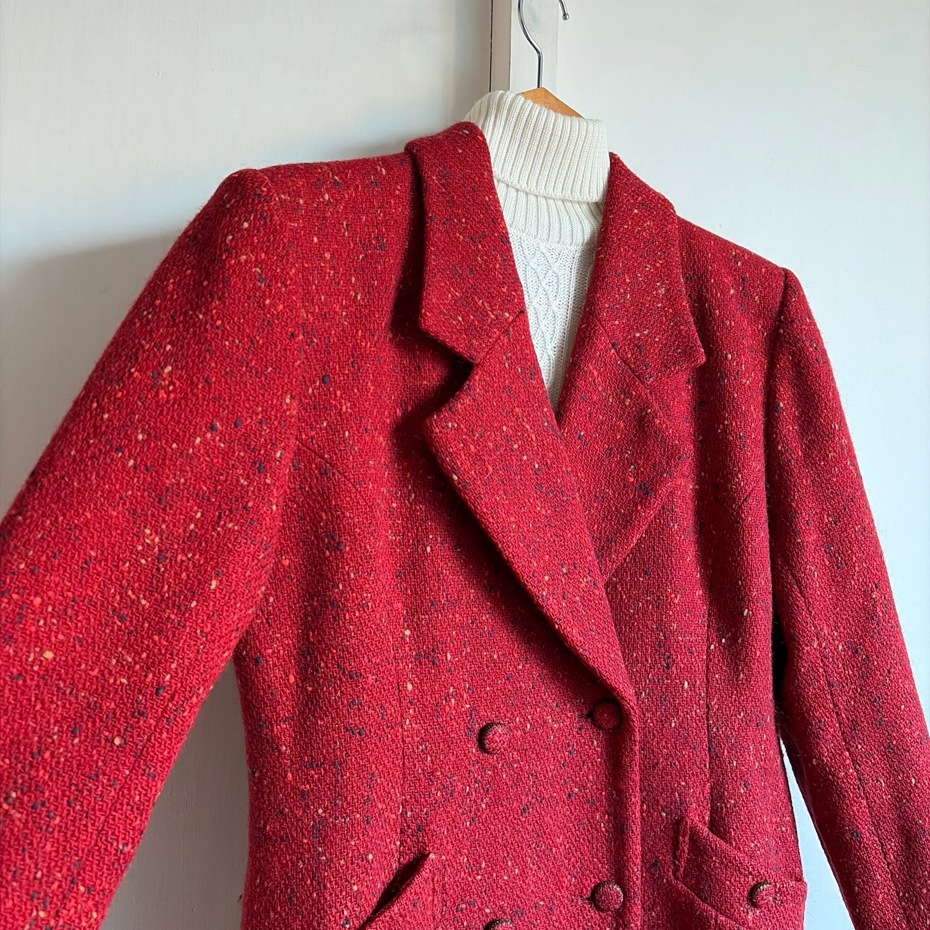 黄色やオレンジ、ダークグリーンのネップがミックスされたツイード生地が魅力的な一着