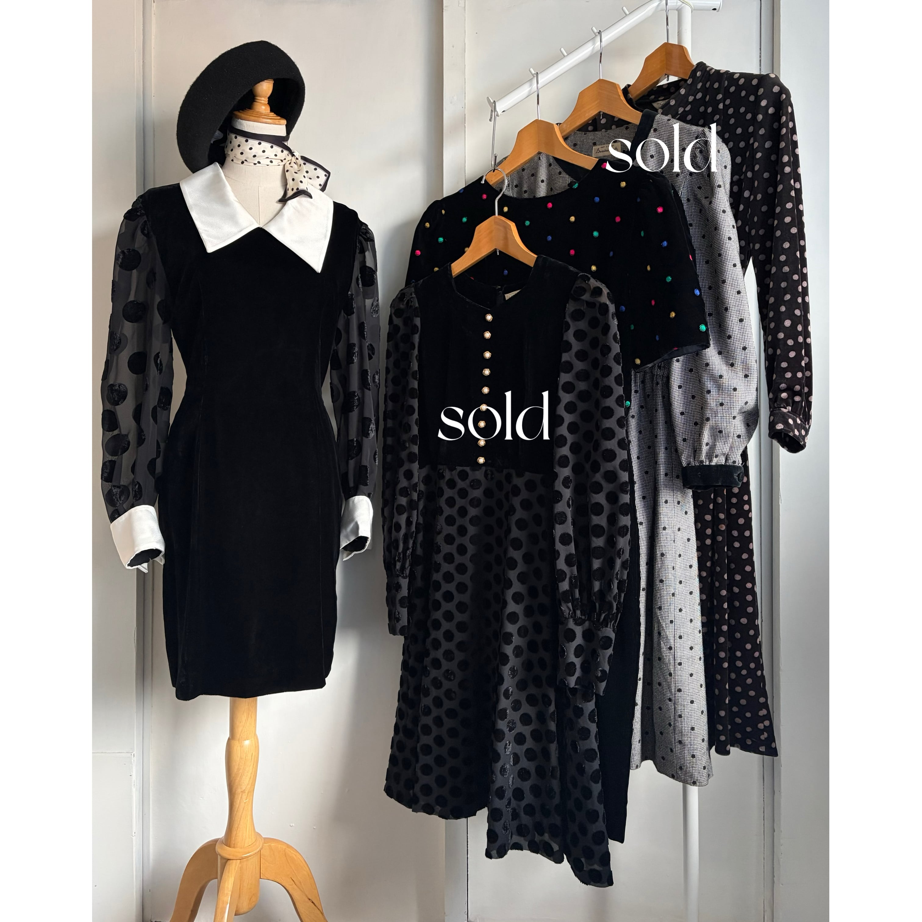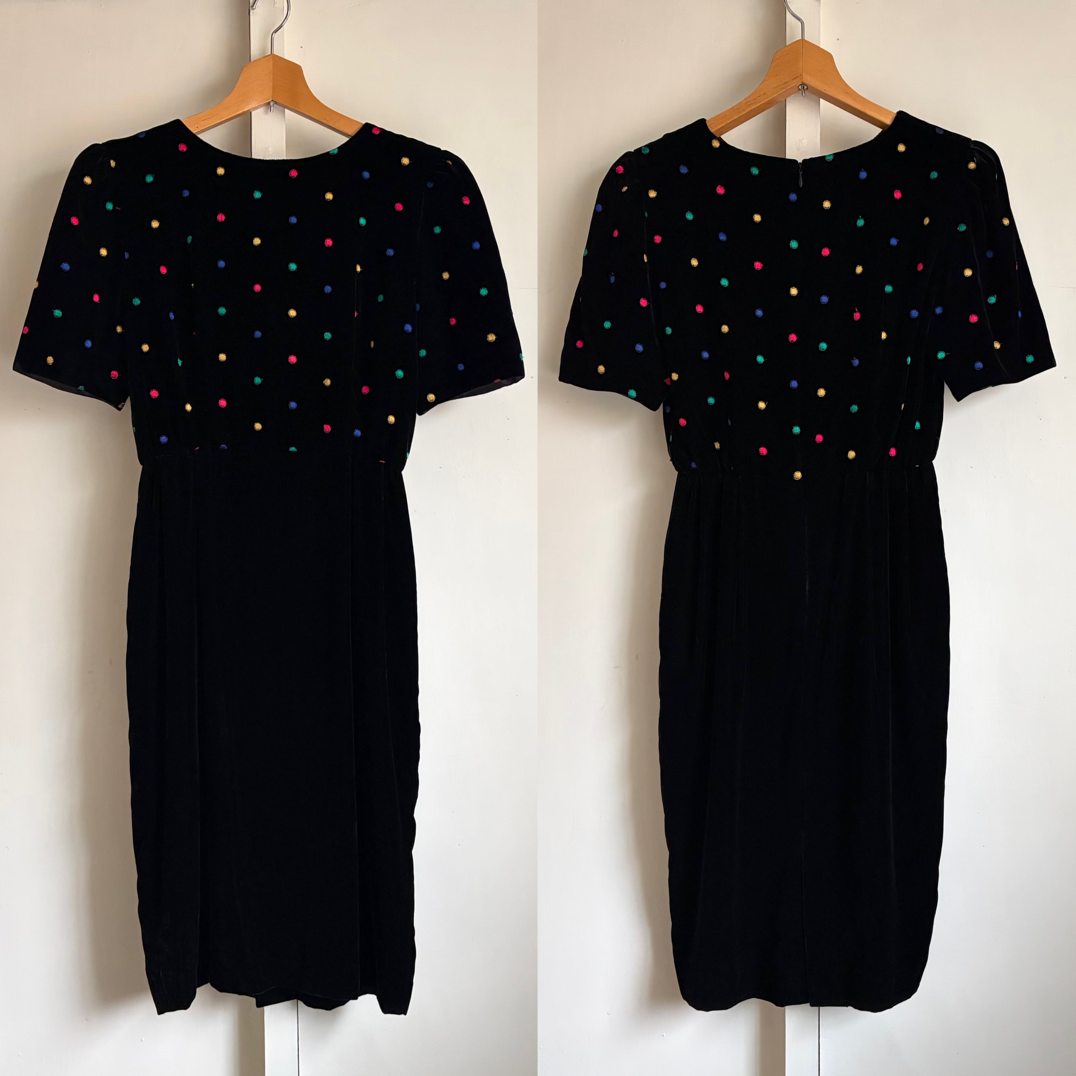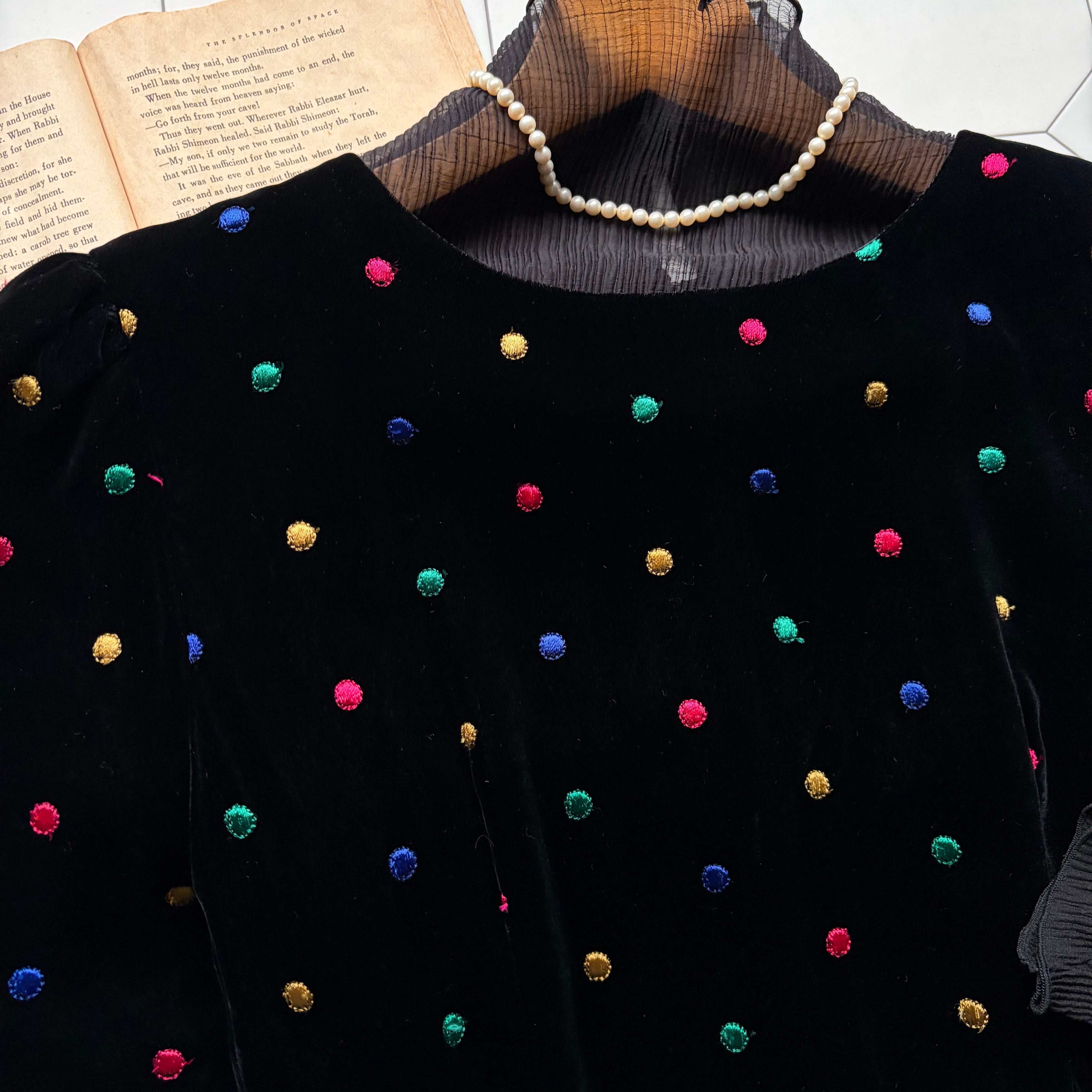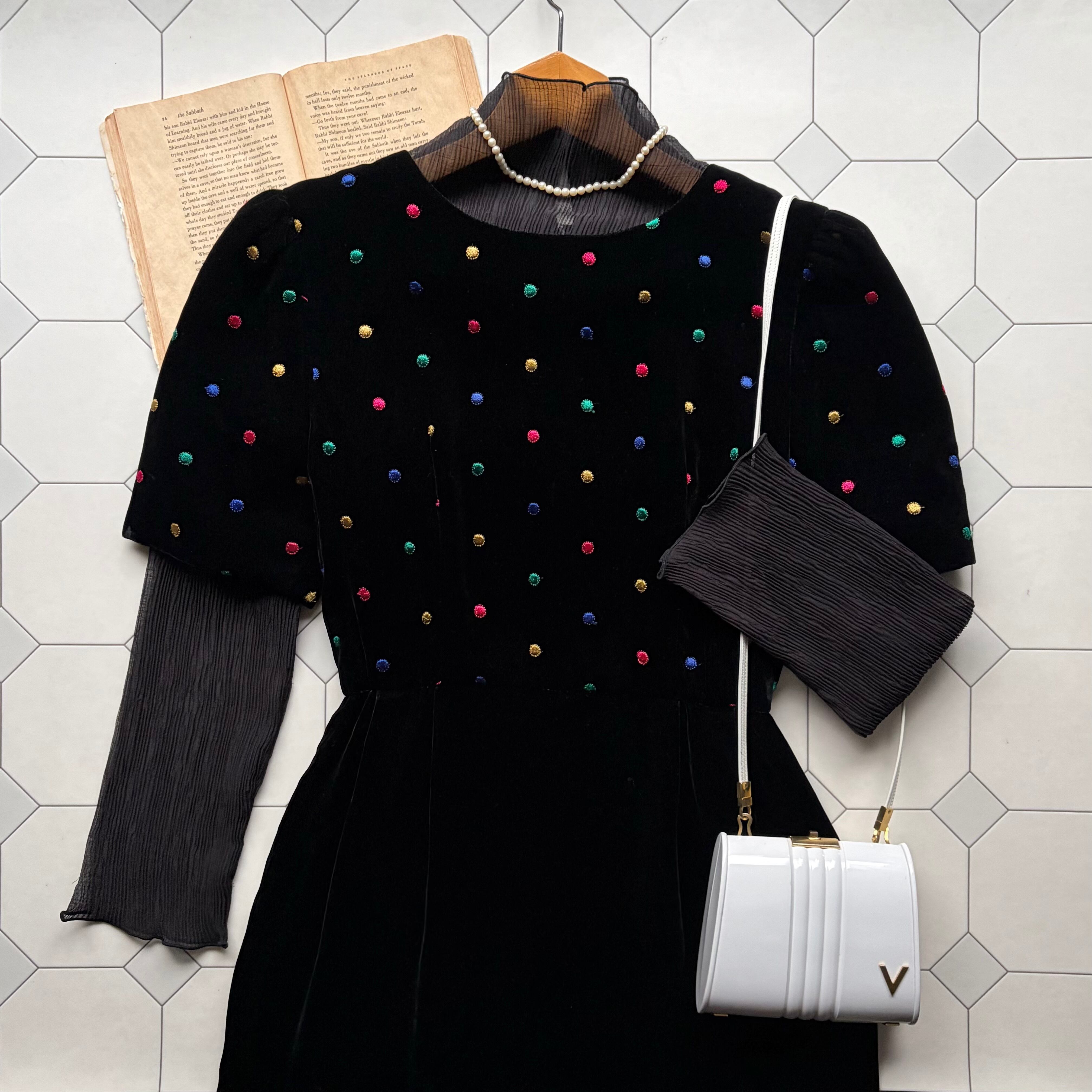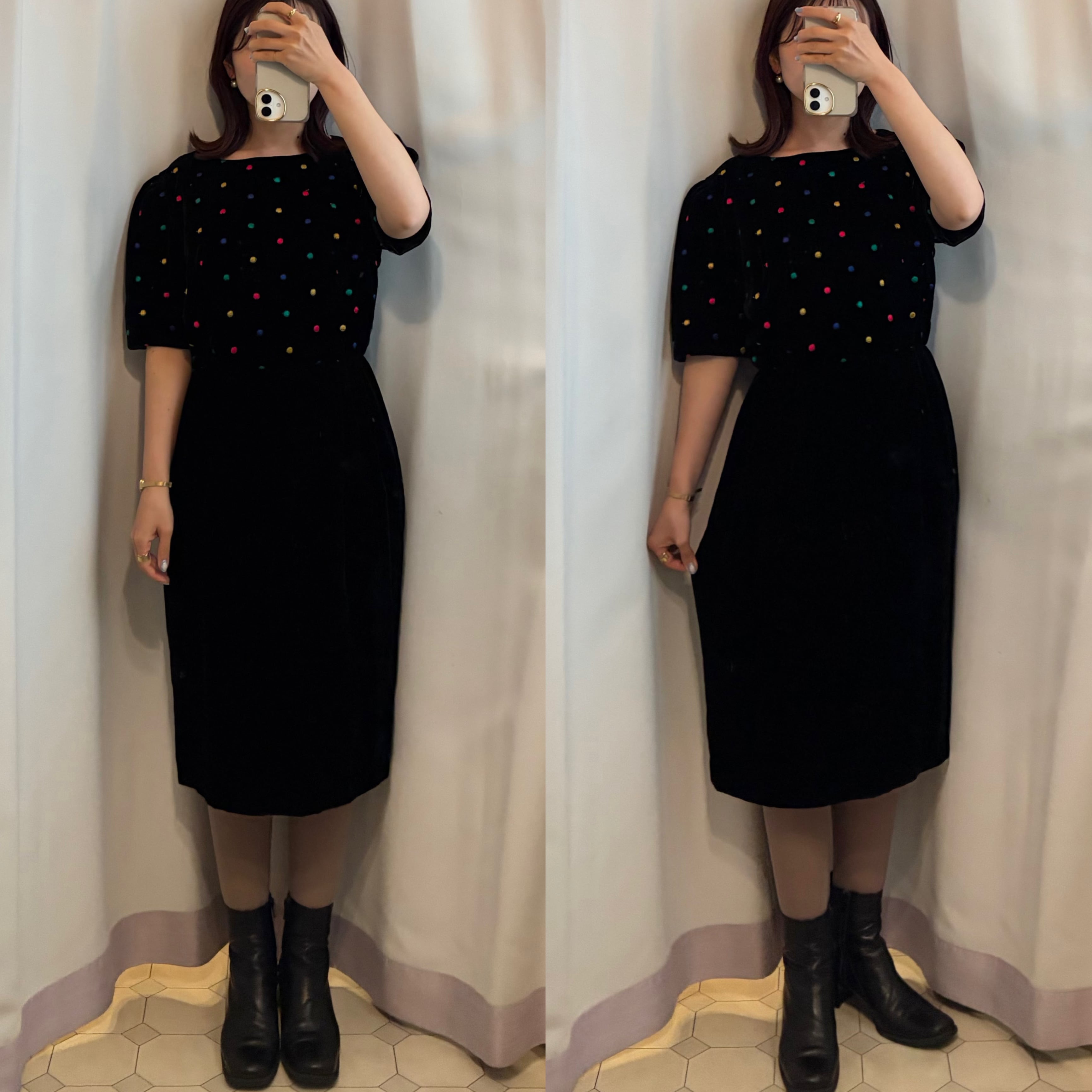 Colorful Dot Embroidered Velvet Dress〈レトロ古着 カラフルドット刺繍 ベルベットワンピース 黒 水玉 ジャパンヴィンテージ Japan Vintage〉