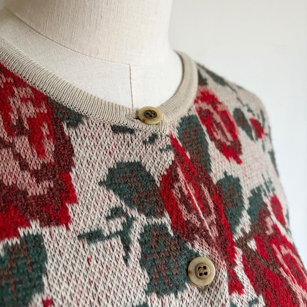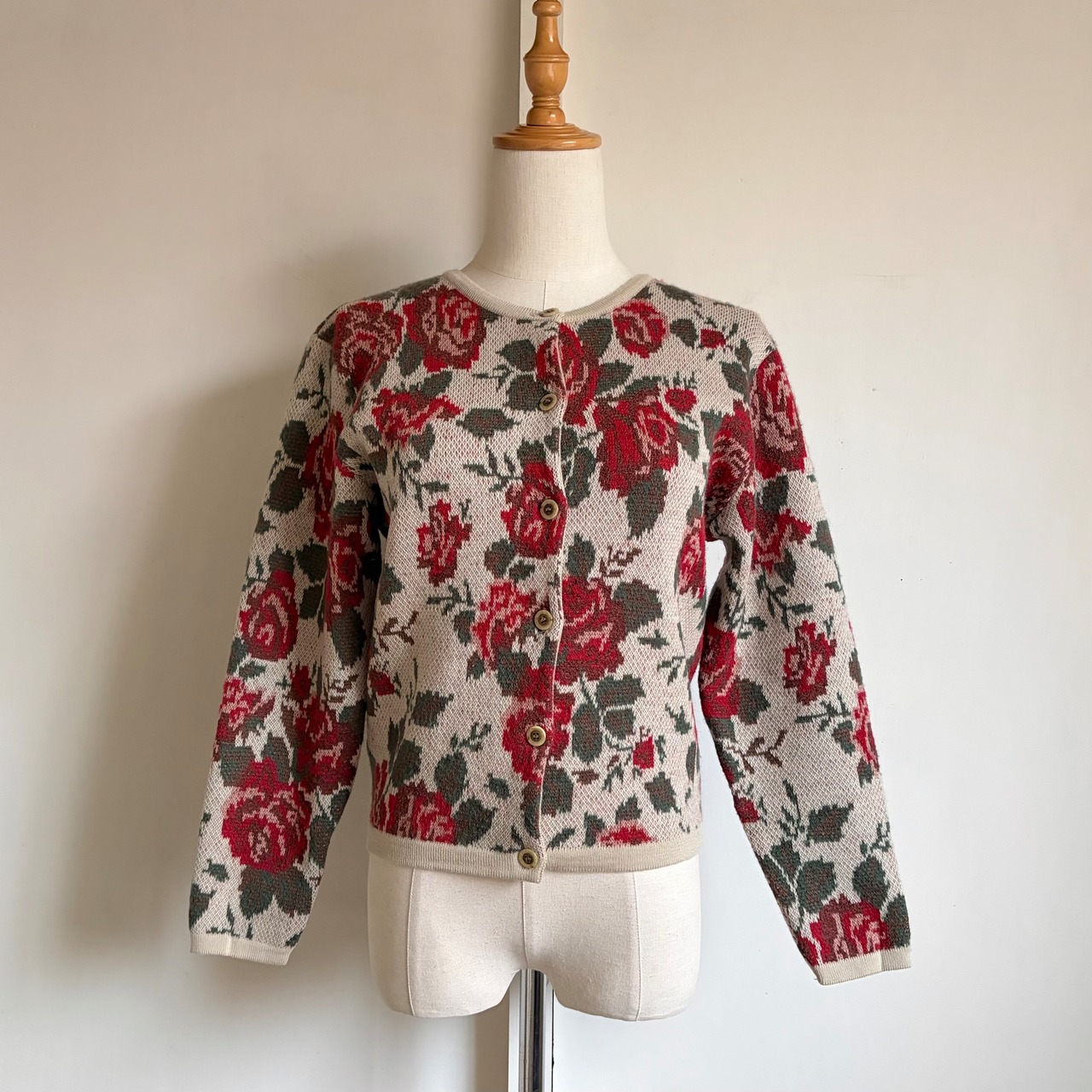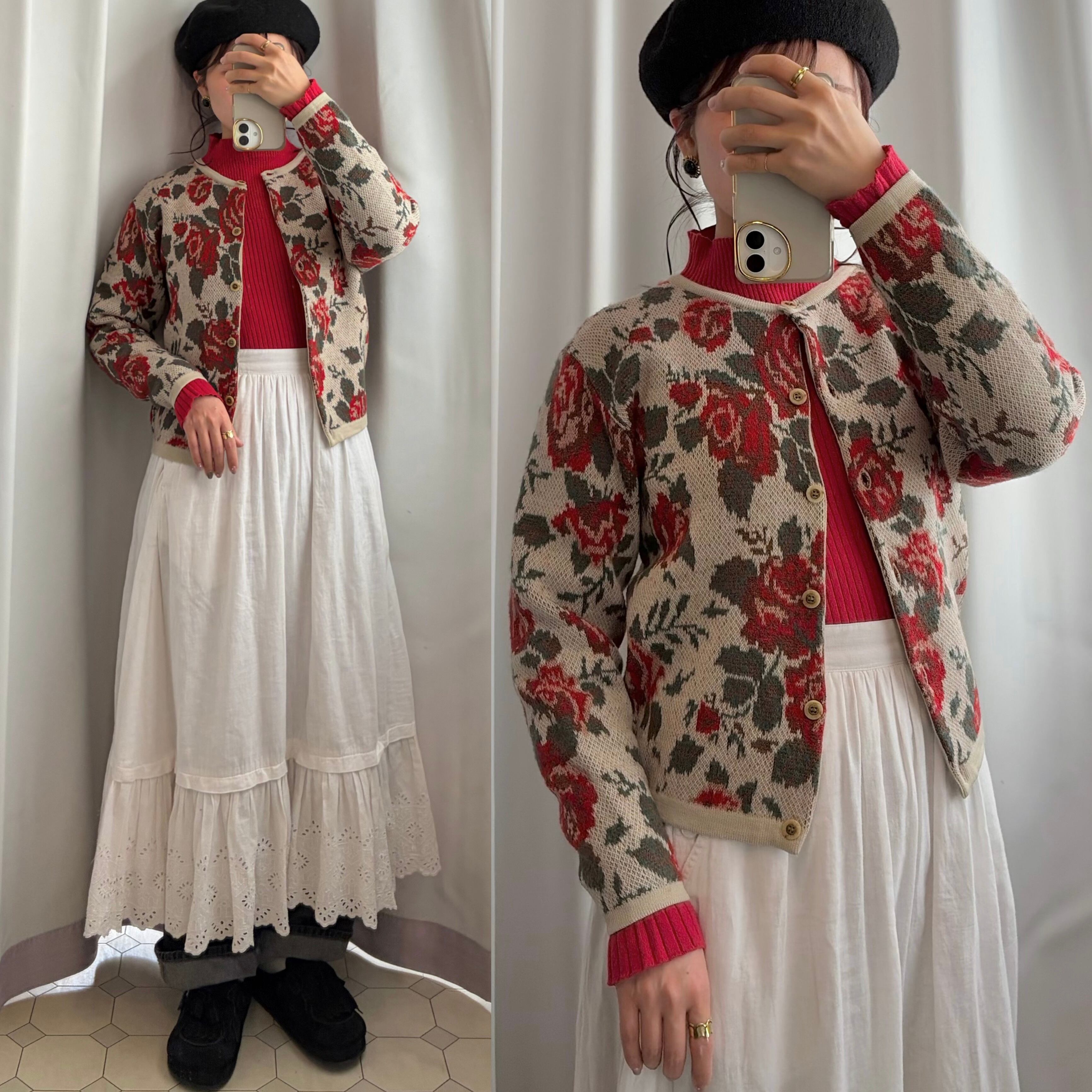 Rose Jacquard Knit Cardigan〈レトロ古着 薔薇柄 ジャガード ニット カーディガン ジャパンヴィンテージ〉