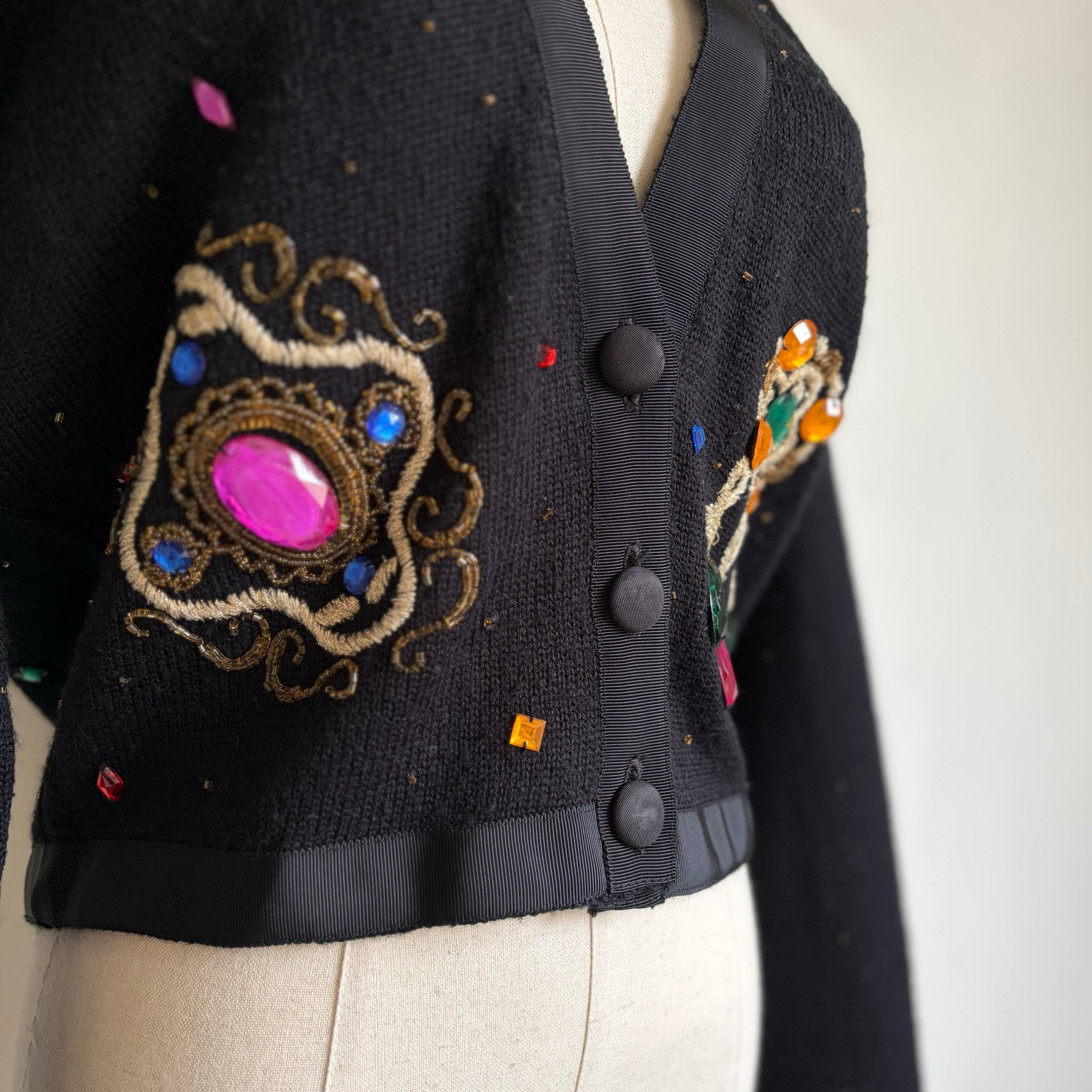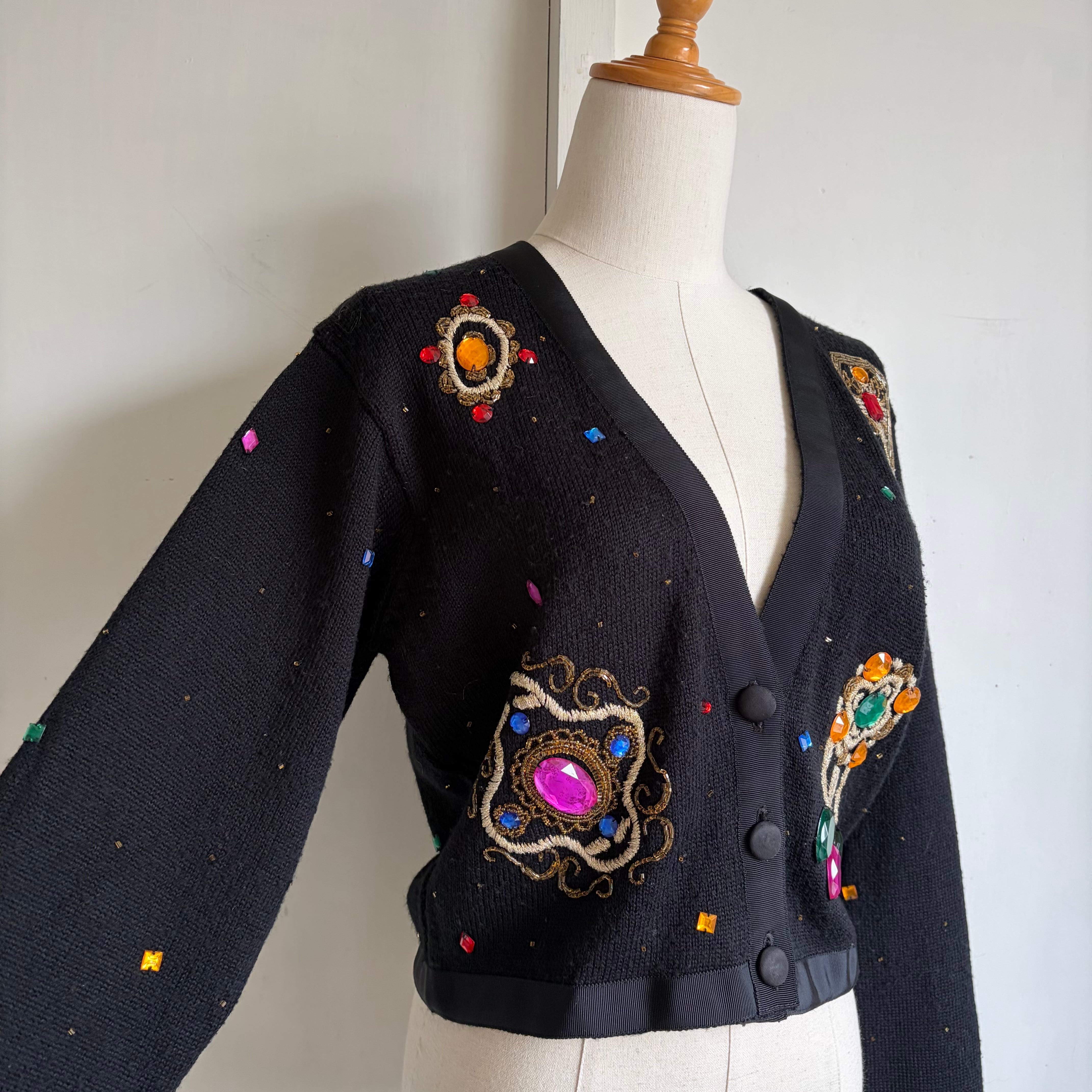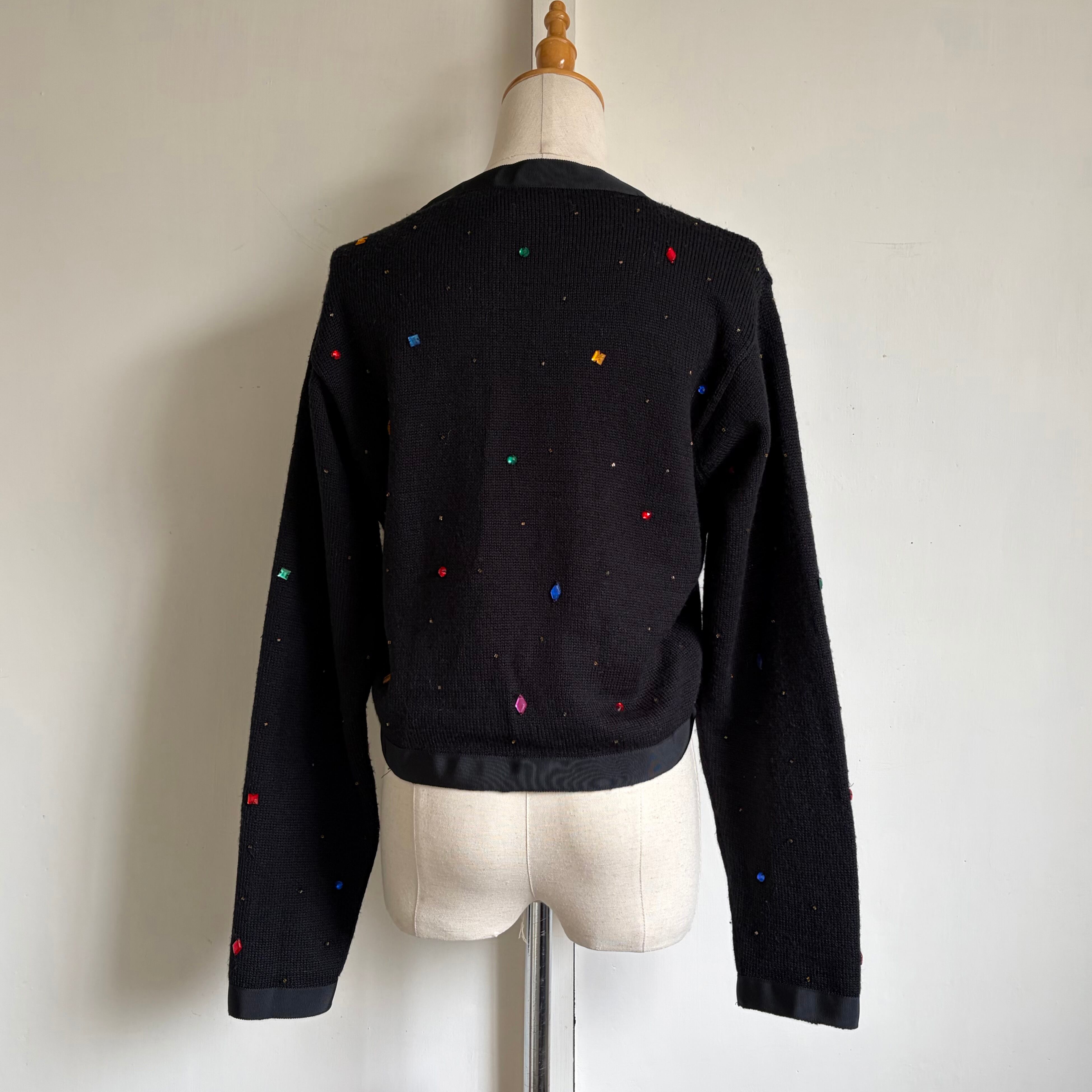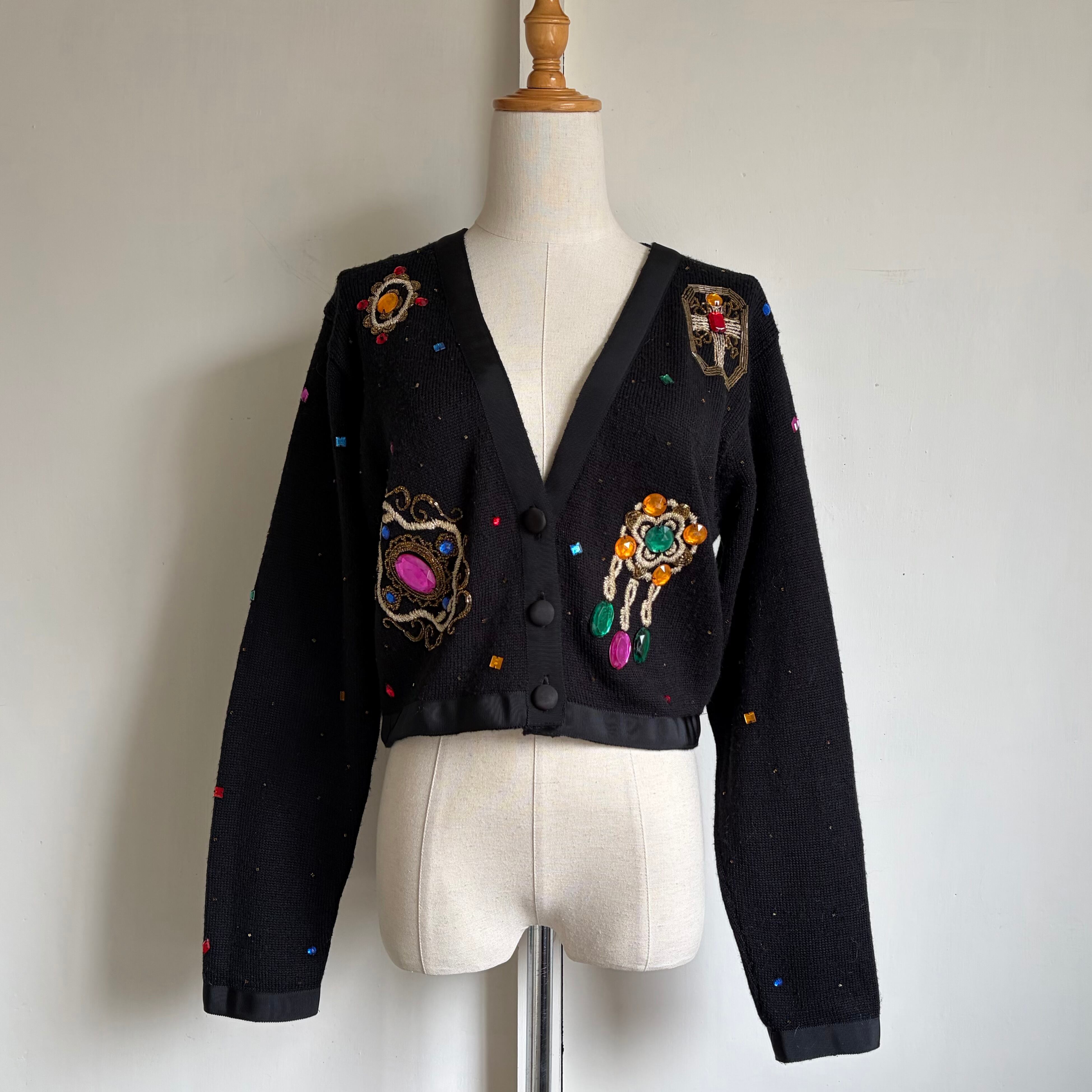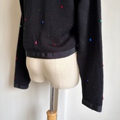 Bijou-Embellished Short Knit Cardigan 〈レトロ古着 ビジュー装飾 短丈 ニットカーディガン 香港製〉