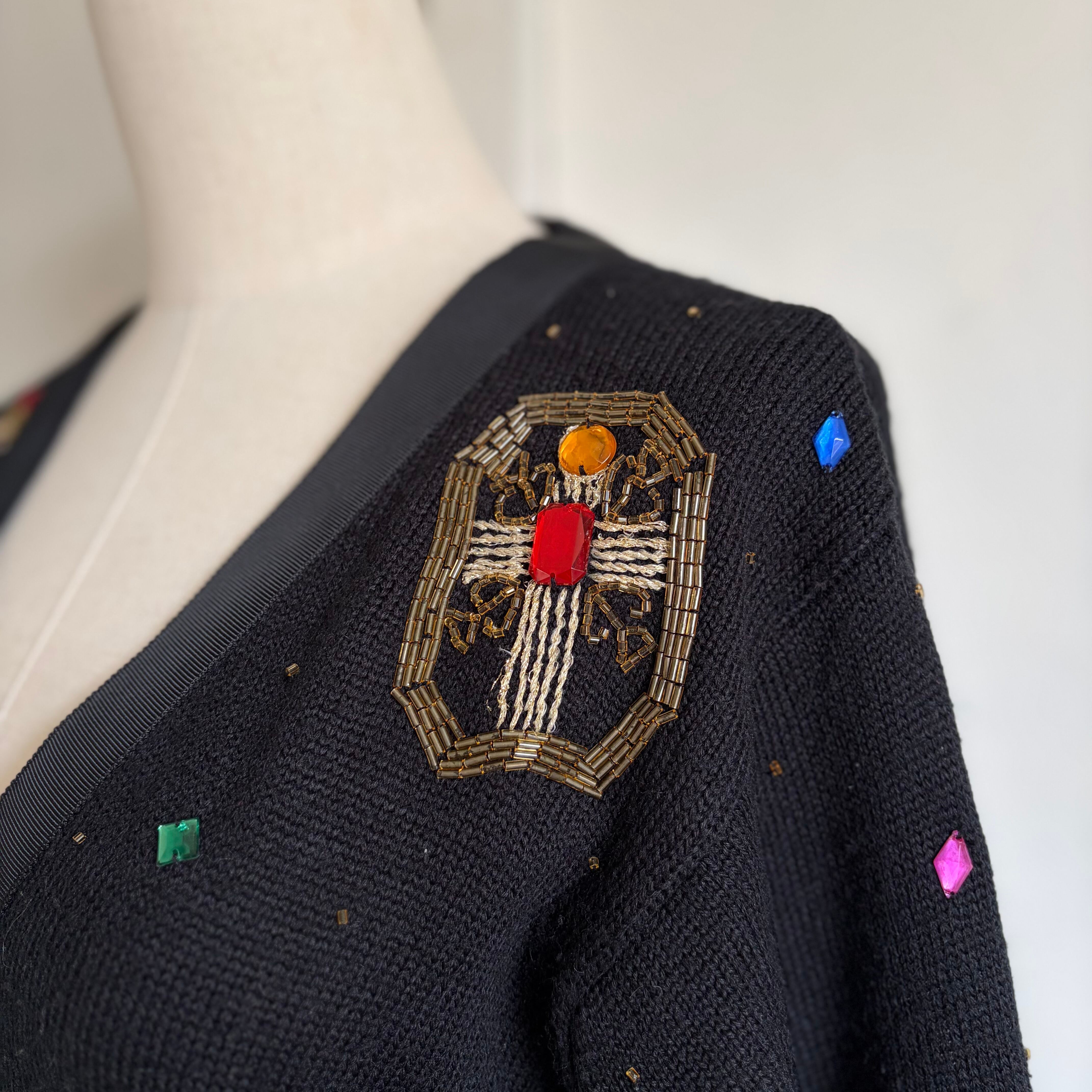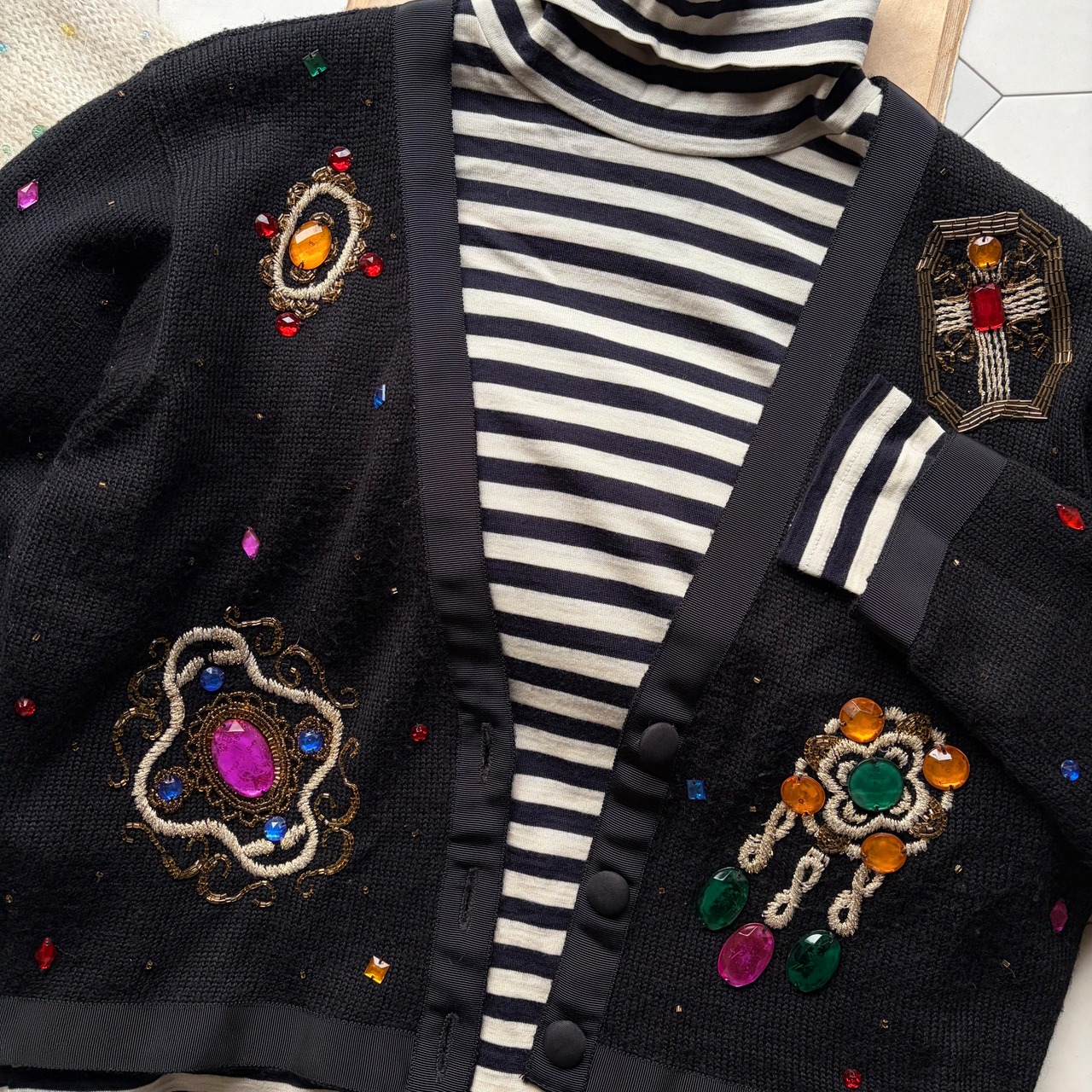 煌びやかなビジューやビーズ刺繍が大胆に施されたニットカーディガン