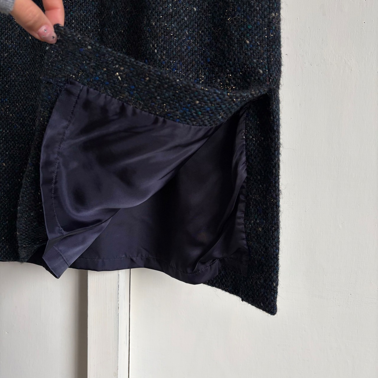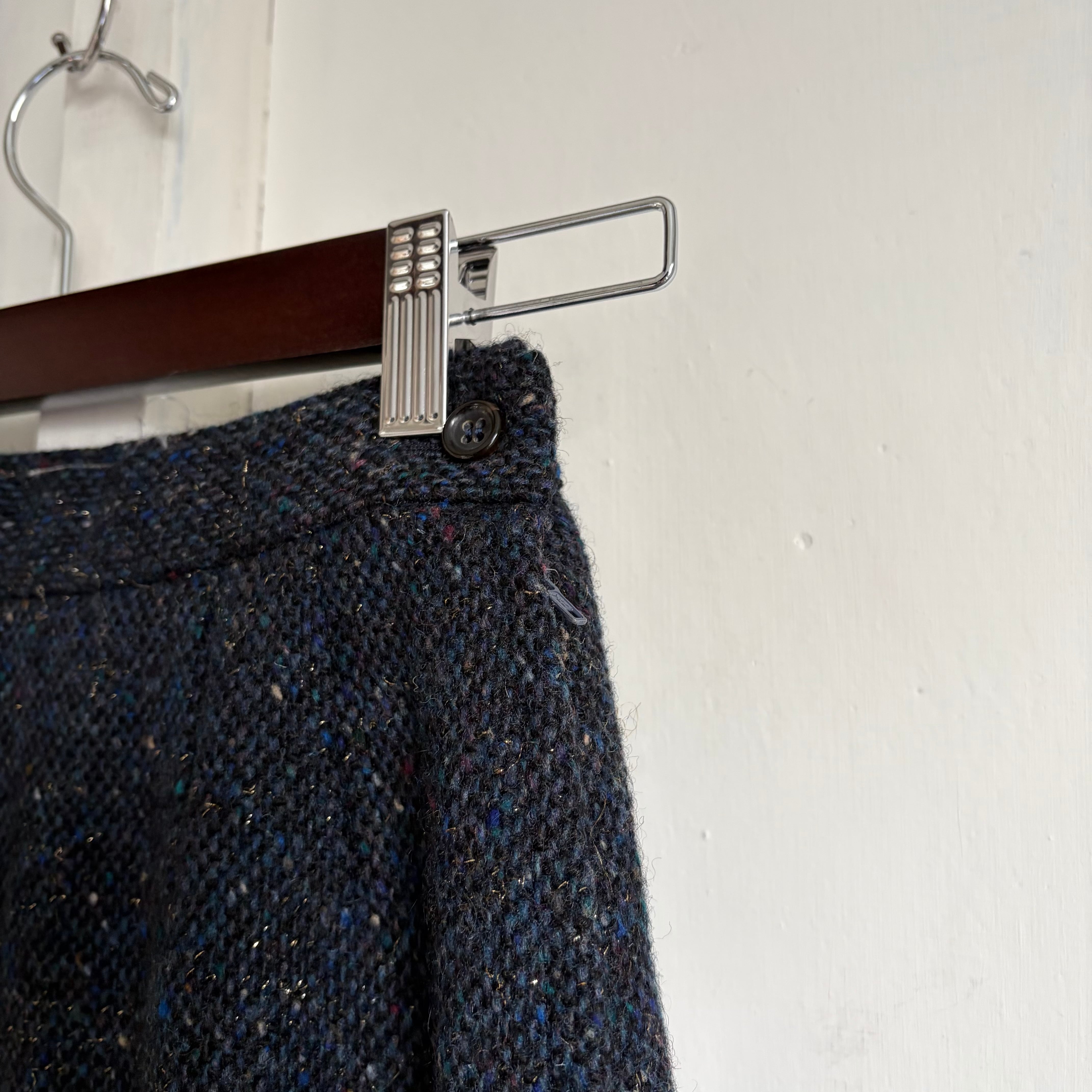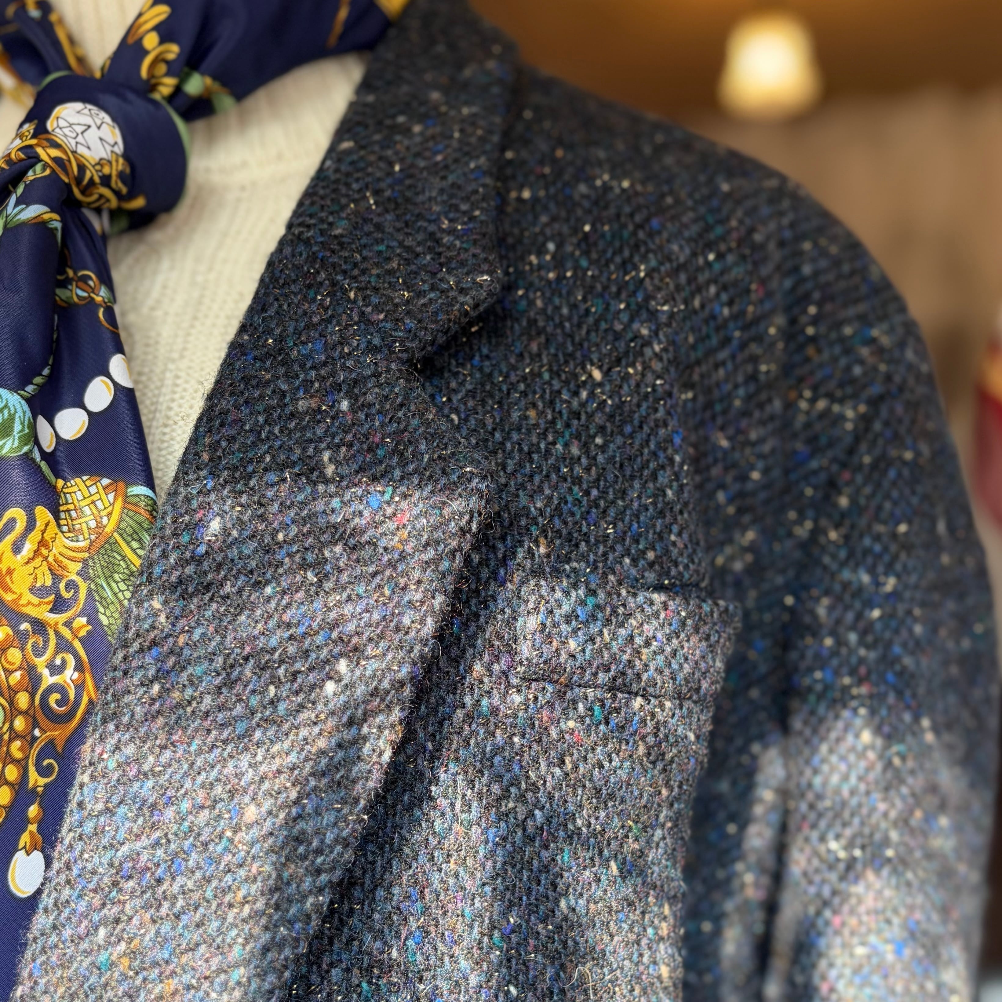 ブルーやグリーン・ワインレッドなどのネップとラメ糸がミックスされており、奥行きのある素材感がとても魅力的