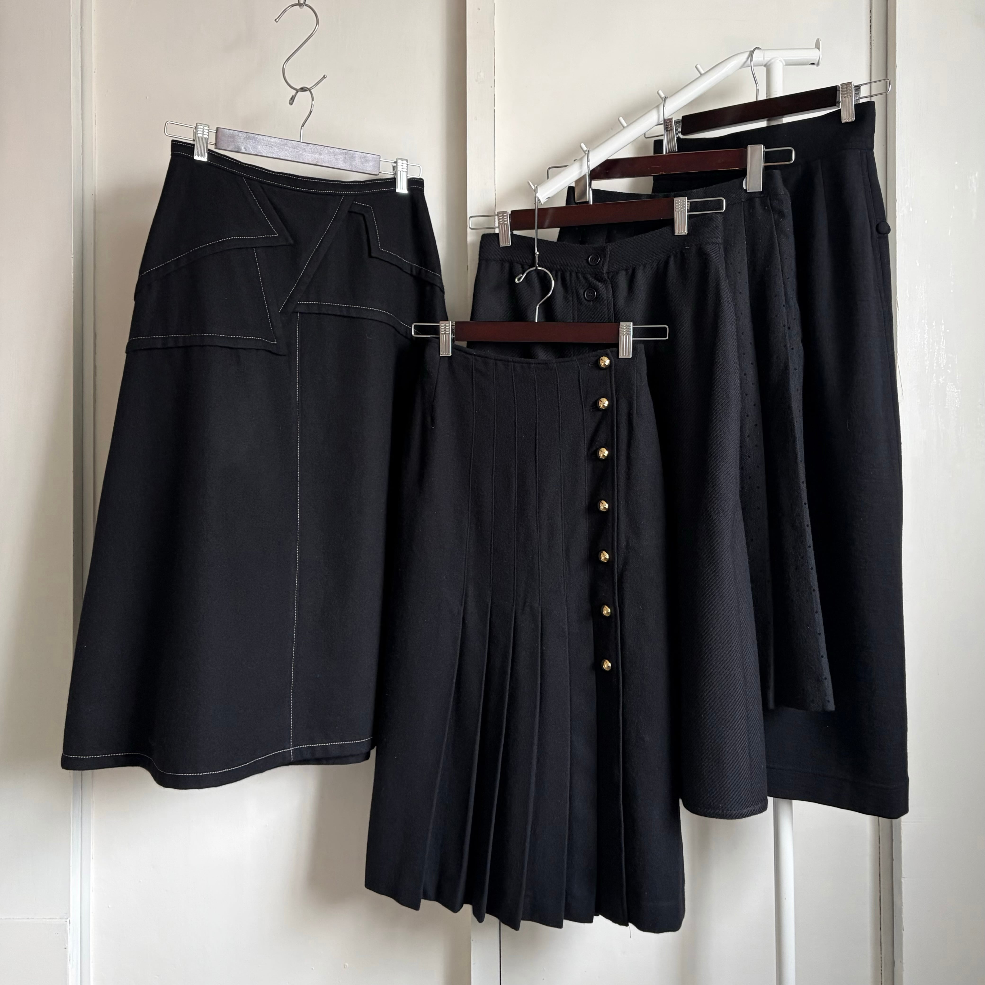 幅広く着回しやすいベーシックさと、しっかりとした素材感が魅力的なブラックのウールスカートが揃いました