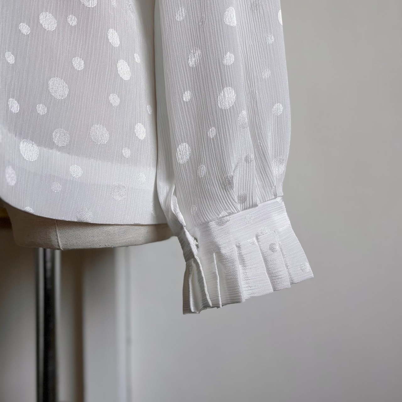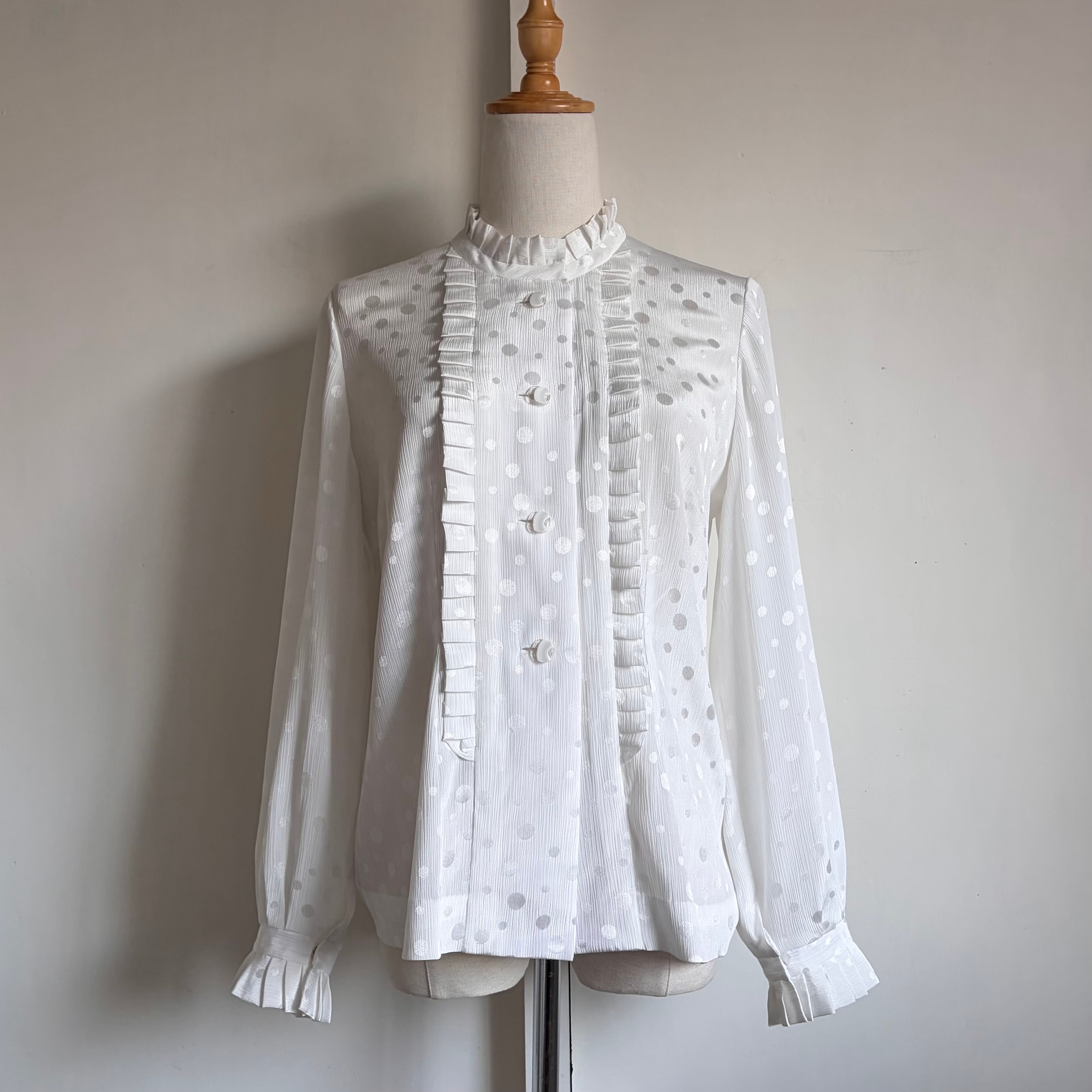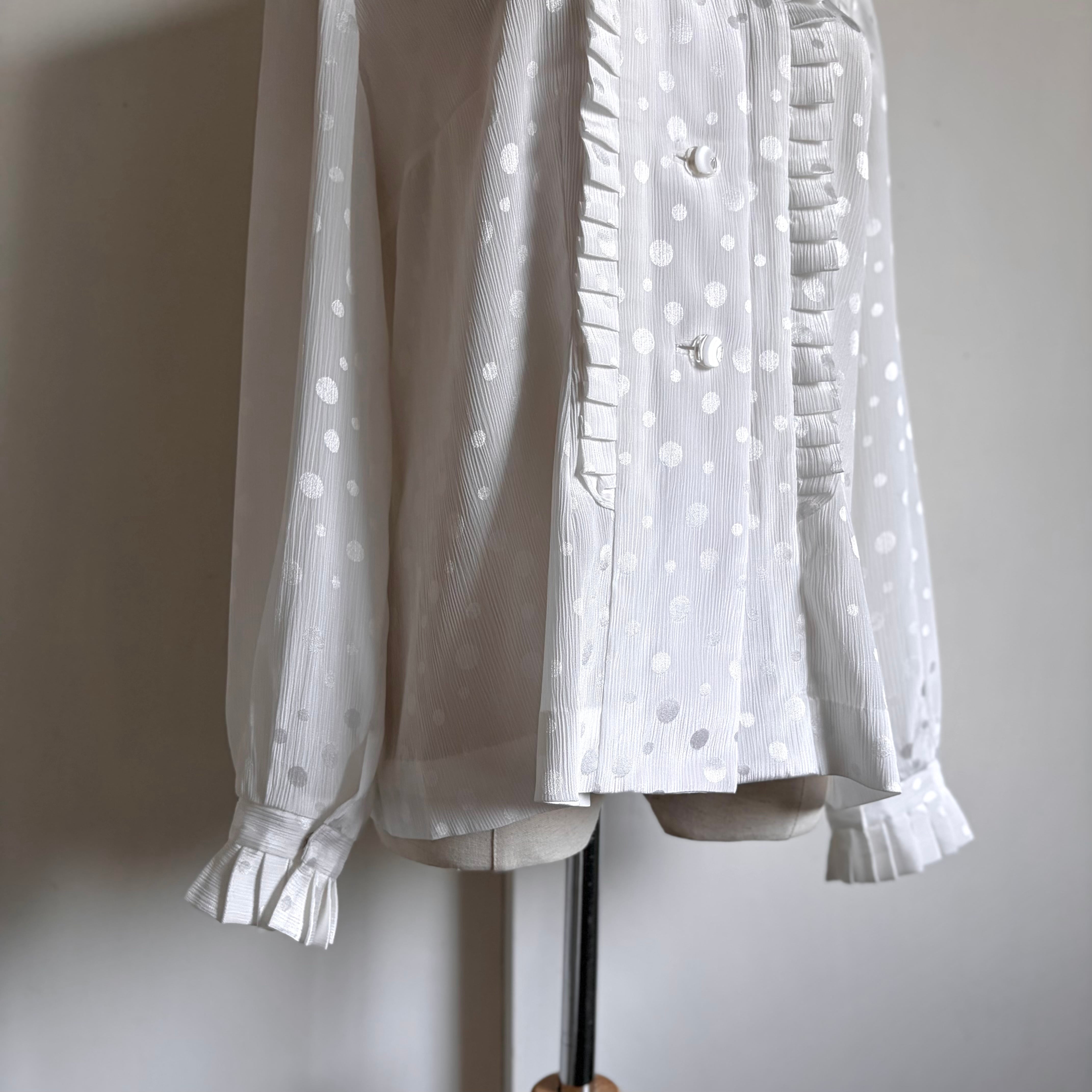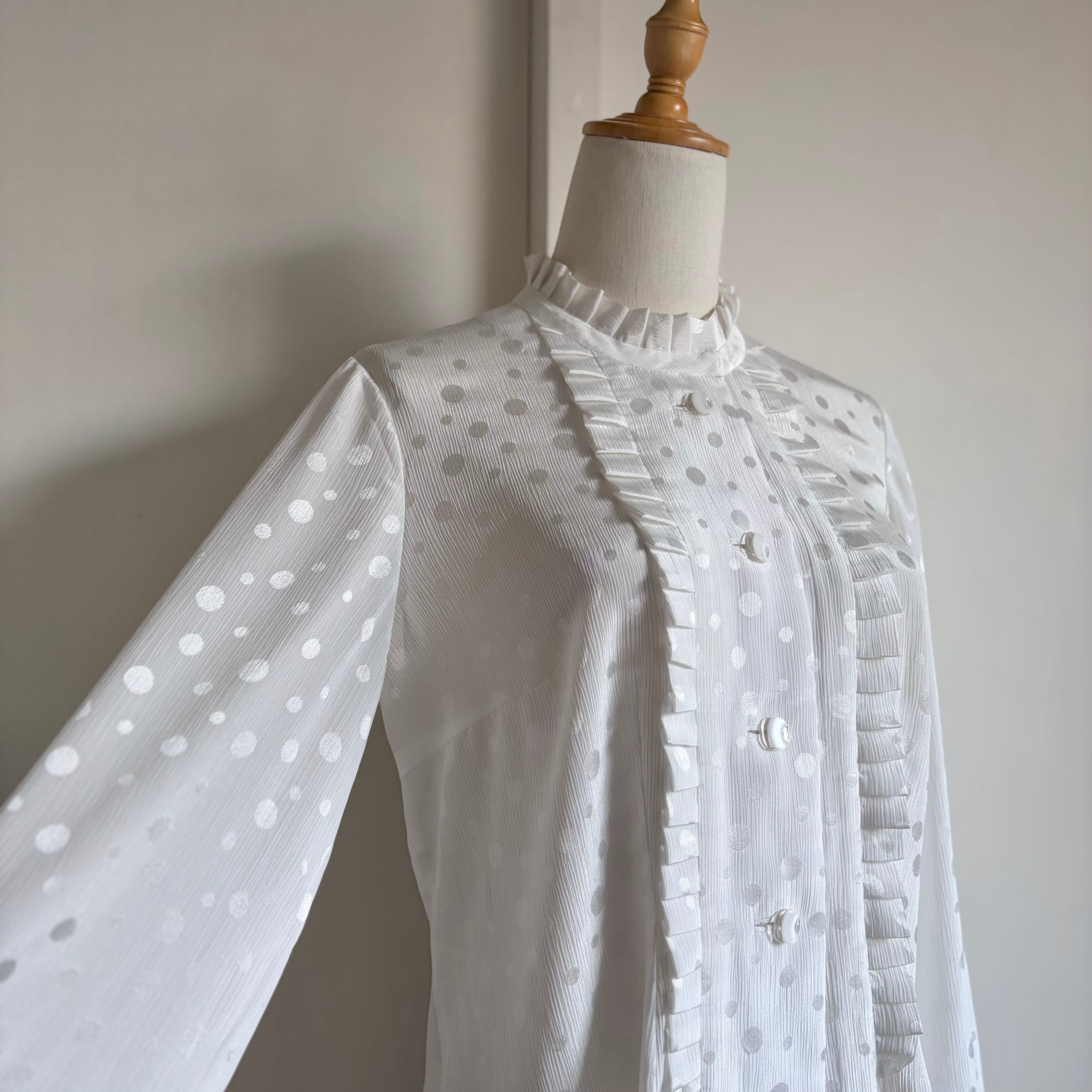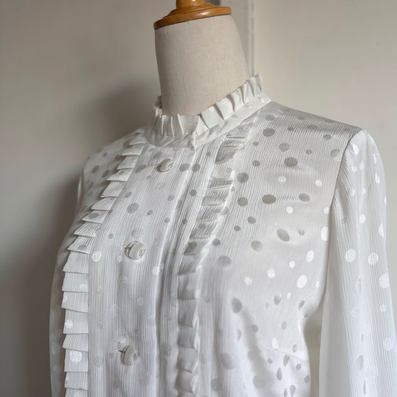 Dot Jacquard Tucked Frill Blouse〈レトロ古着 ドット ジャガード タックフリル ブラウス 白 ジャパンヴィンテージ Japan Vintage〉