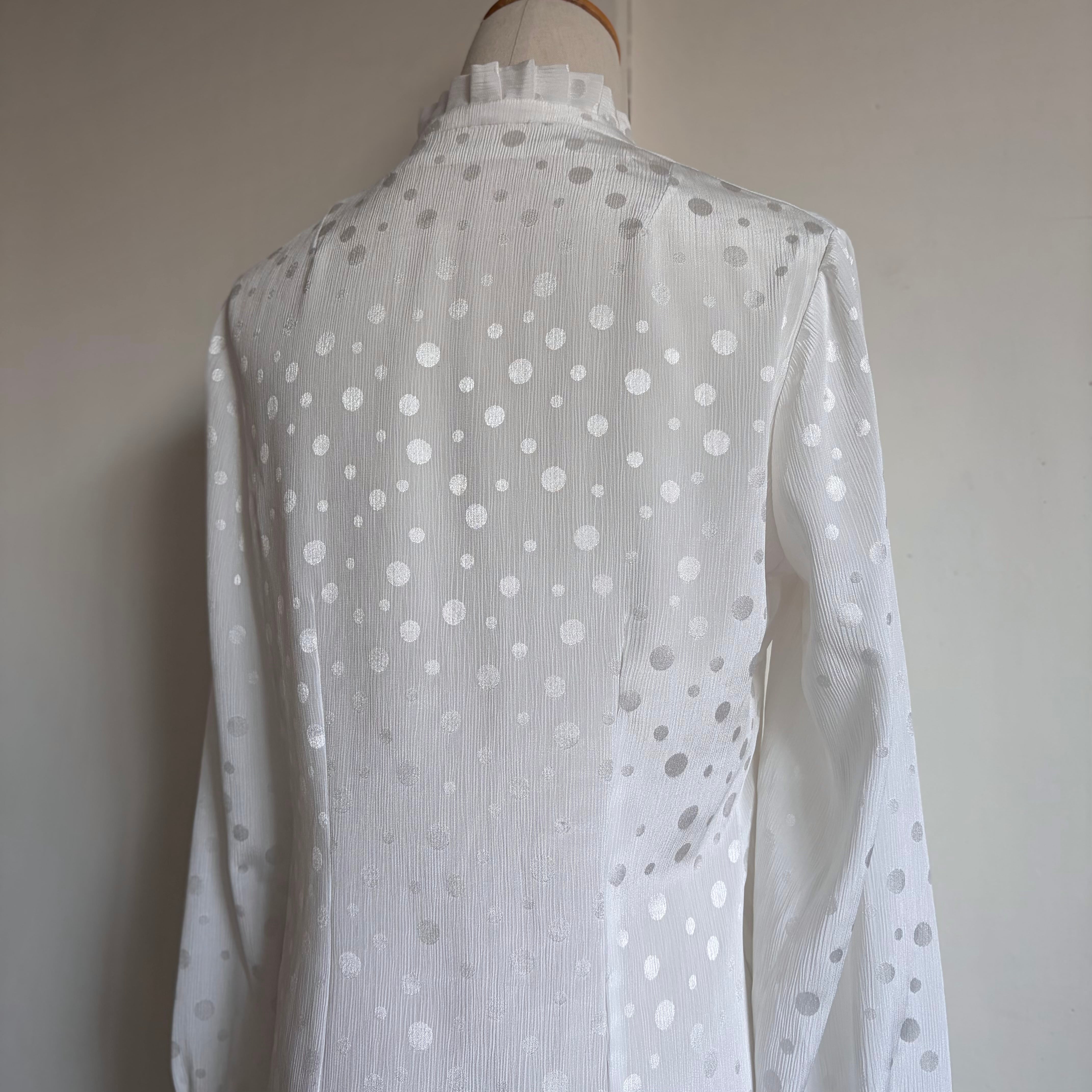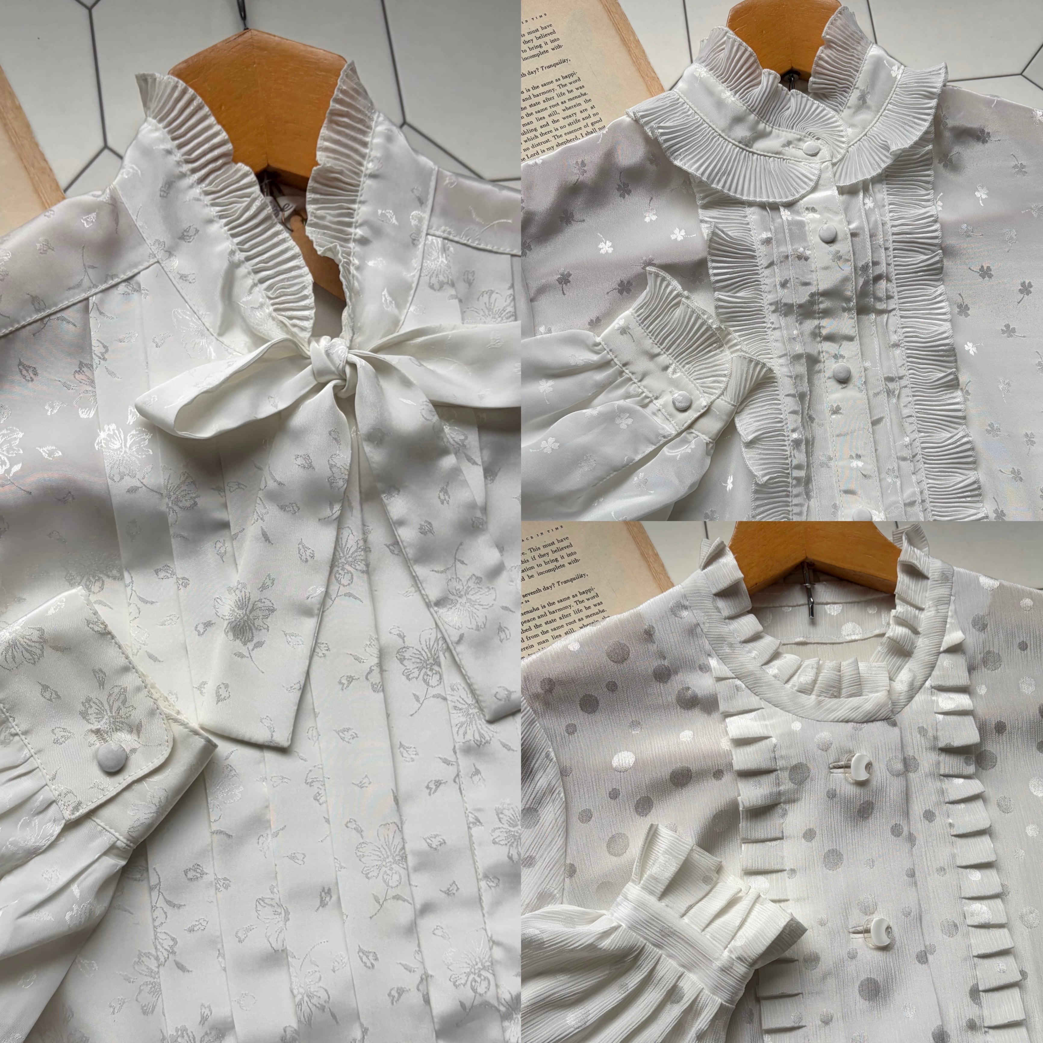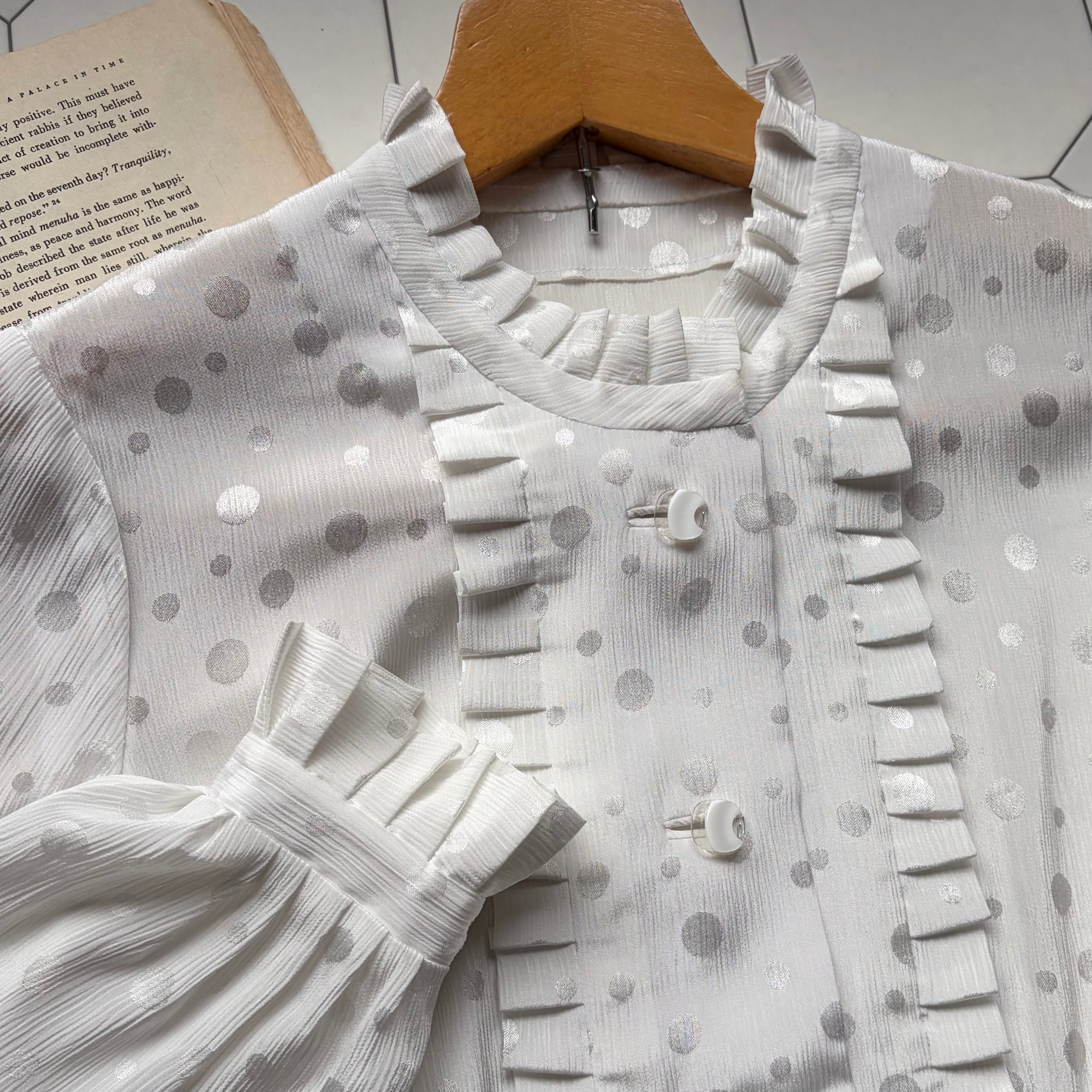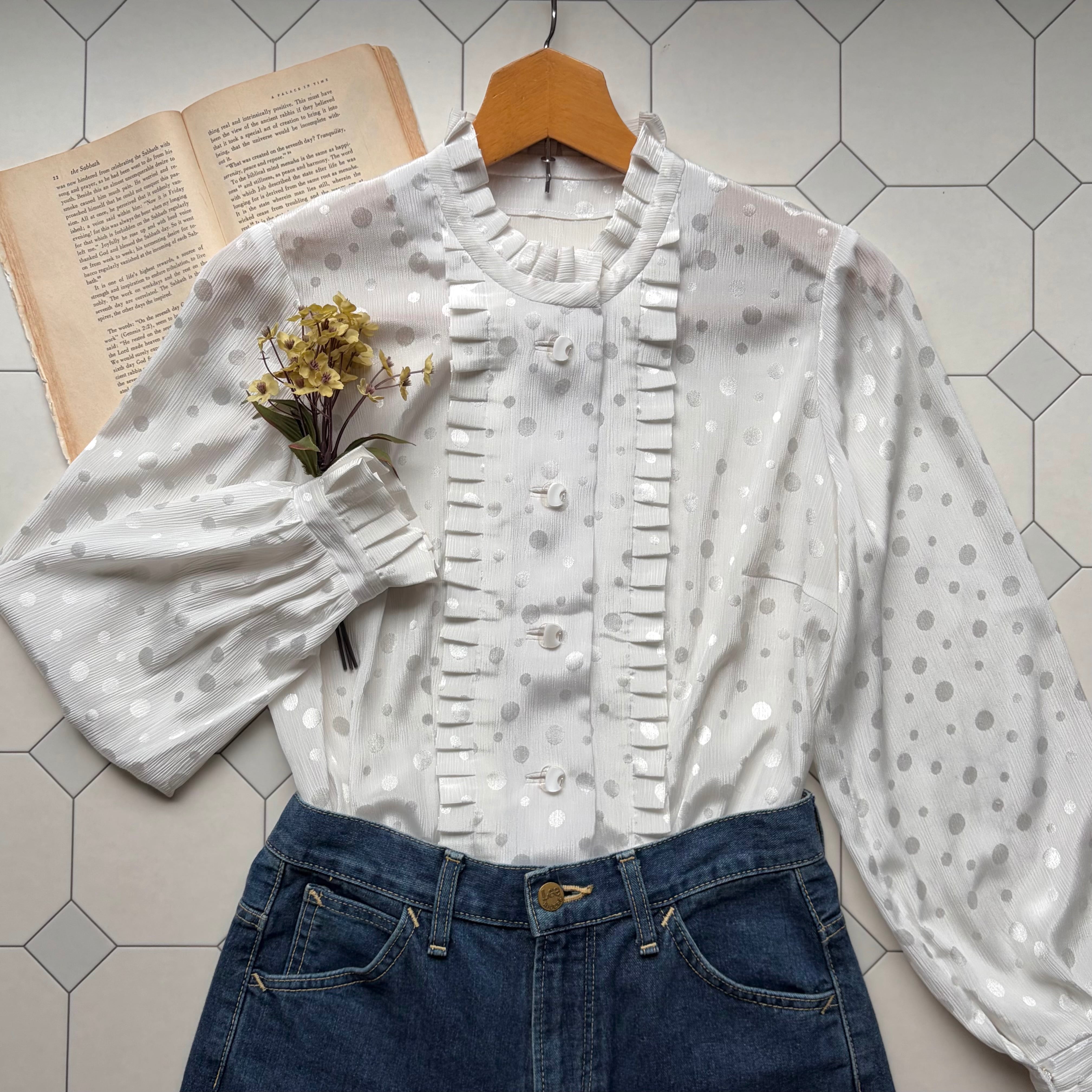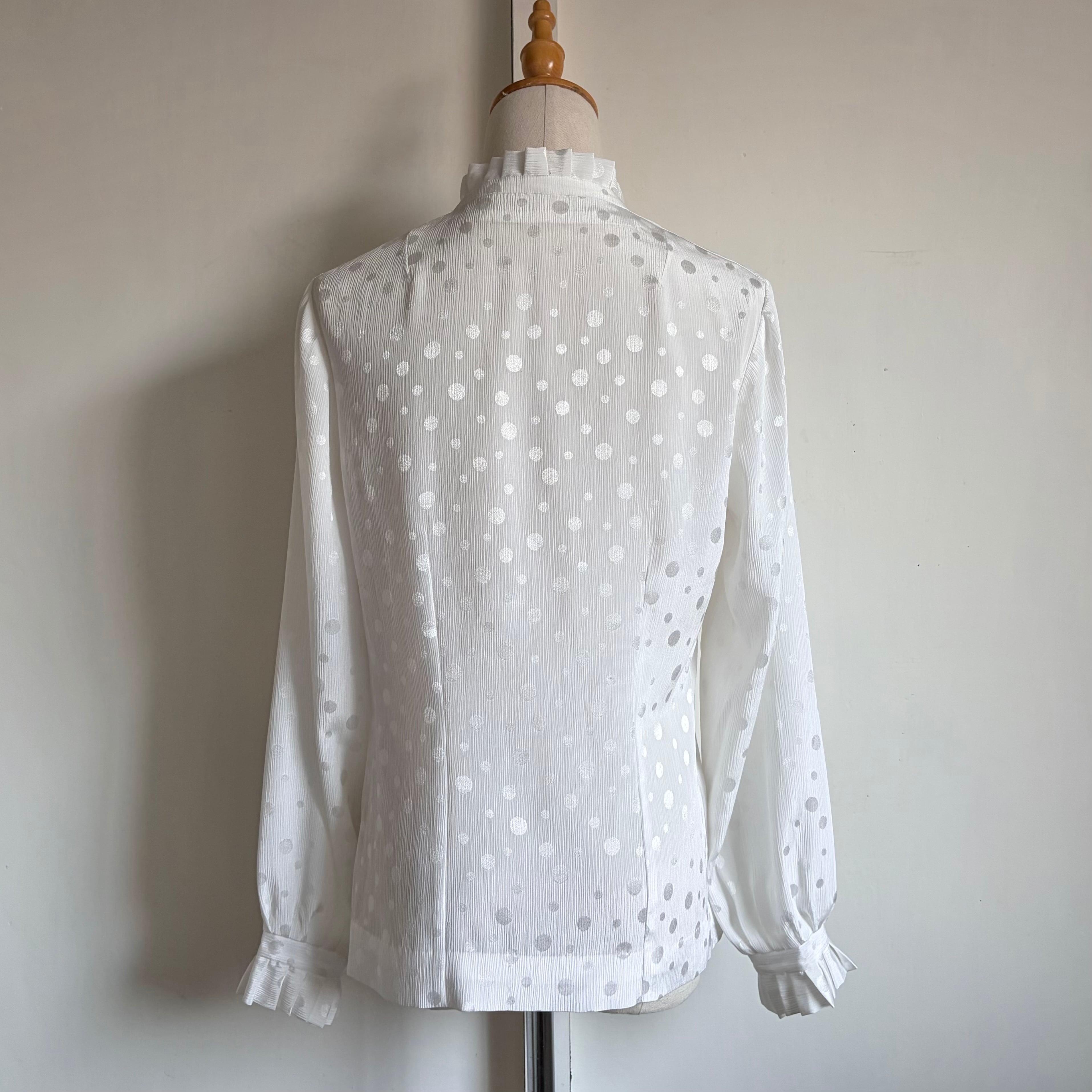 Dot Jacquard Tucked Frill Blouse〈レトロ古着 ドット ジャガード タックフリル ブラウス 白 ジャパンヴィンテージ Japan Vintage〉