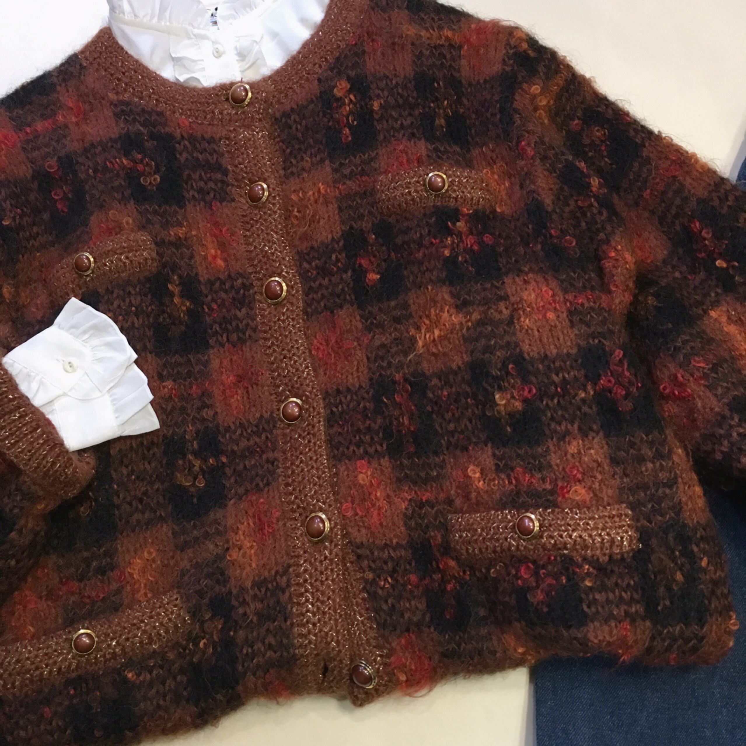 チェックとレトロなボタンが可愛い厚手のカーディガンです。