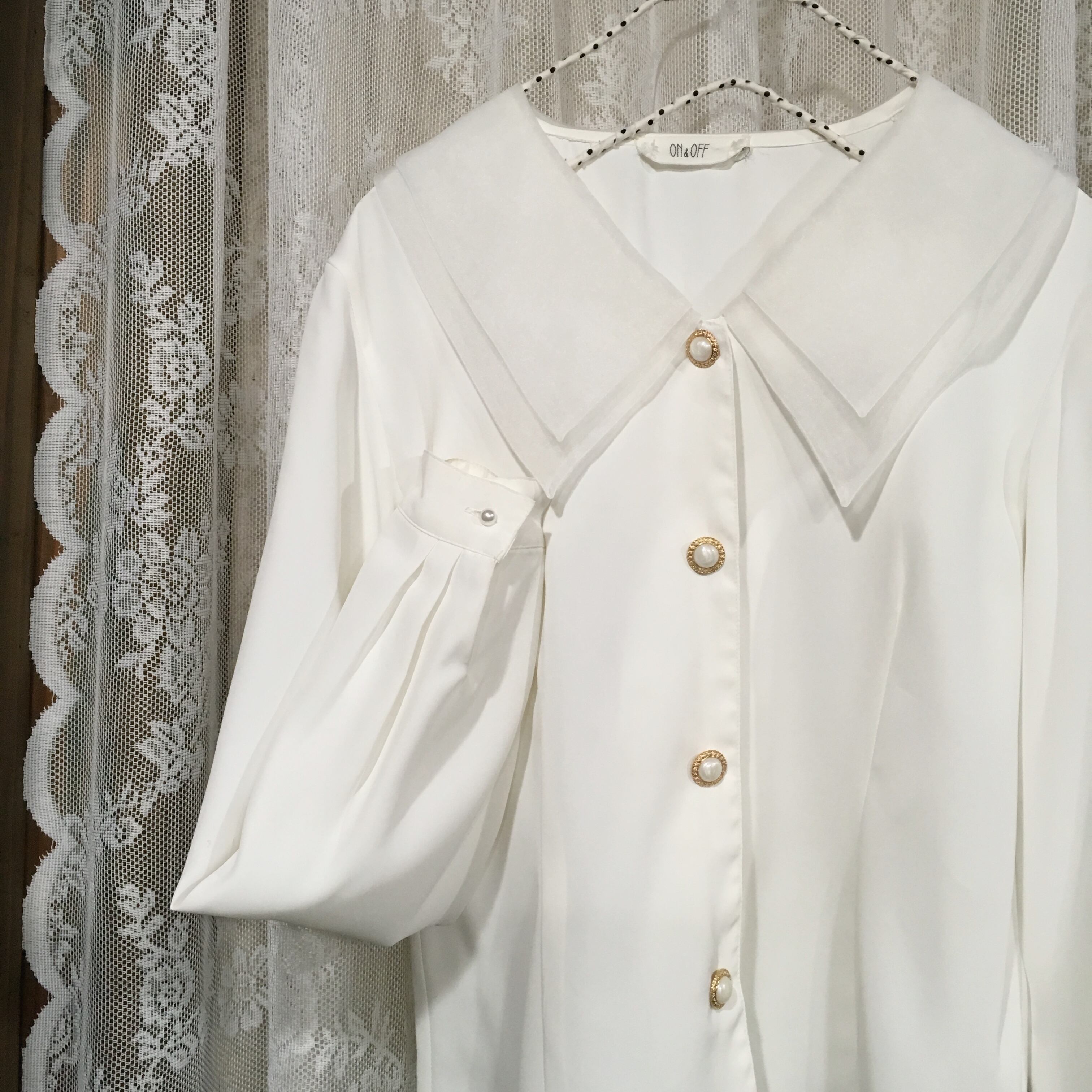 オーガンジーの大きな襟がクラシカルなホワイトブラウスです。