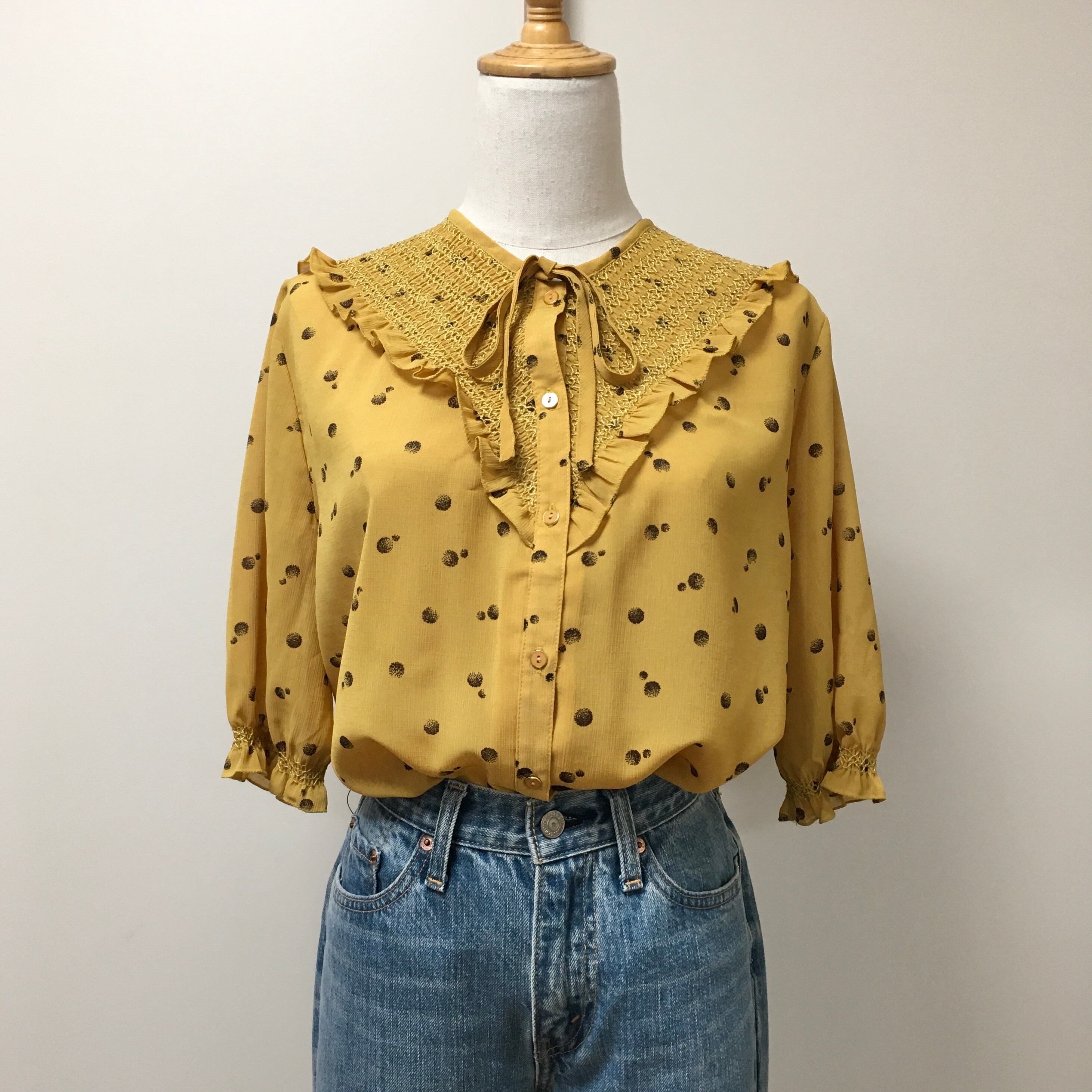 smocking dot bowtie blouse 〈レトロ古着 スモッキングドットボウタイブラウス〉