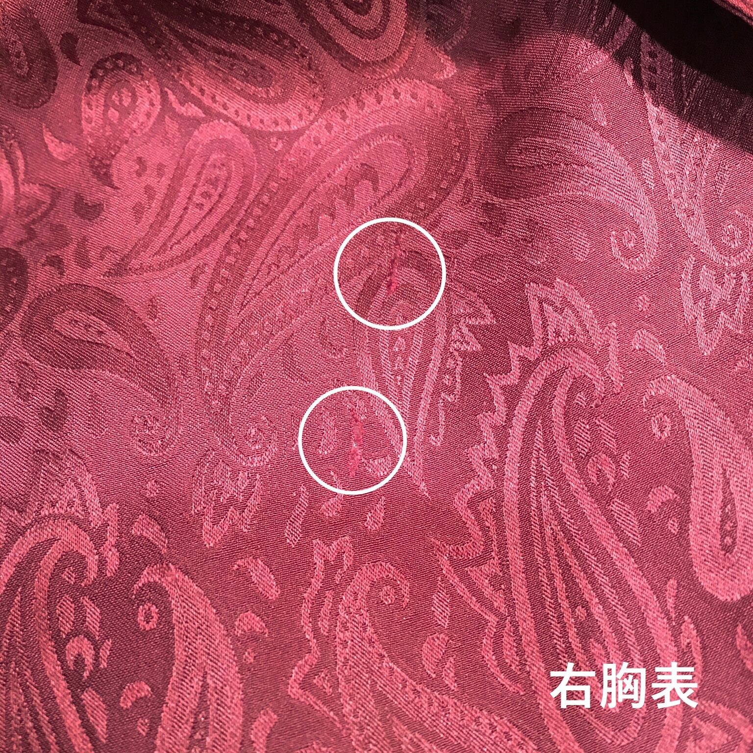 右胸部分の裏側にダメージあり(裏側から接着芯で補強済み)