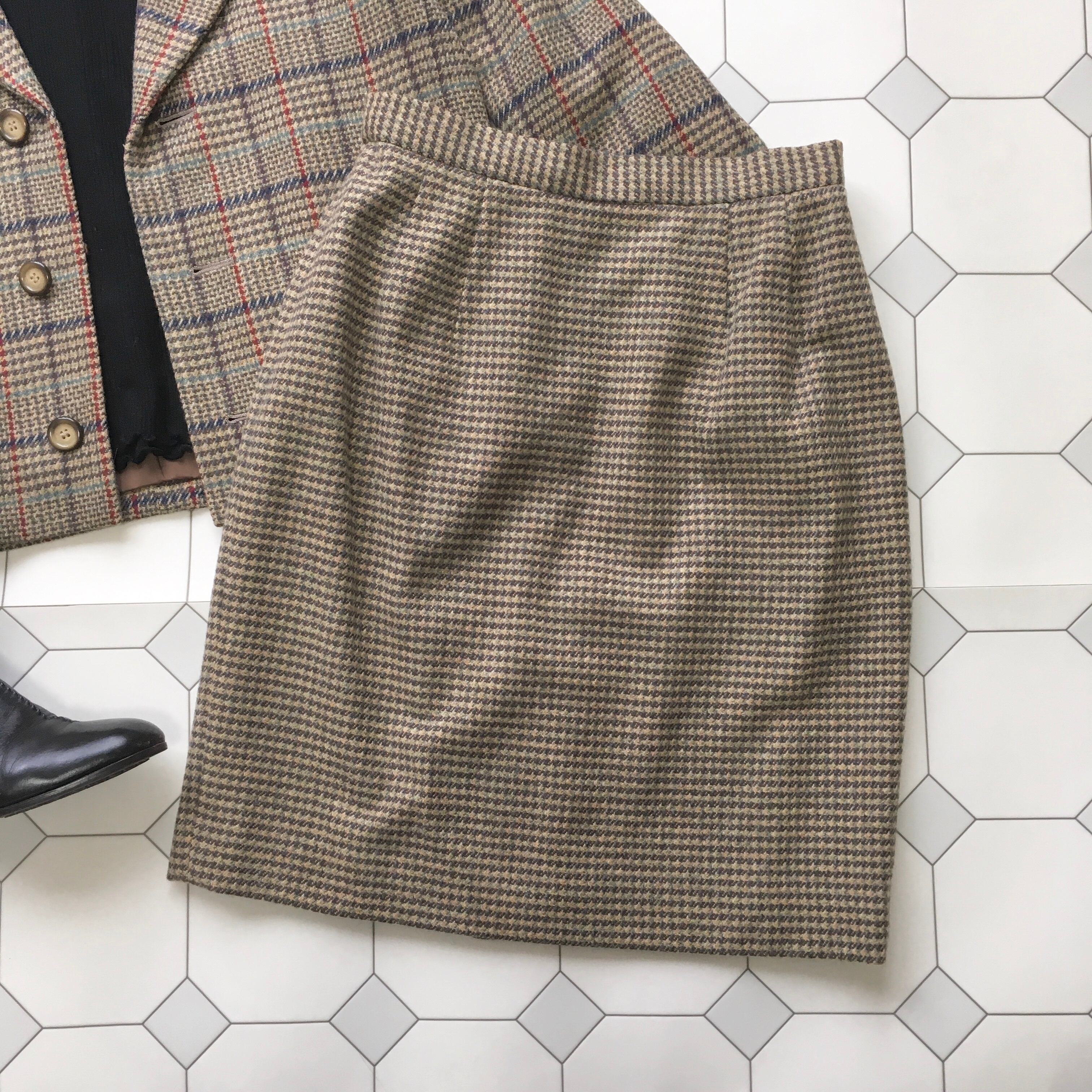 【期間限定価格】3 pieces check set up 〈レトロ古着 スリーピースチェックセットアップ ウール ジャケット タイトスカート ベスト〉
