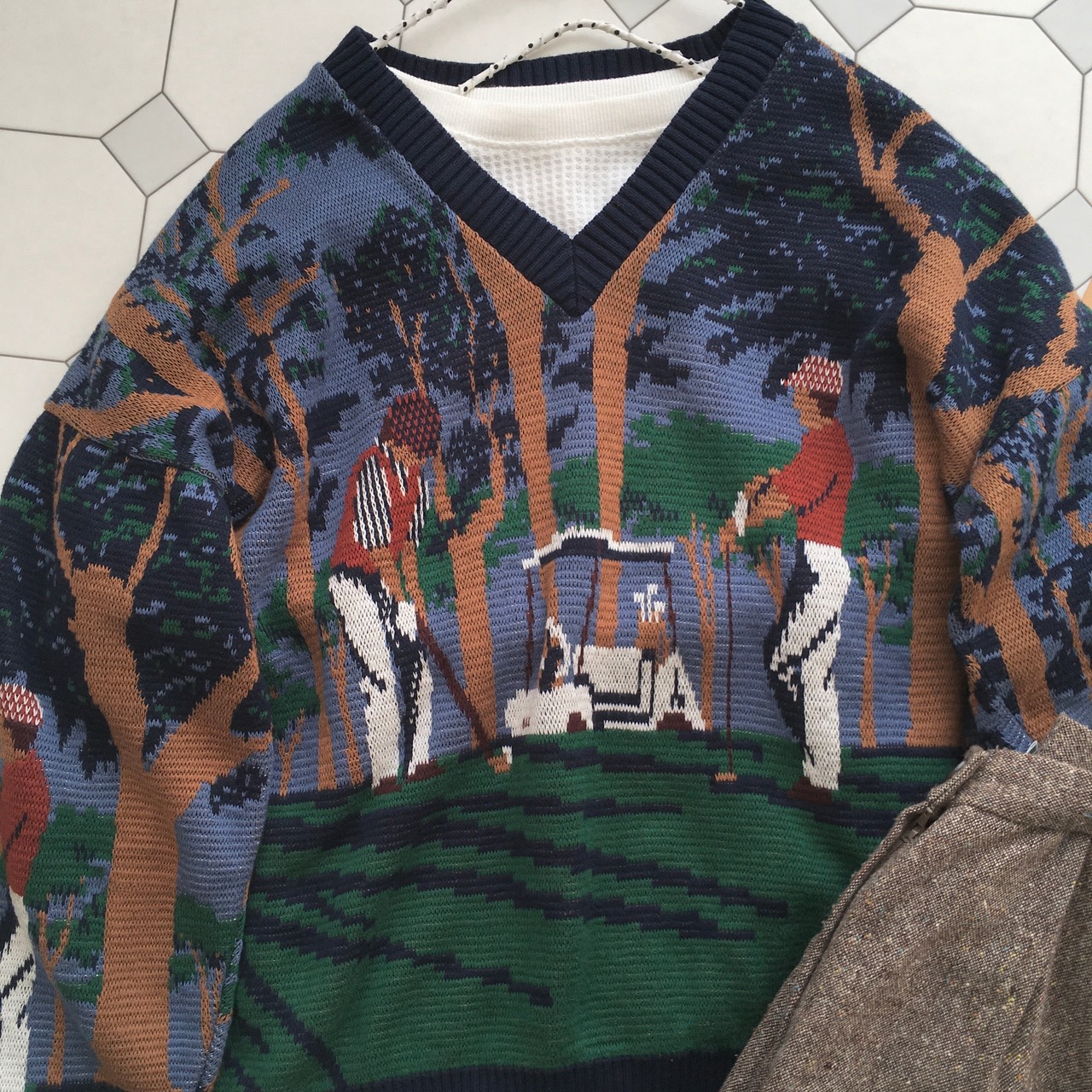 golf pattern v-neck sweater〈レトロ古着 ゴルフ柄Vネックセーター ニット〉