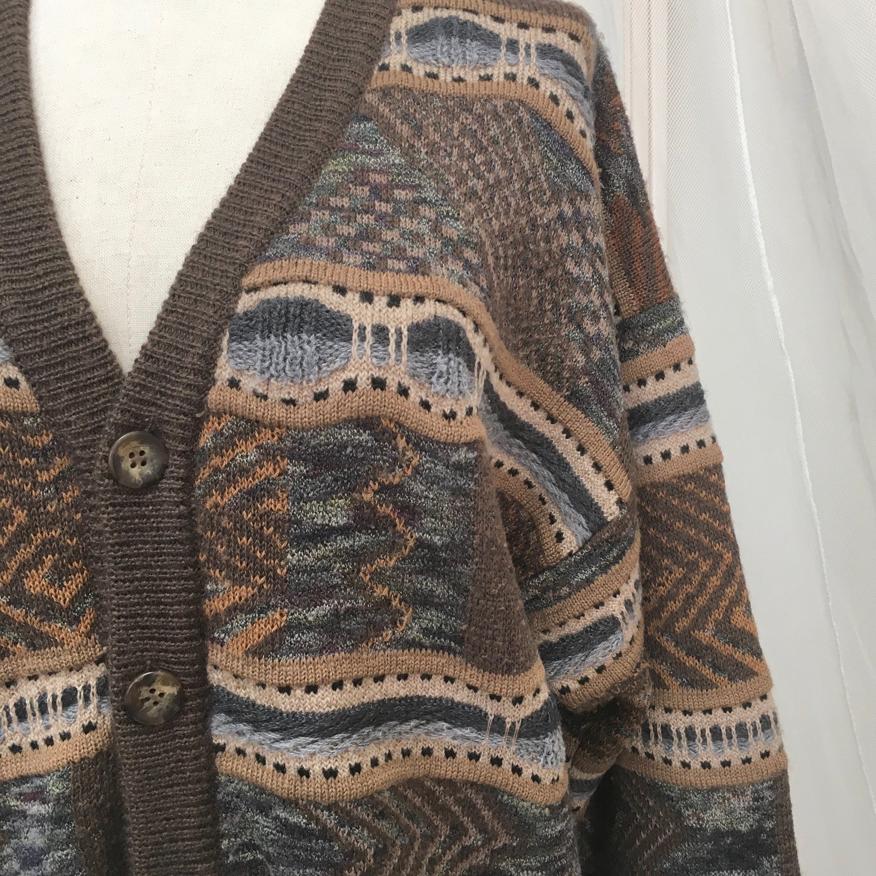 mix pattern brown cardigan〈レトロ古着 ブラウン系総柄ニットカーディガン〉