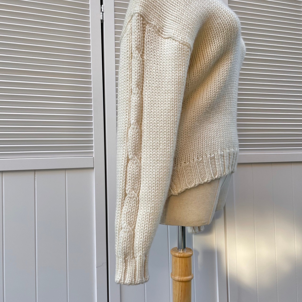 首元と袖にポイントであしらわれたケーブル編みが可愛いセーター