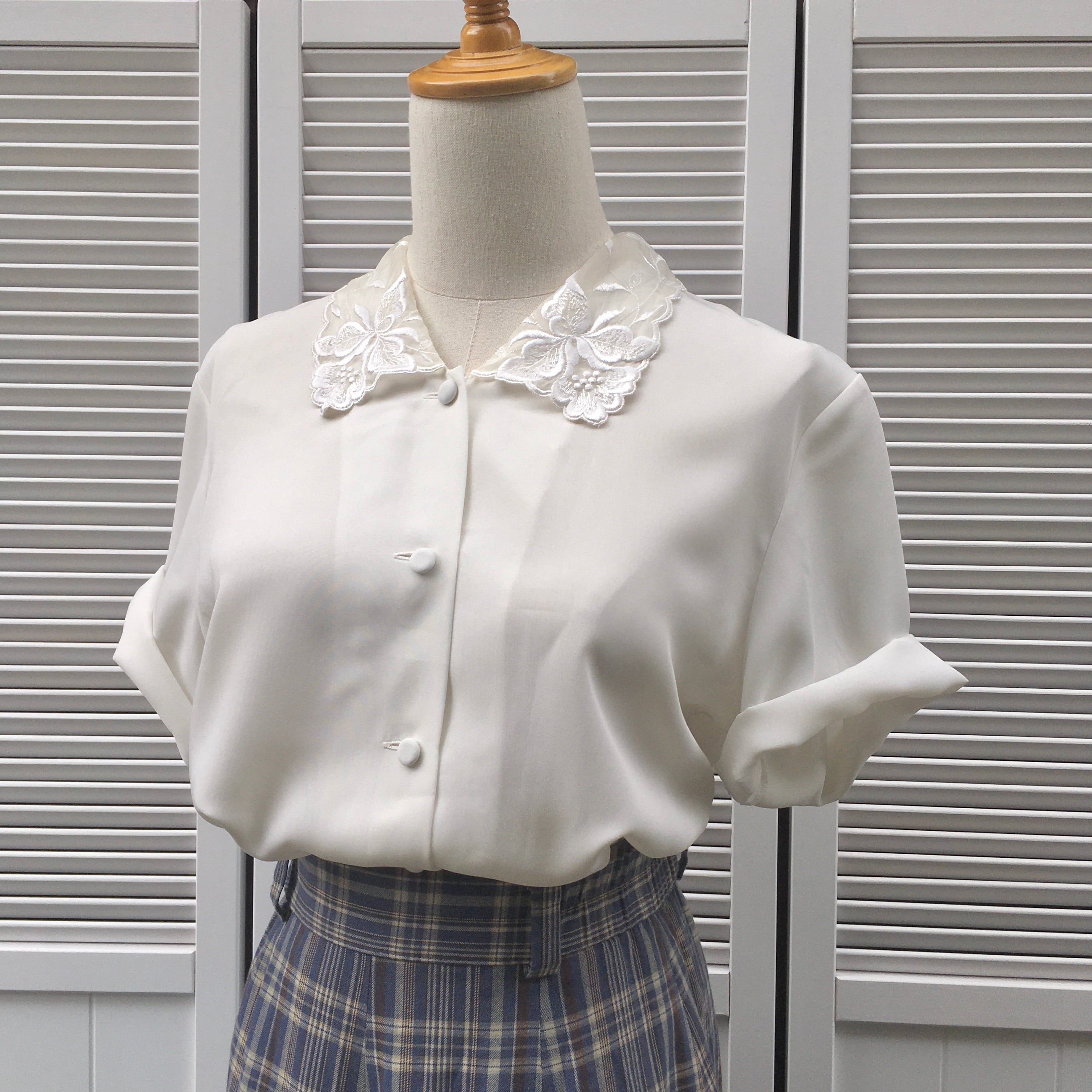 【6/10まで special price】 sheer collar embroidery white blouse 〈レトロ古着 シアー襟 刺繍ホワイトブラウス〉