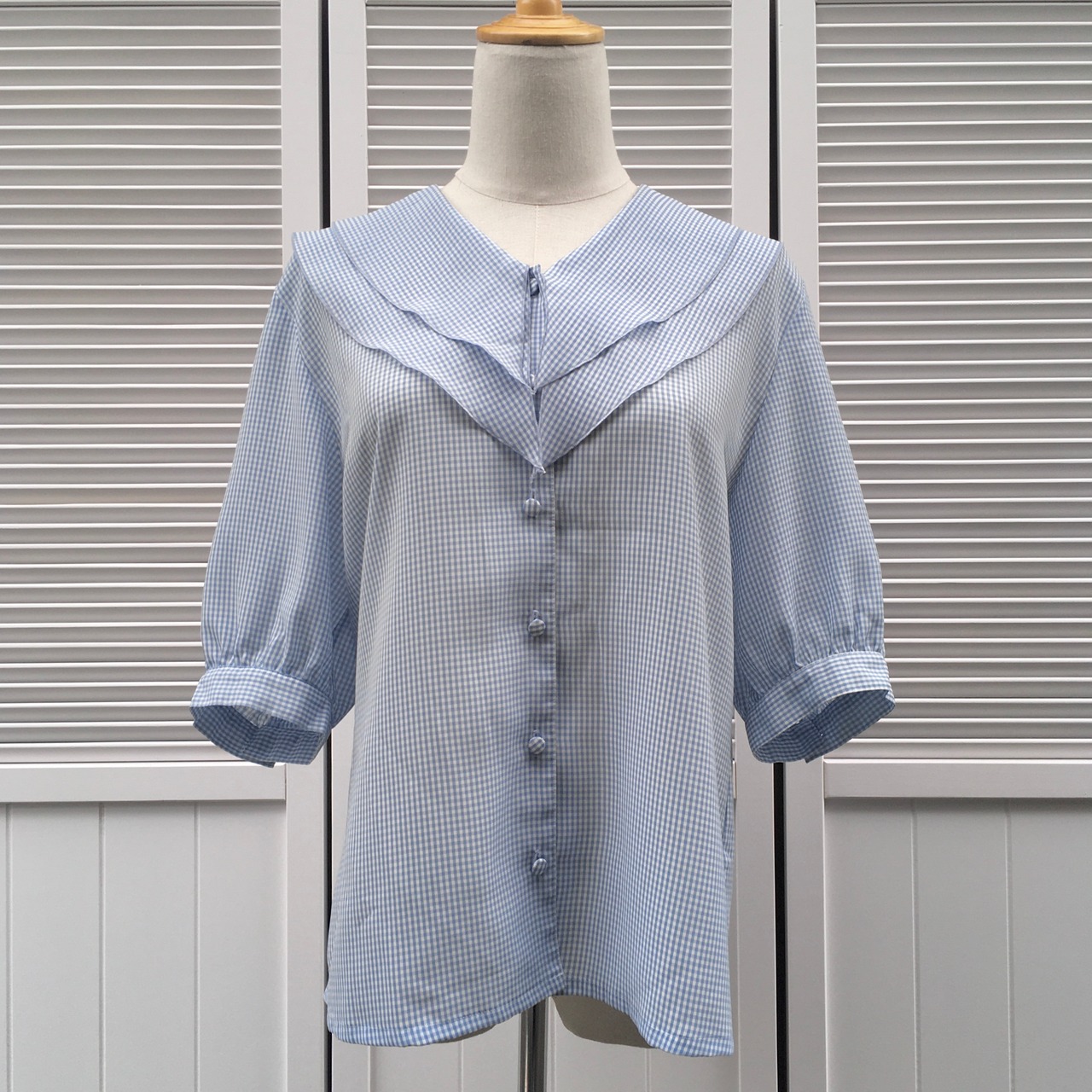 水色のギンガムチェックが爽やかなブラウス