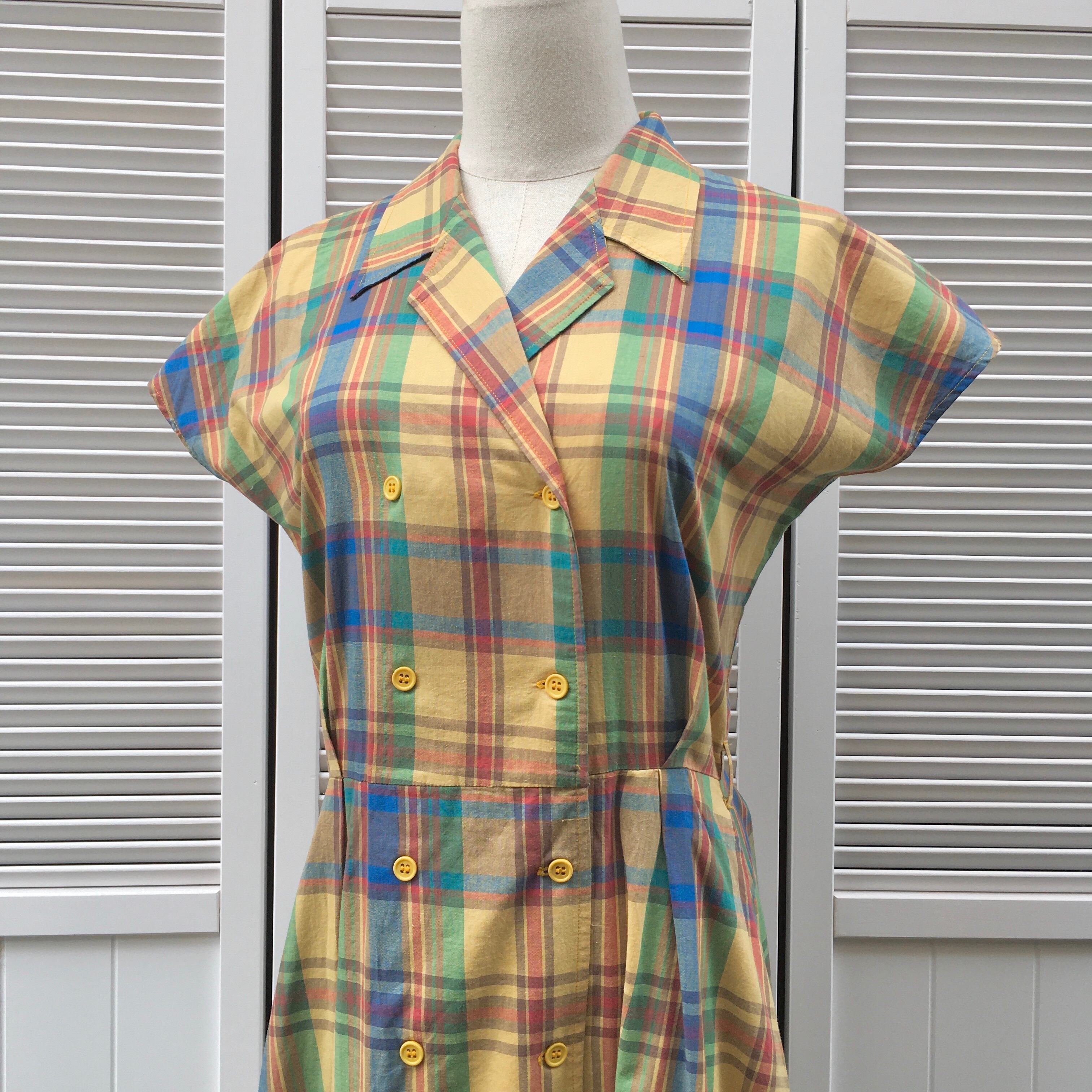 french sleeve plaid open collar dress〈レトロ古着 フレンチスリーブチェック柄開襟ワンピース〉