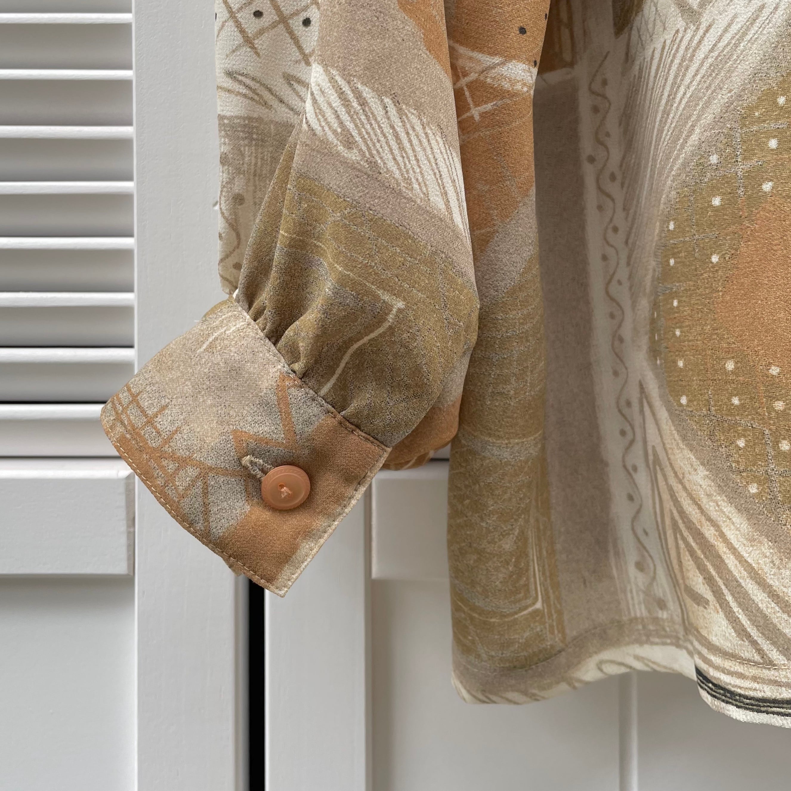 お花モチーフに丸襟、アースカラーがマイルドな雰囲気の柄シャツ