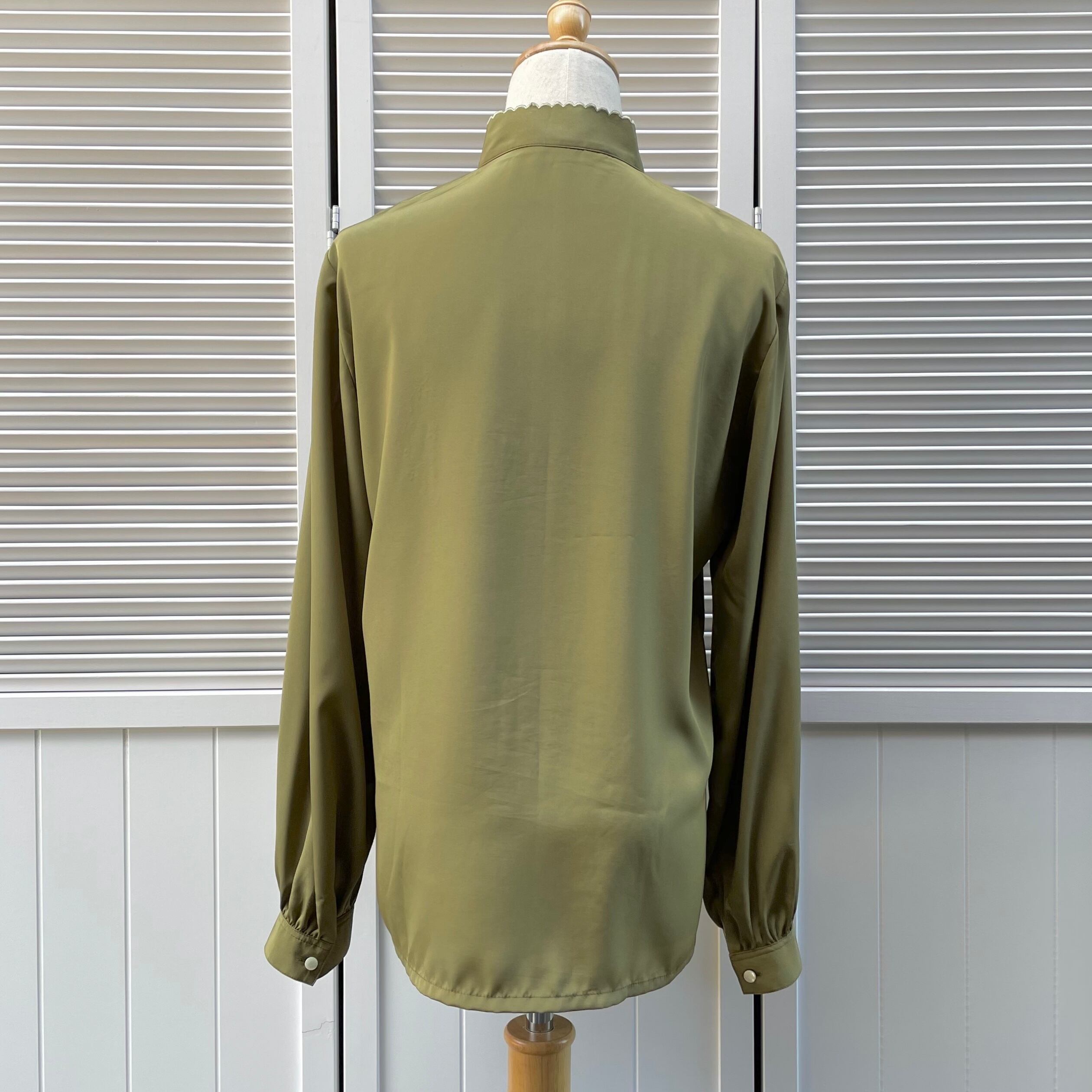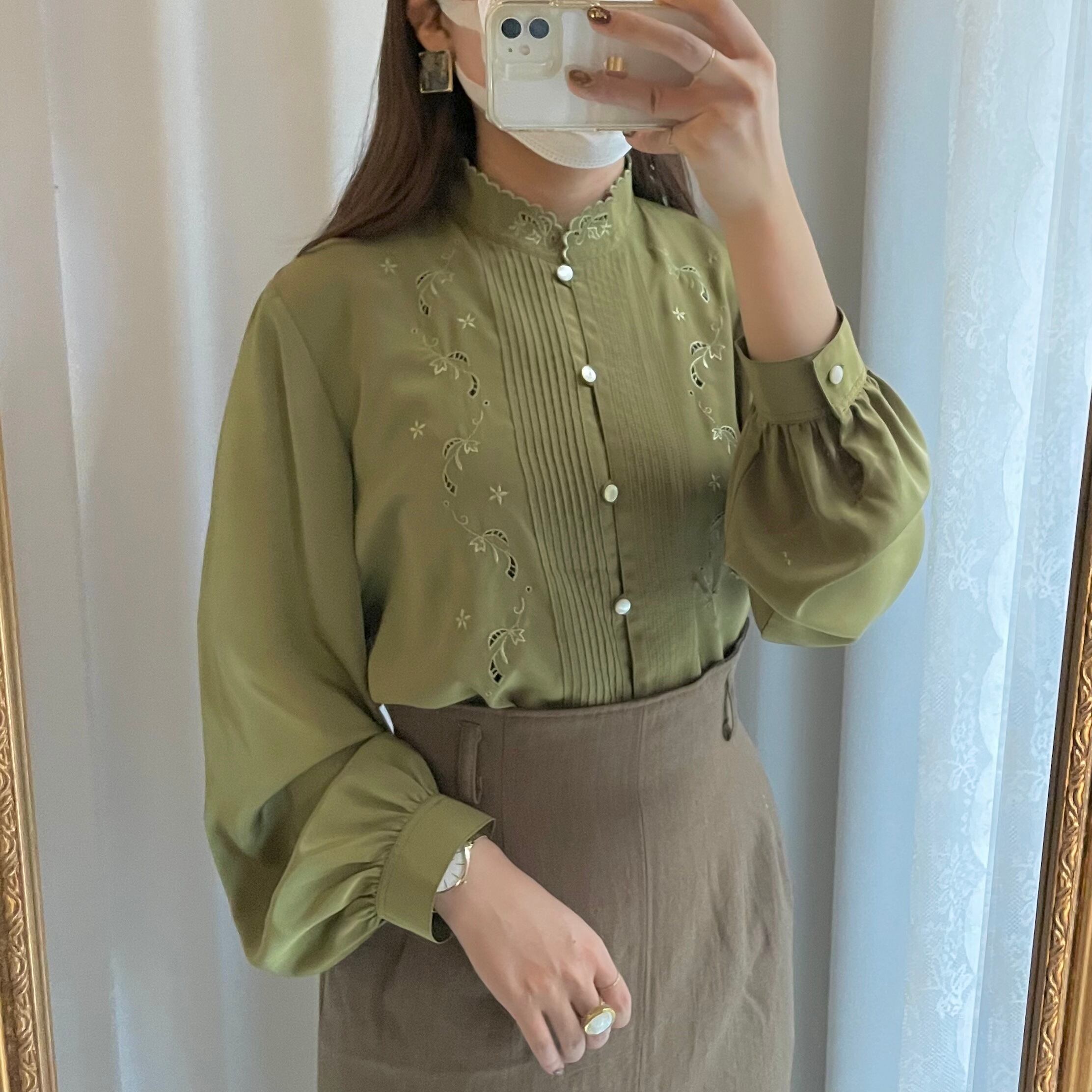 マオカラー×刺繍がチャイナな雰囲気漂うオリーブカラーのブラウス