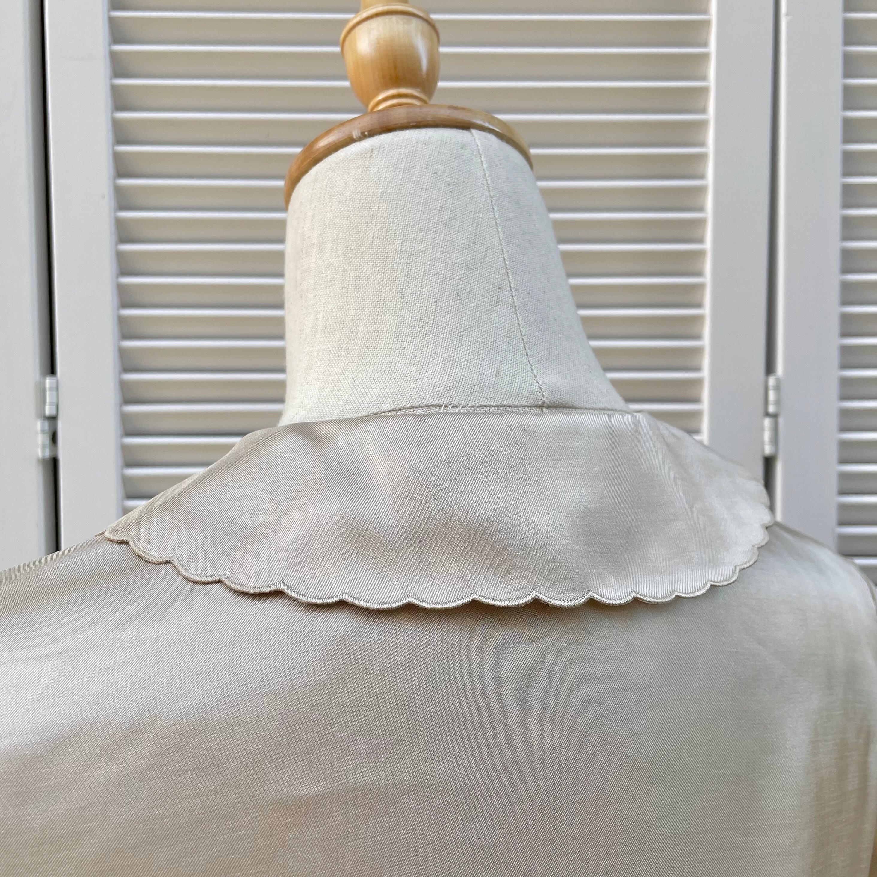 お花のカットワーク刺繍に後ろ襟のスカラップ、前立てのタックデザインなどさりげなく凝られた一着