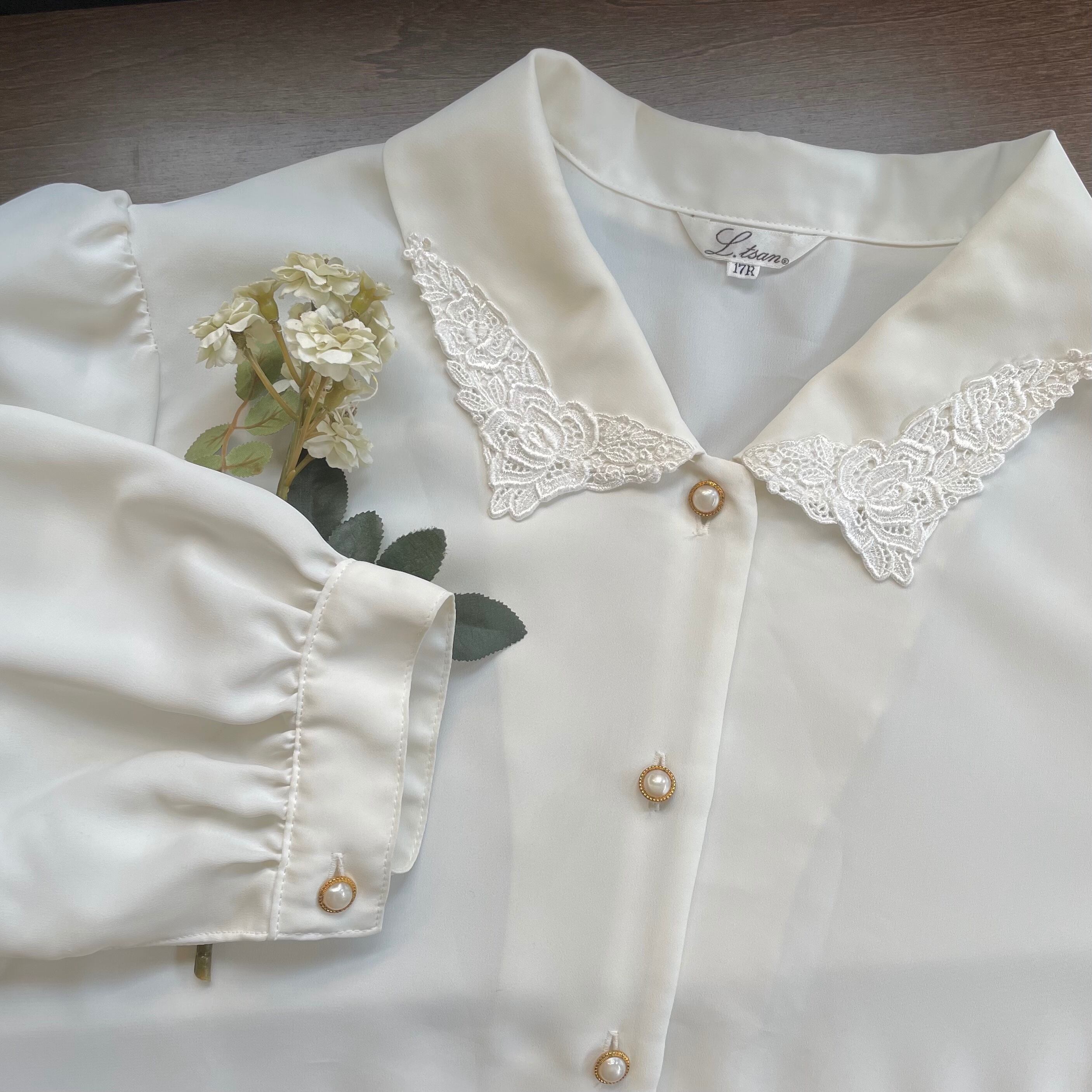 lace collar pearl button blouse 〈レトロ古着 レース襟パールボタンブラウス パフスリーブ〉