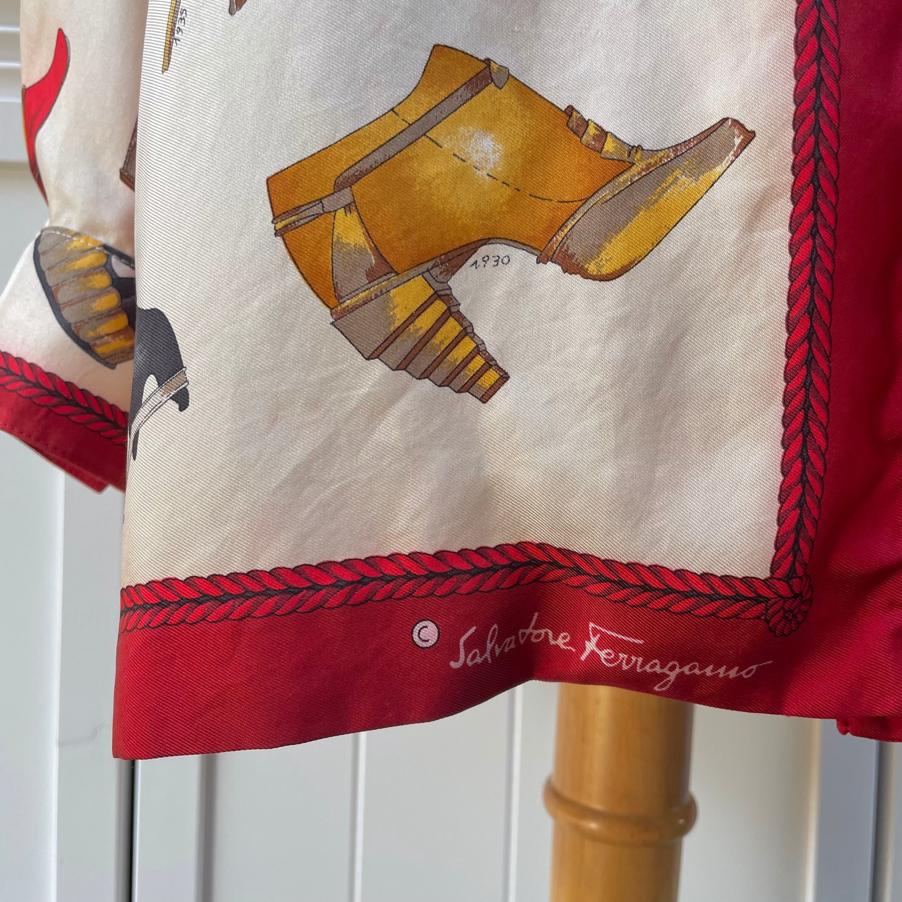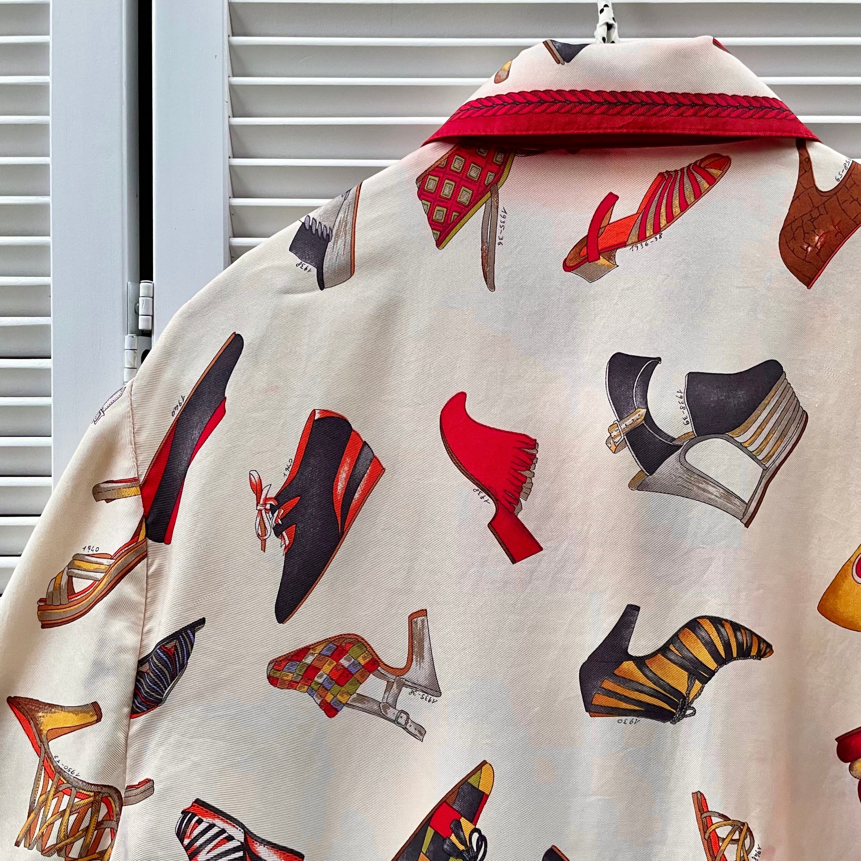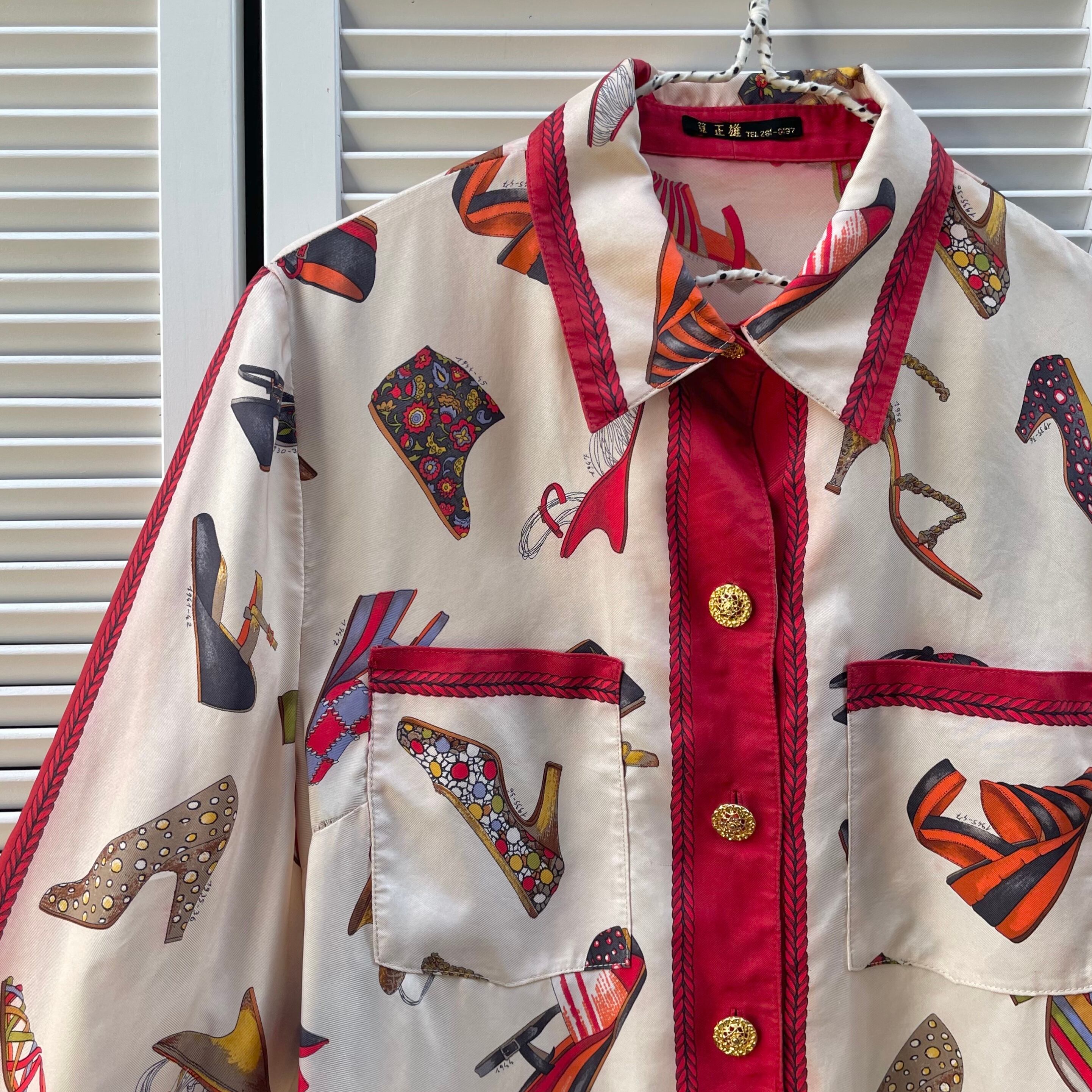 high heels print shirt〈レトロ古着 ヒール柄シャツ 大柄 金ボタン 赤〉