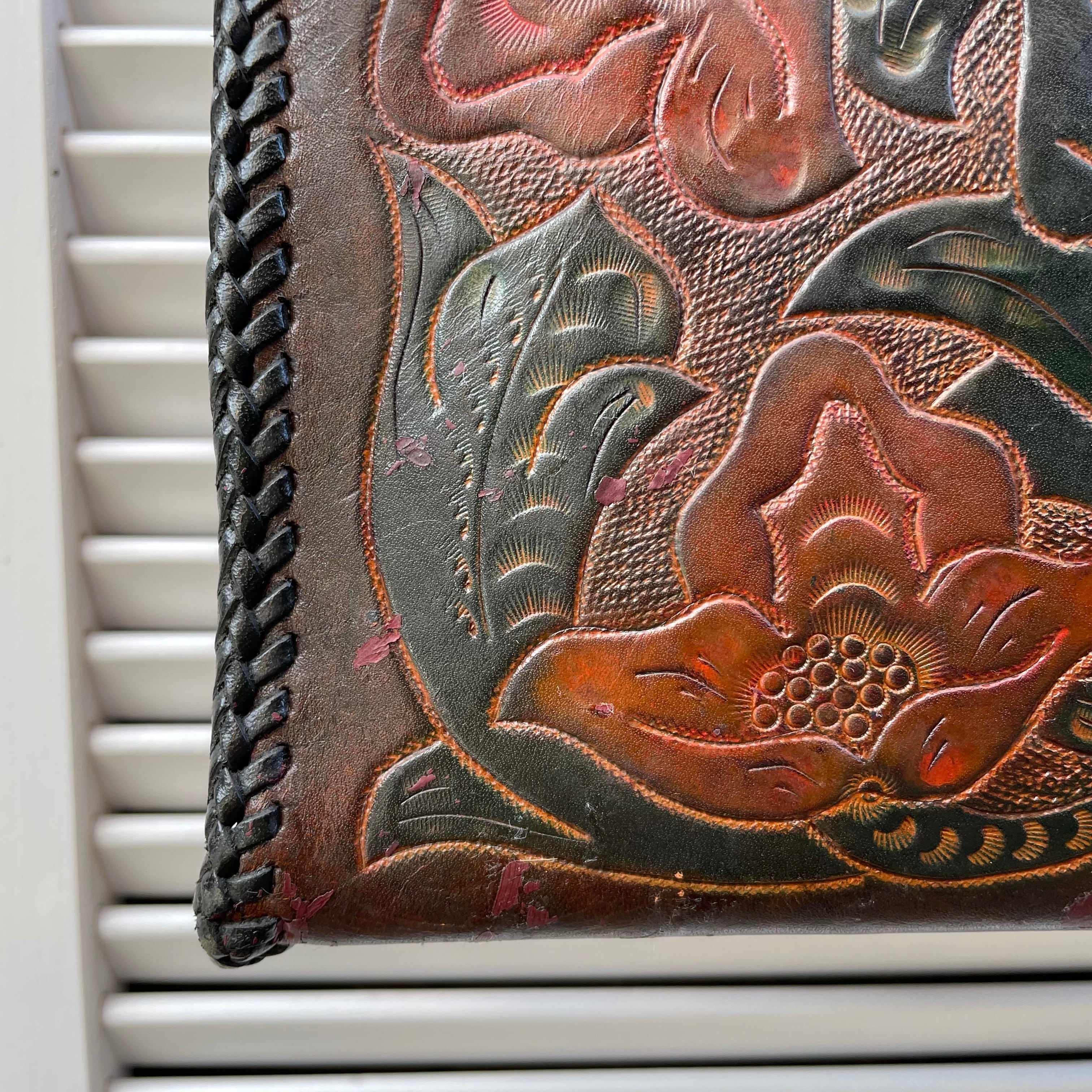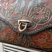 味のあるリアルレザーにカービングが目を引くハンドバッグ