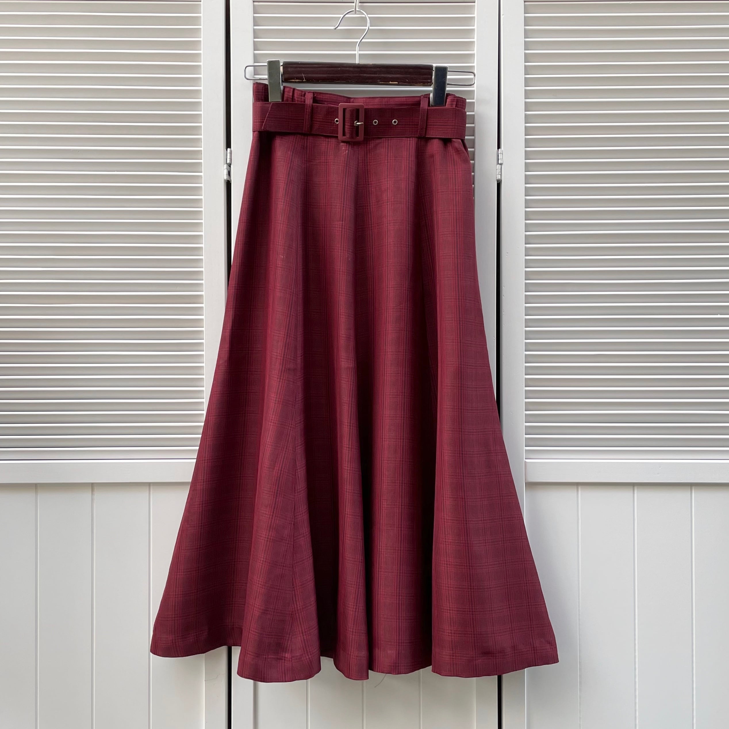 self-belt red plaid flared skirt 〈レトロ古着 ベルト付き赤チェックフレアスカート チェック柄〉