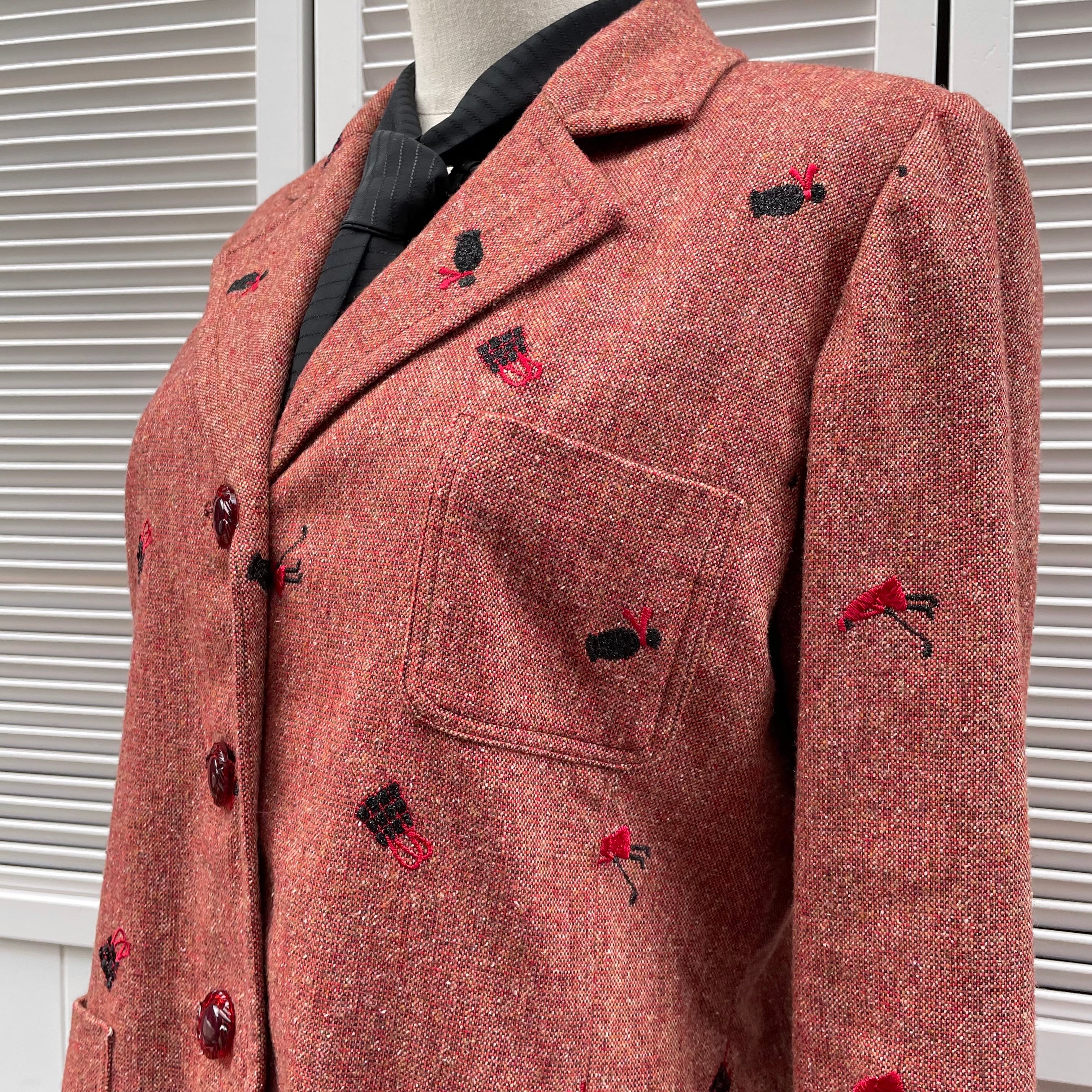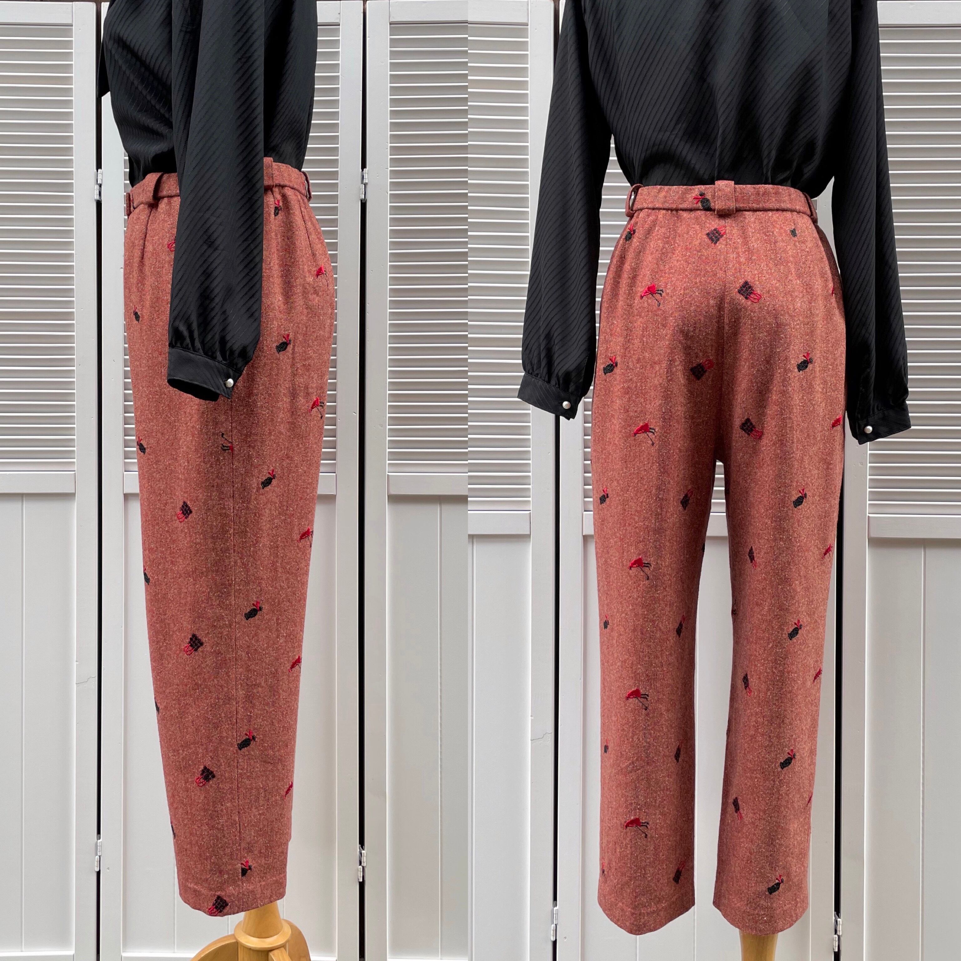 lady motif embroidery tweed setup〈レトロ古着 レディモチーフ刺繍 ツイードセットアップ ジャケット パンツ〉