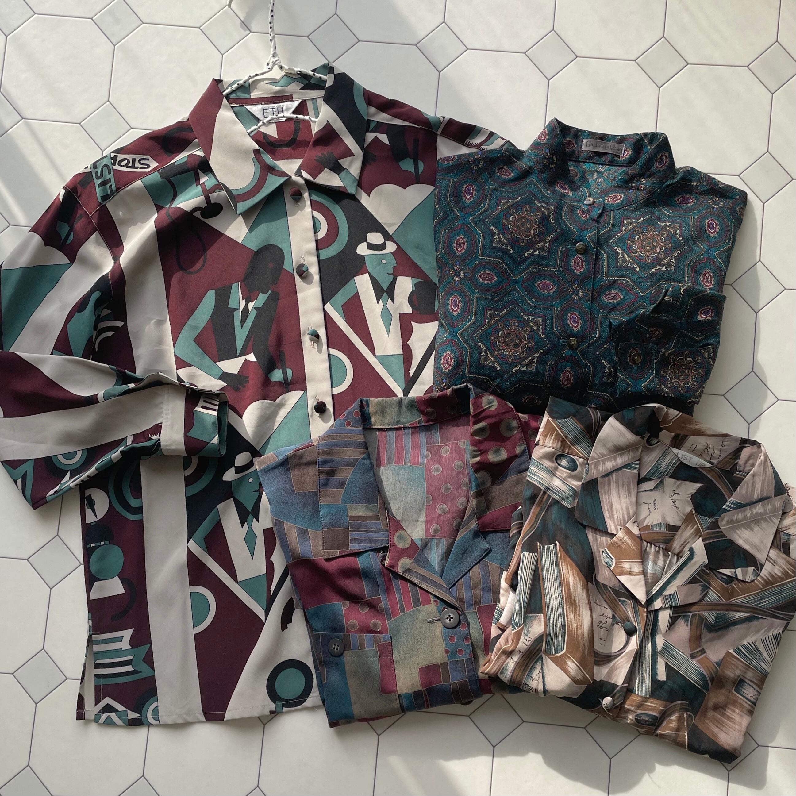 oriental band collar shirt 〈レトロ古着 オリエンタル バンドカラー 柄シャツ グリーン〉