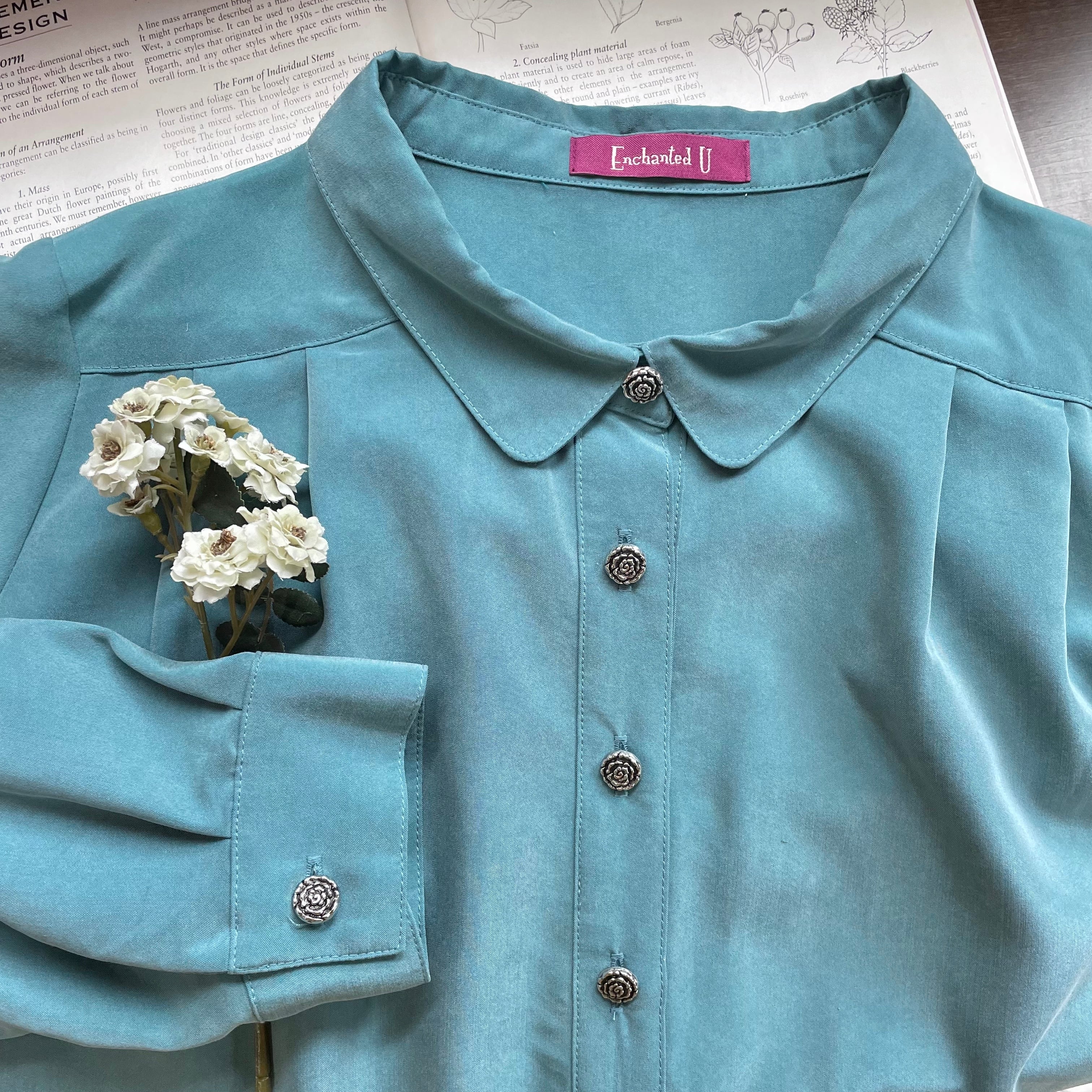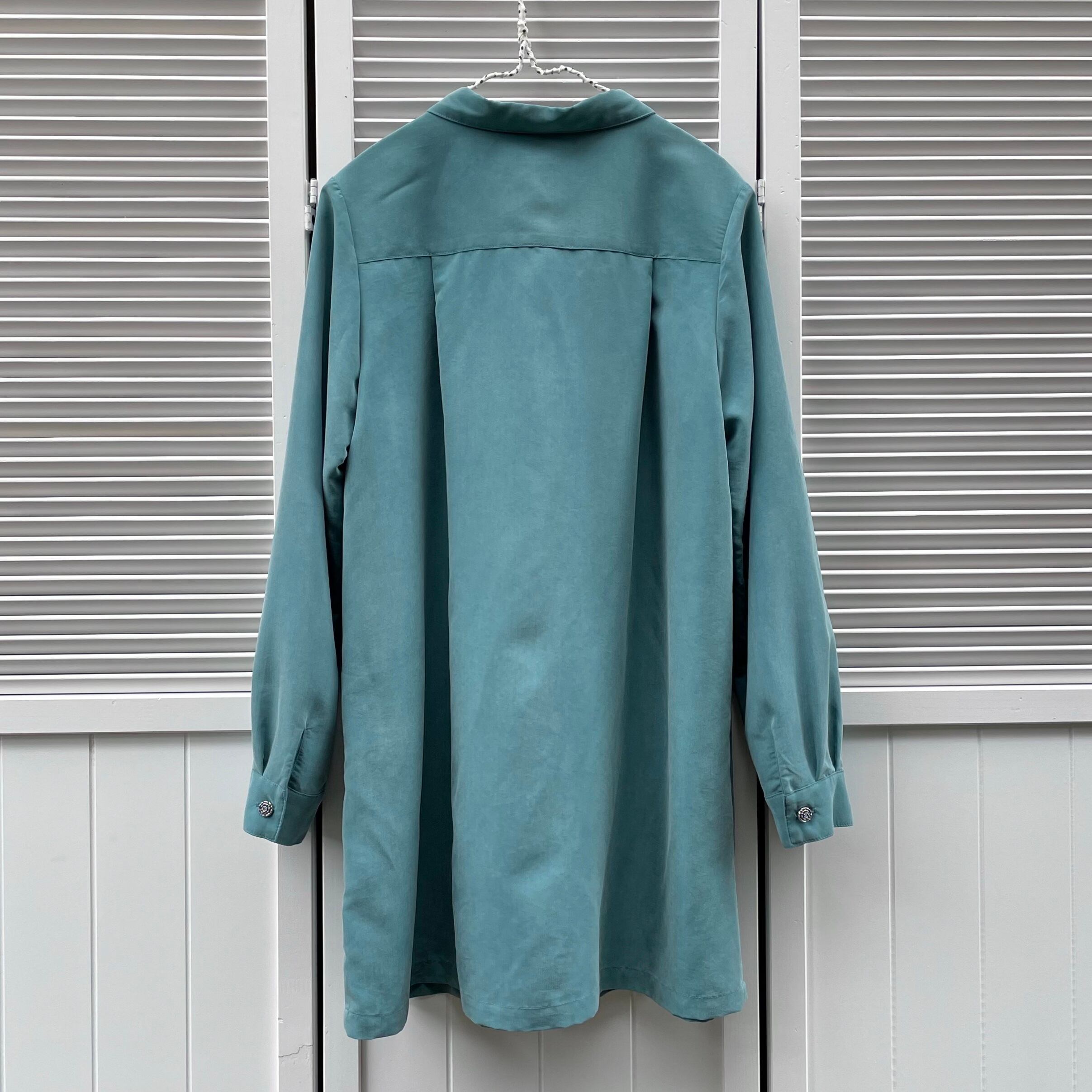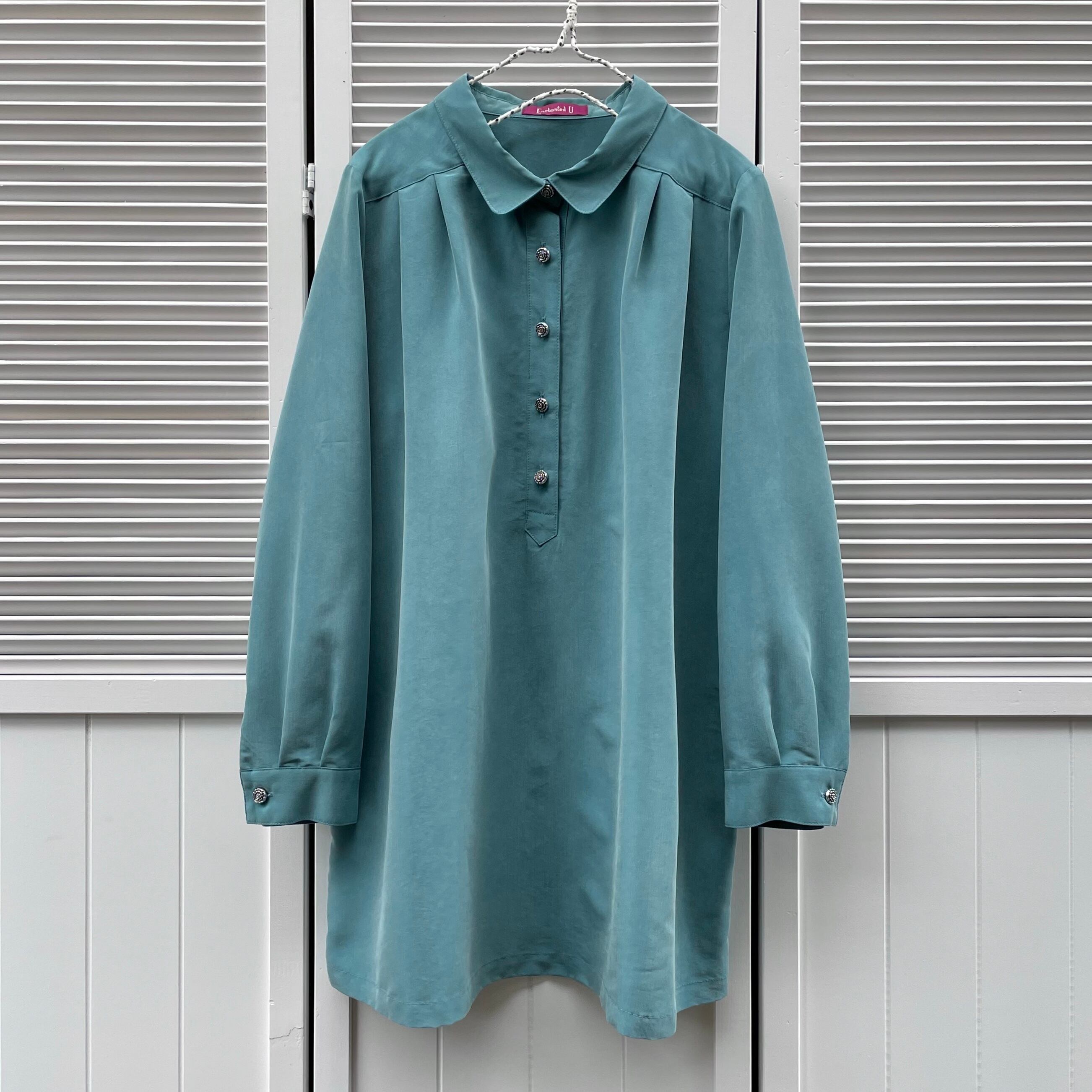 rose button turquoise tunic〈レトロ古着 薔薇ボタン ターコイズブルー チュニック ブラウス 日本製〉