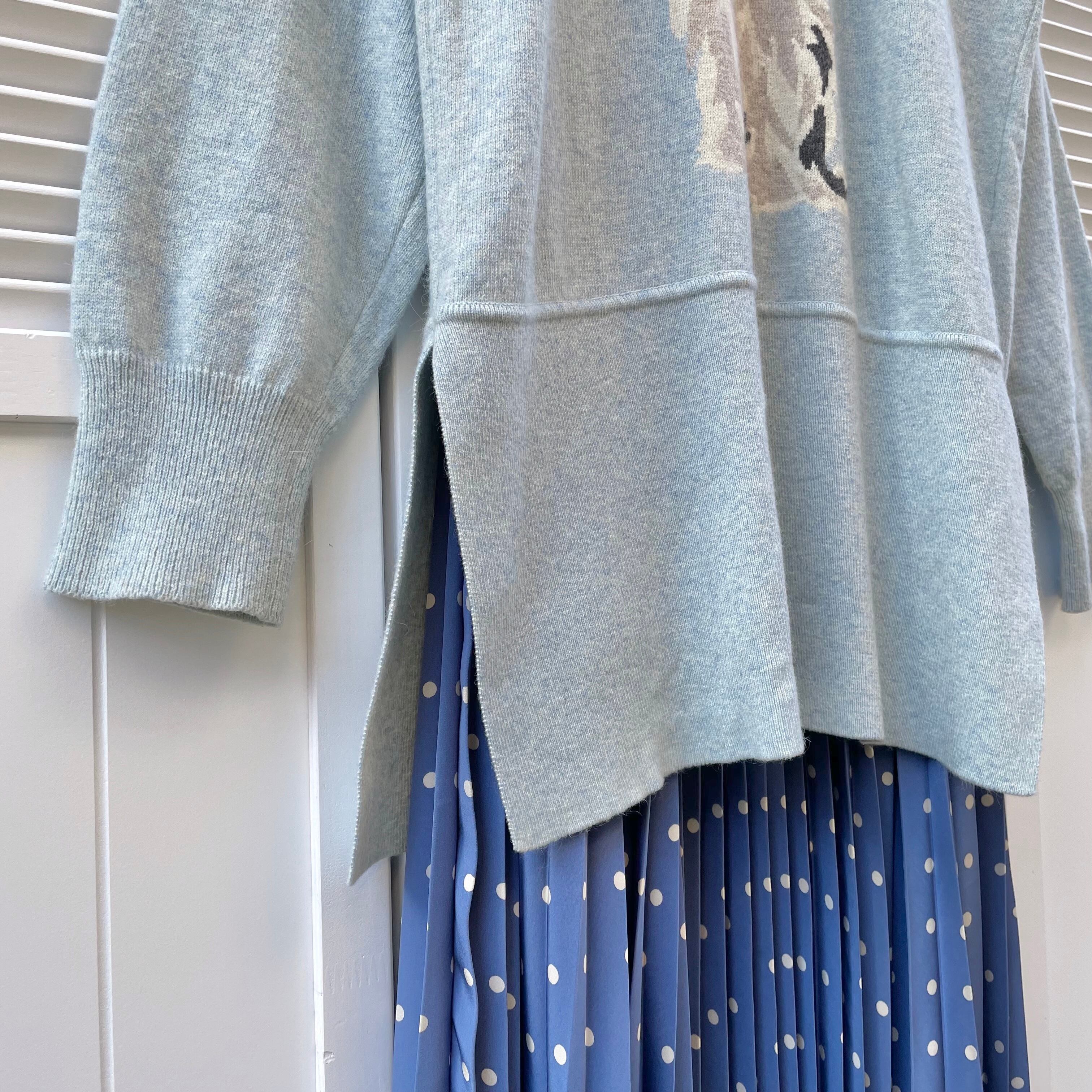 ワンちゃんが大きく描かれたペールブルーの春ニット