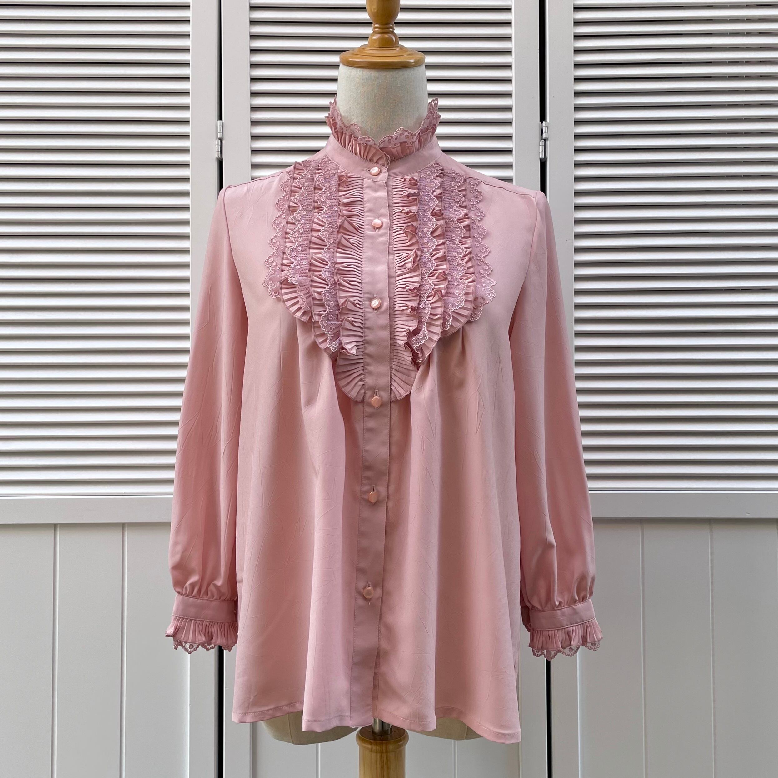 lace × pleated frill blouse 〈レトロ古着 レース × プリーツフリルブラウス フリルネック ピンク 日本製〉