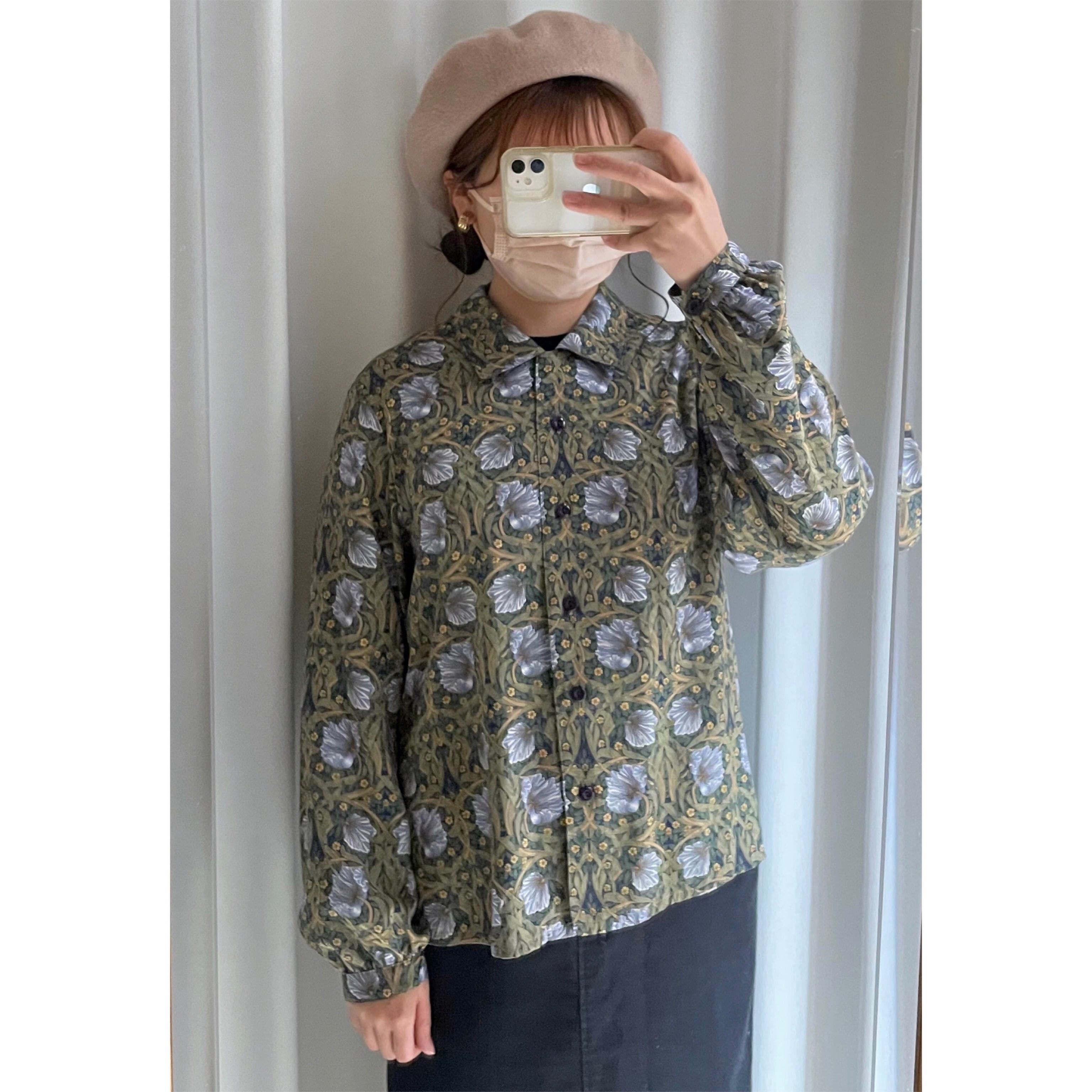 William Morris “Pimpernel” pattern shirt〈レトロ古着 ウィリアム・モリス “ピンパーネル” 柄シャツ ブラウス 日本製 ブルー グリーン〉