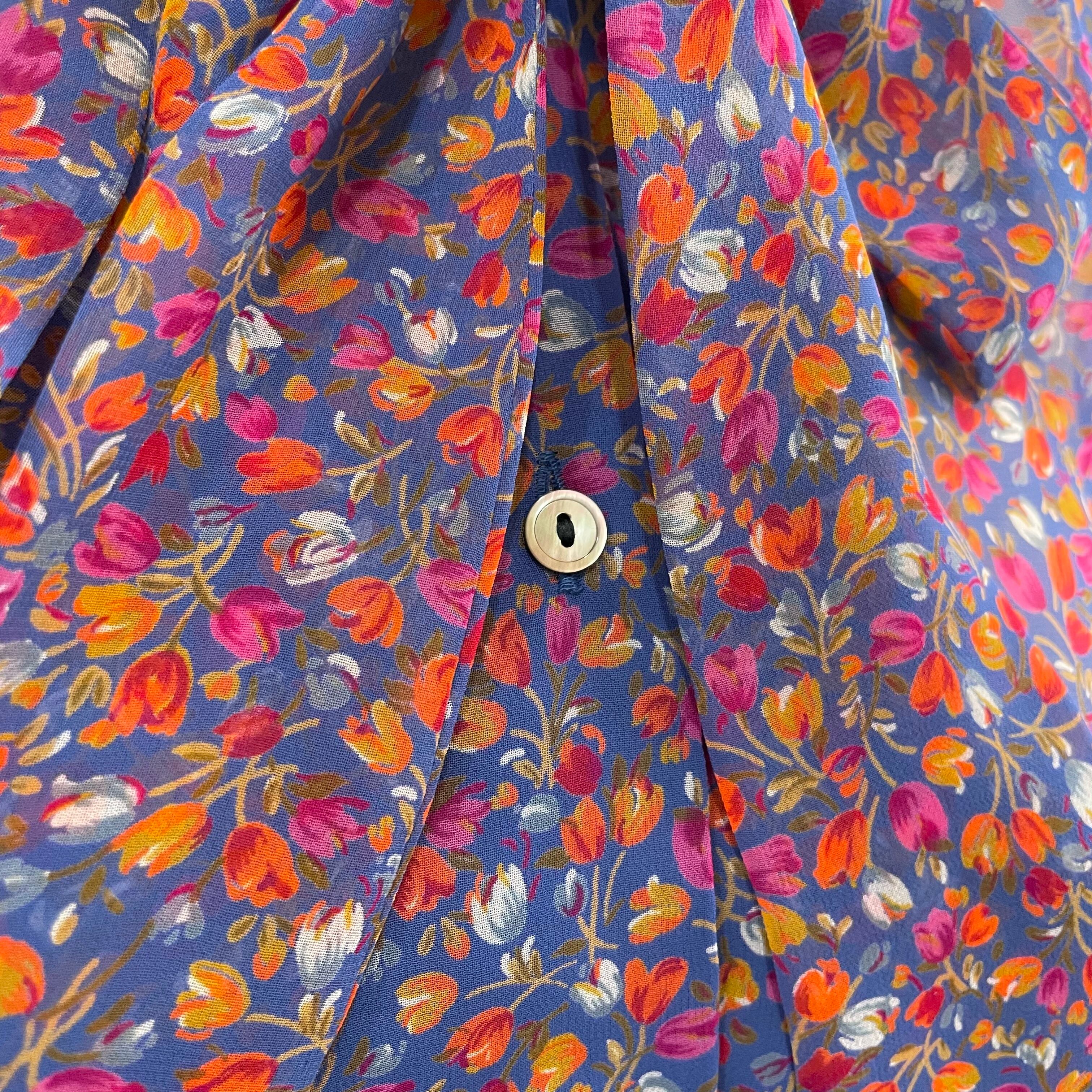 tulip motif sheer bowtie blouse〈レトロ古着 チューリップ柄 シアーボウタイブラウス マルチカラー ブルー〉