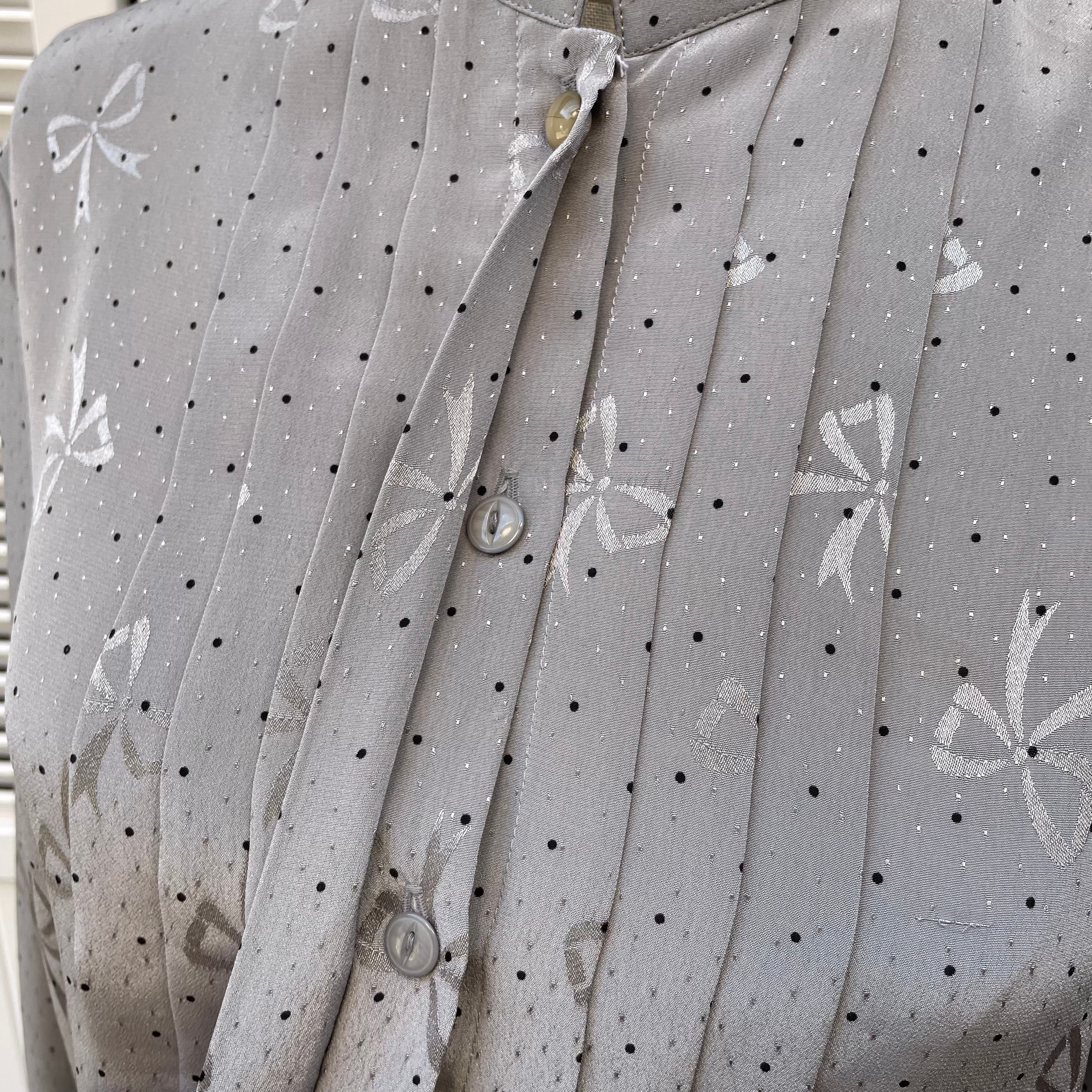 ribbon & dot stand collar blouse〈レトロ古着 リボン&ドット柄 スタンドカラーブラウス グレー〉