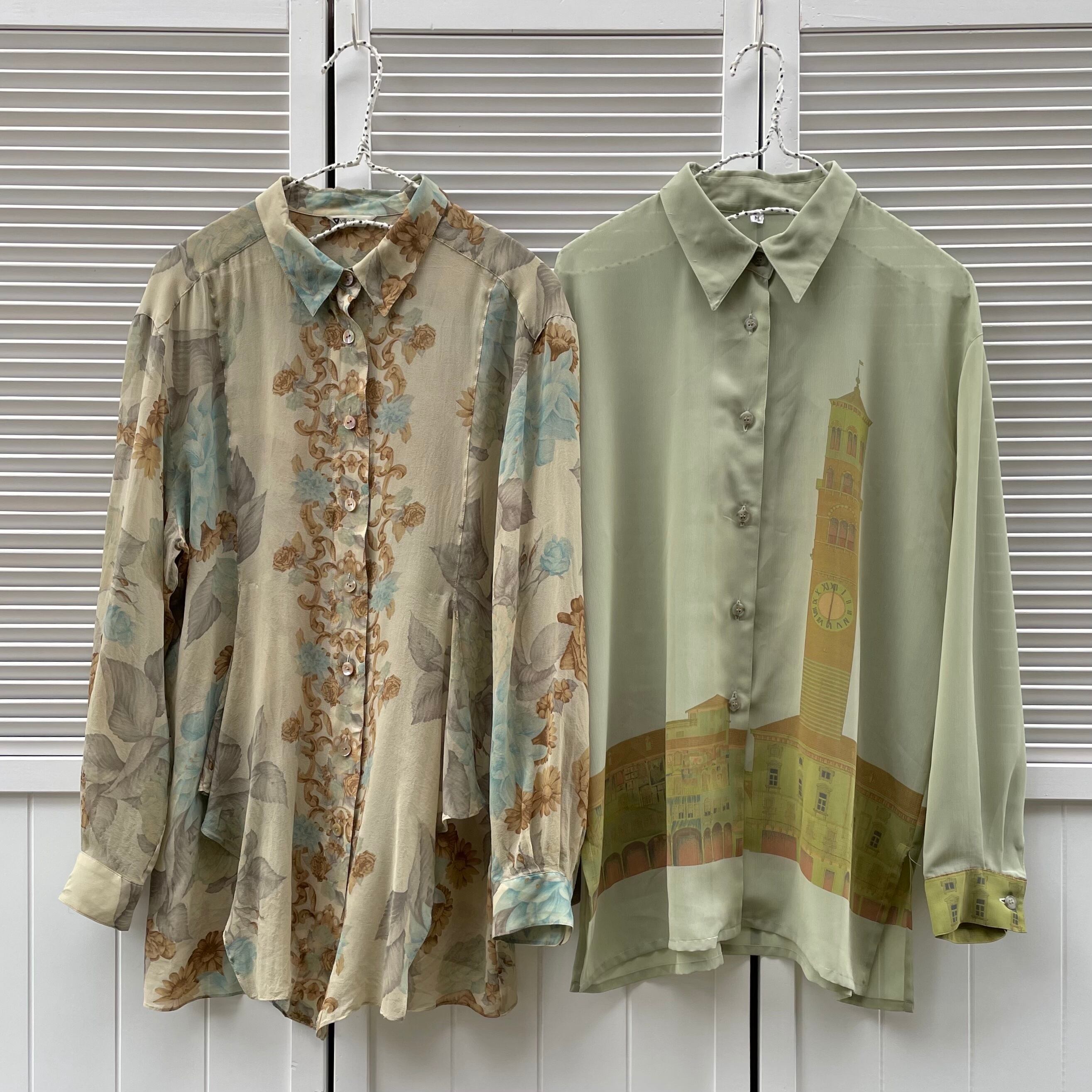 clock tower print sheer shirt〈レトロ古着 時計台プリント シアーシャツ ミントグリーン 日本製〉
