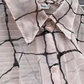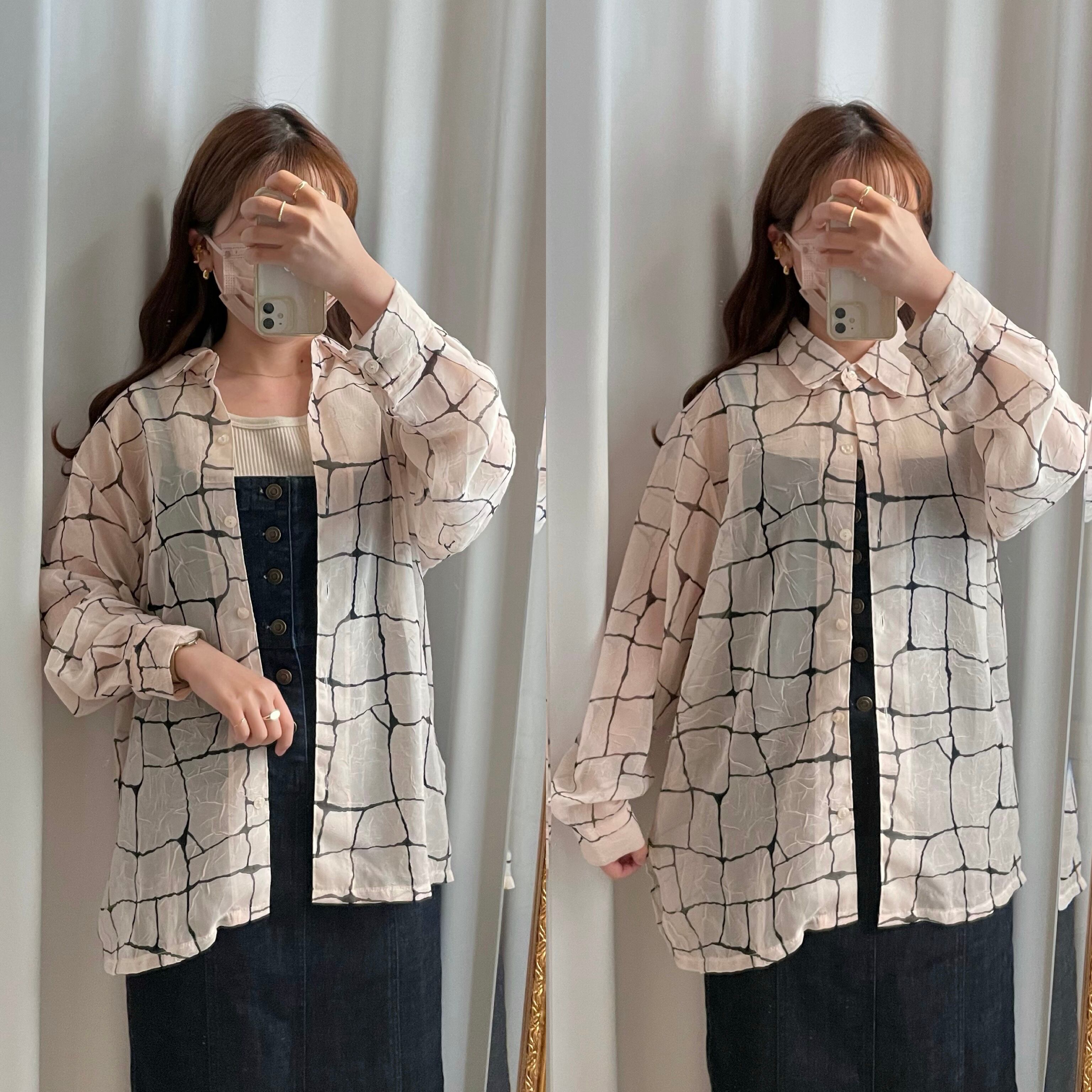 淡いピンクに、ニュアンスのある手書き風の柄とシワ加工の素材が絶妙なシアーシャツ