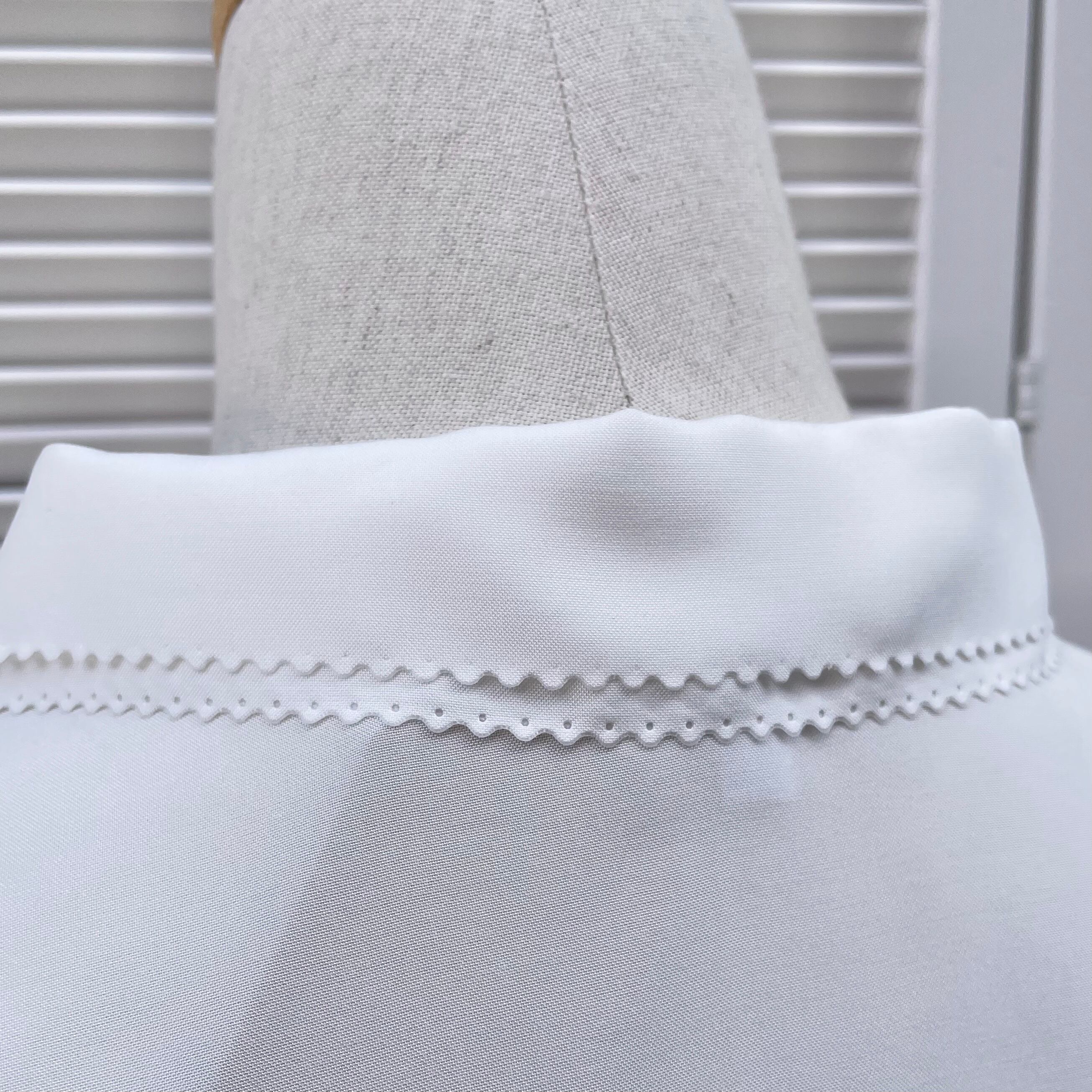 襟に薔薇のエンボス加工が施されたホワイトブラウス
