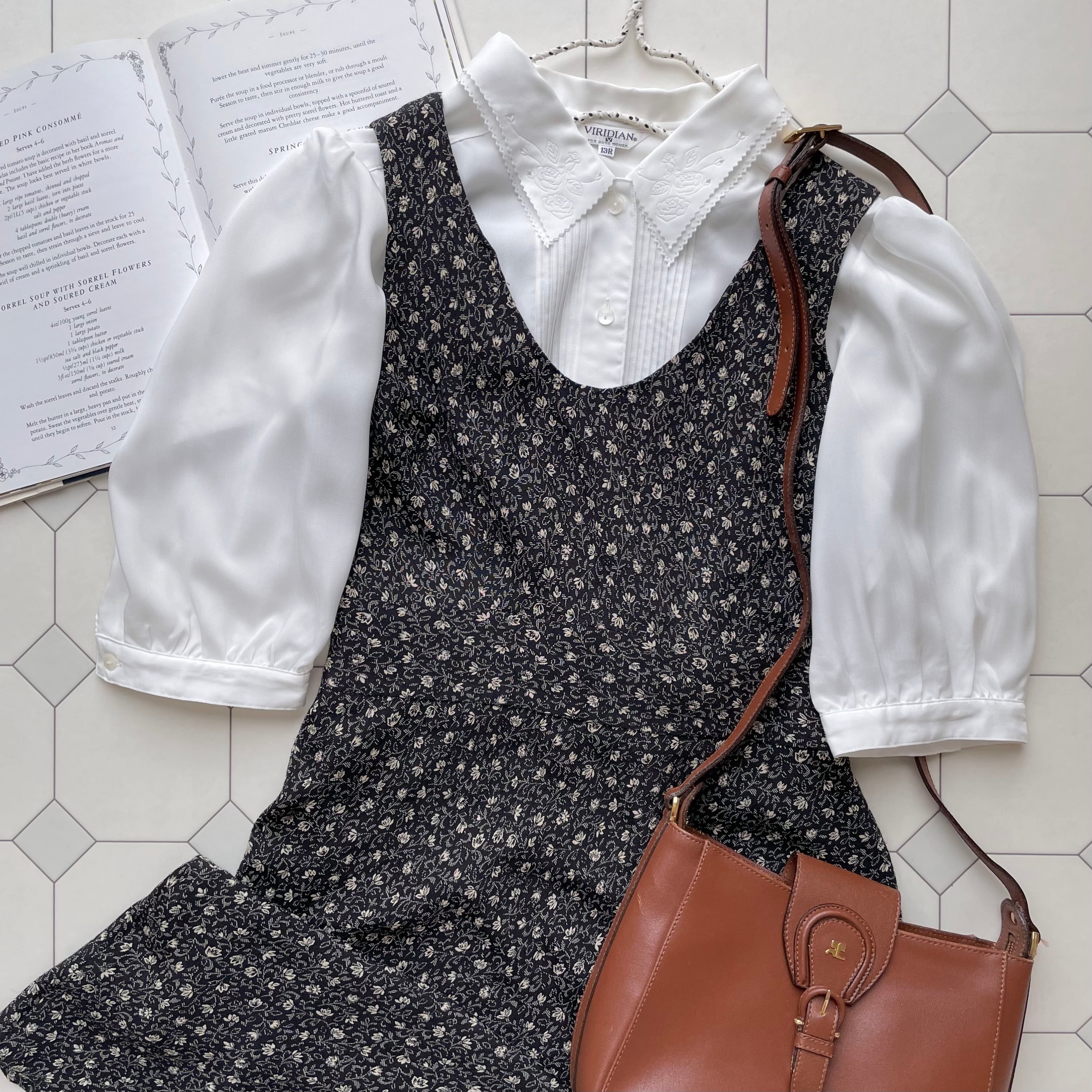 jacquard tight jumper skirt〈レトロ古着 ジャガード タイトジャンパースカート ワンピース 花柄 黒 ブラック〉