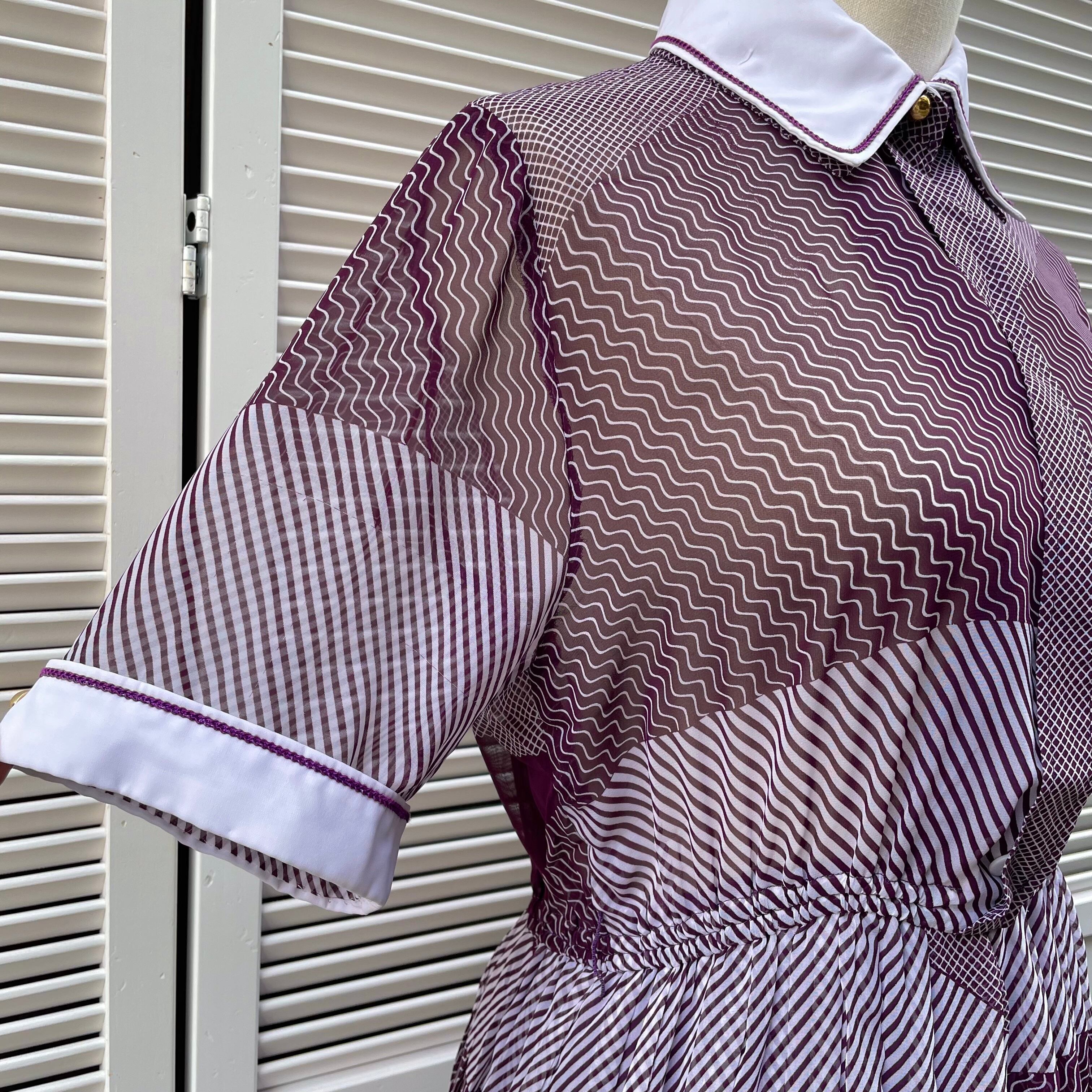 パープルを基調に、ストライプや格子・なみなみなど様々な柄が組み合わされたテキスタイルのワンピース